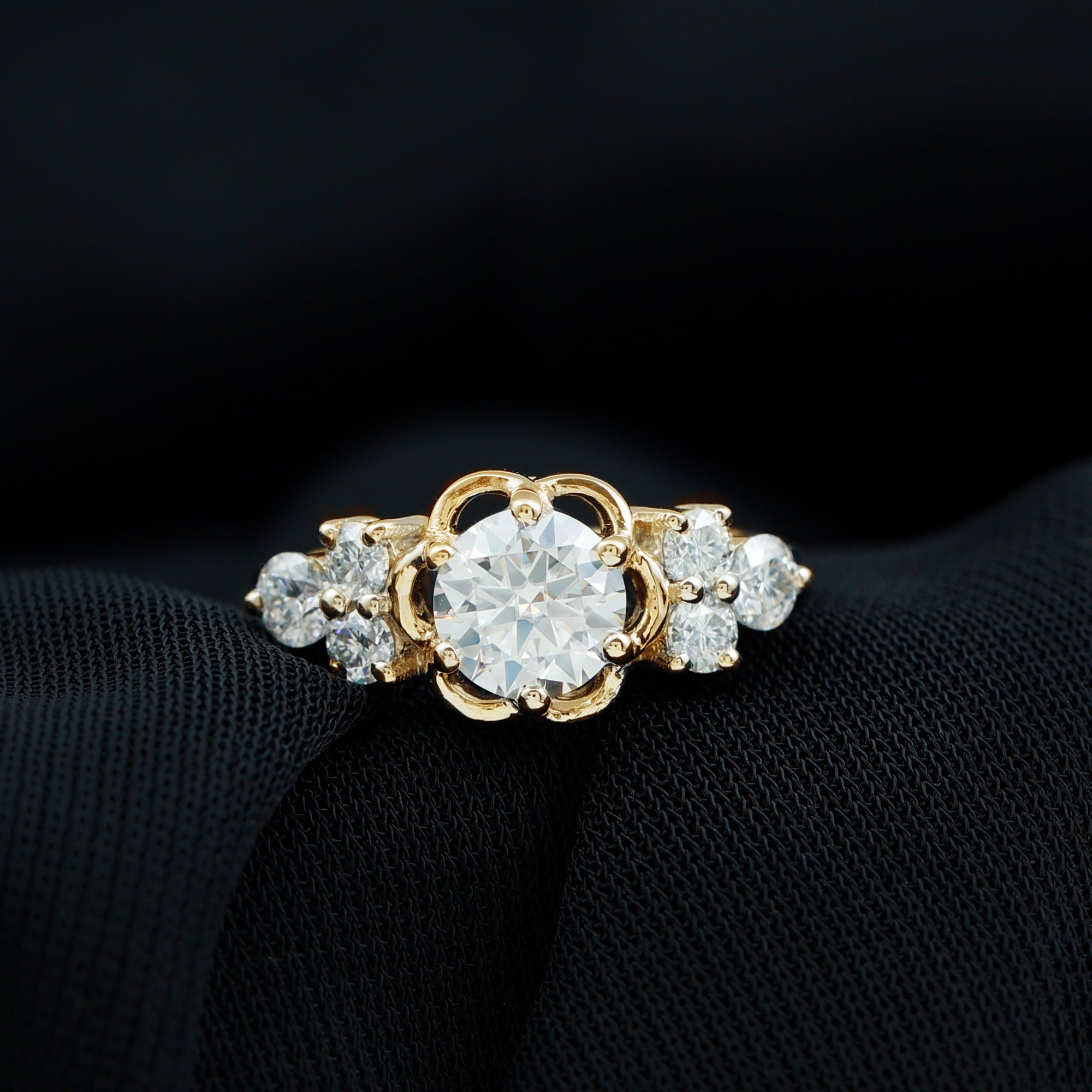 Celebrate love in full bloom with this enchanting Flower Engagement Ring, thoughtfully designed to capture the gentle beauty of heartfelt moments. At the center of this romantic piece glows a brilliant 6 MM round cut moissanite, cradled in secure prong setting. Inspired by floral elegance, the design features a flower frame surrounding the main gem that adds charm and delicacy to the rings look. On each side of the center stone, dainty trios of moissanite stones shimmer like drops of light, symbolizing the past, present, and future of your promise. Their sparkle adds a graceful balance to the design, while the soft curves of the band bring a sense of flow and harmony. Every stone in this Moissanite Engagement Ring is offering the brilliance and fire of fine jewelry with a more thoughtful, sustainable choice. The D-VS1 quality moissanites ensure crystal clarity and radiant shine, making this piece a standout in both sentiment and style. Whether you are sealing a promise, expressing love, or gifting a meaningful piece, this Moissanite Flower Ring tells a story of connection and care. Crafted with attention to detail and a modern heart, this 1 CT Moissanite Ring arrives in an elegant jewelry box, making it perfect for keeping or gifting. With floral charm and a timeless design, it is a ring meant not just to wear, but to remember, forever.
