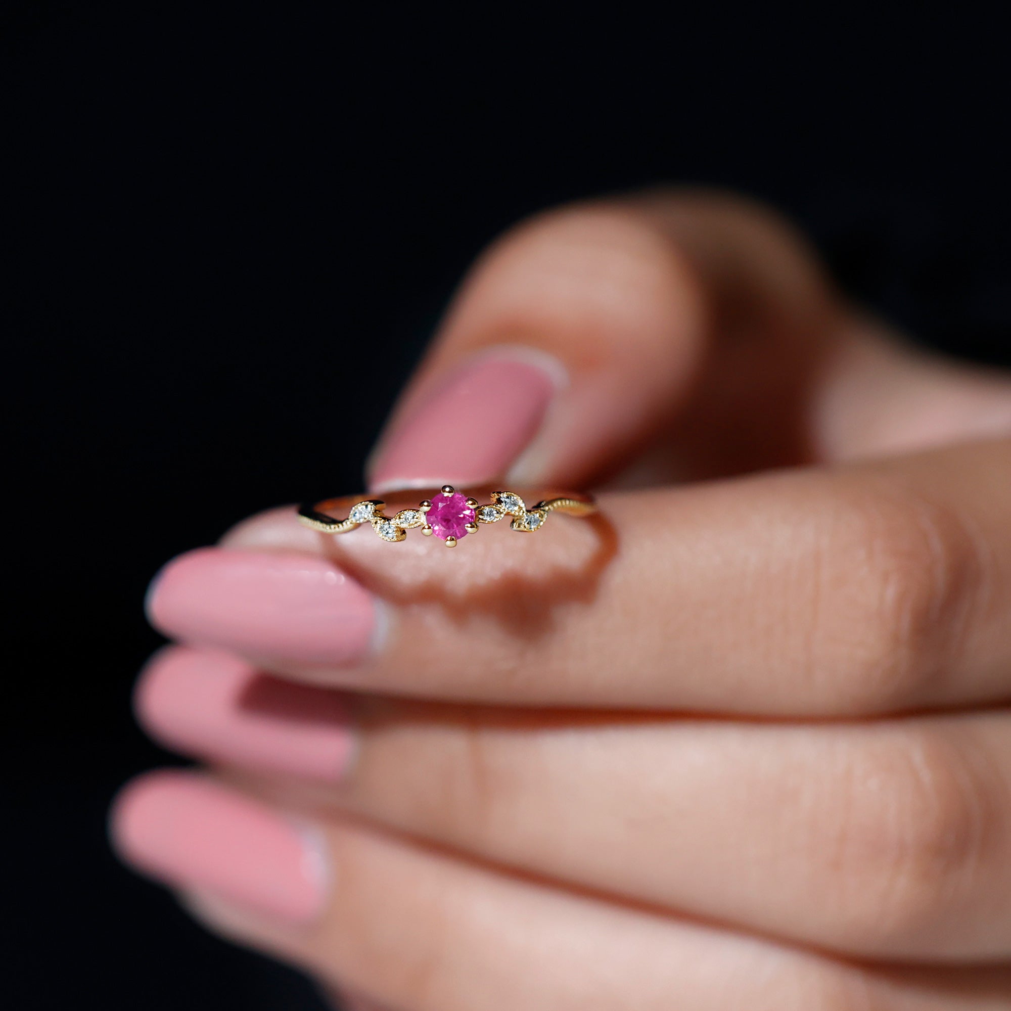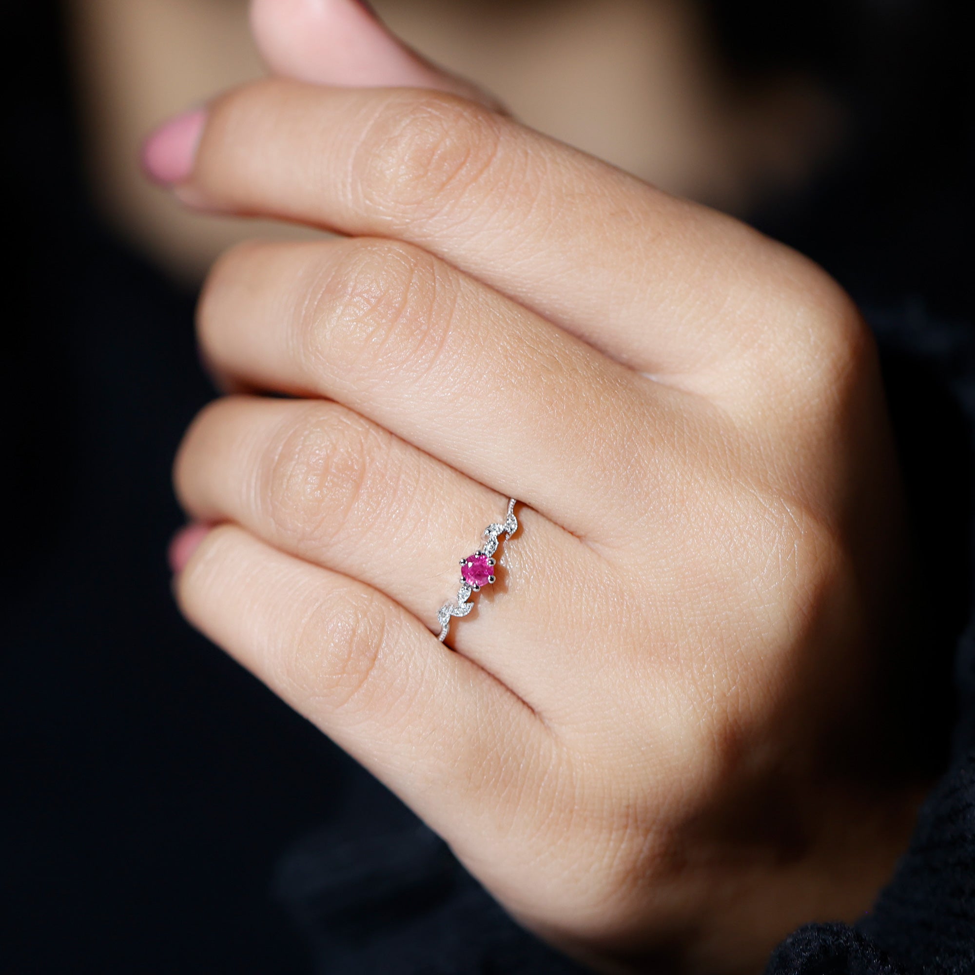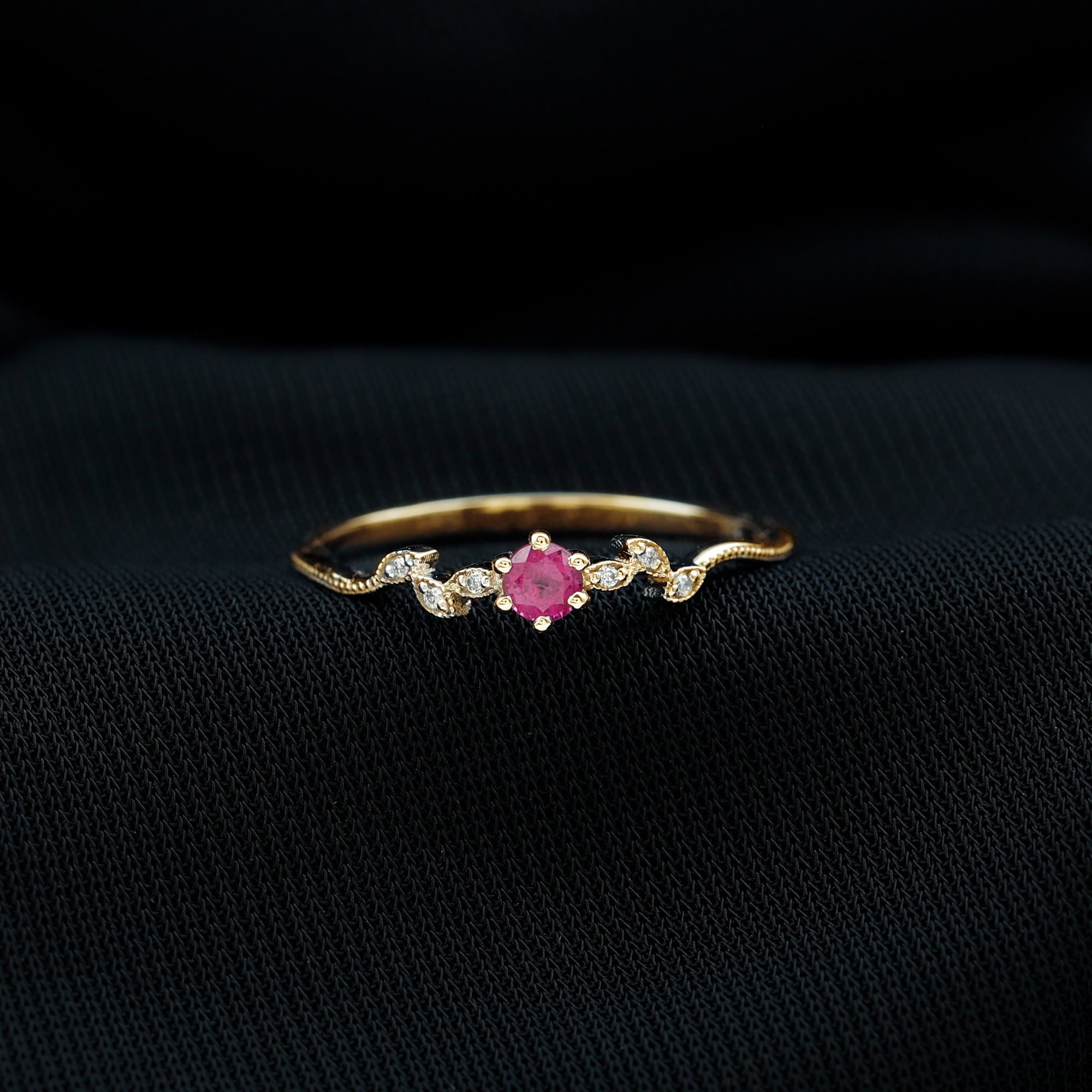 Show your love and affection with a gold beaded leaf ring, featuring a round-cut ruby. This ruby promise ring is the perfect way to express your feelings and is a beautiful and meaningful gift for a special woman in your life.