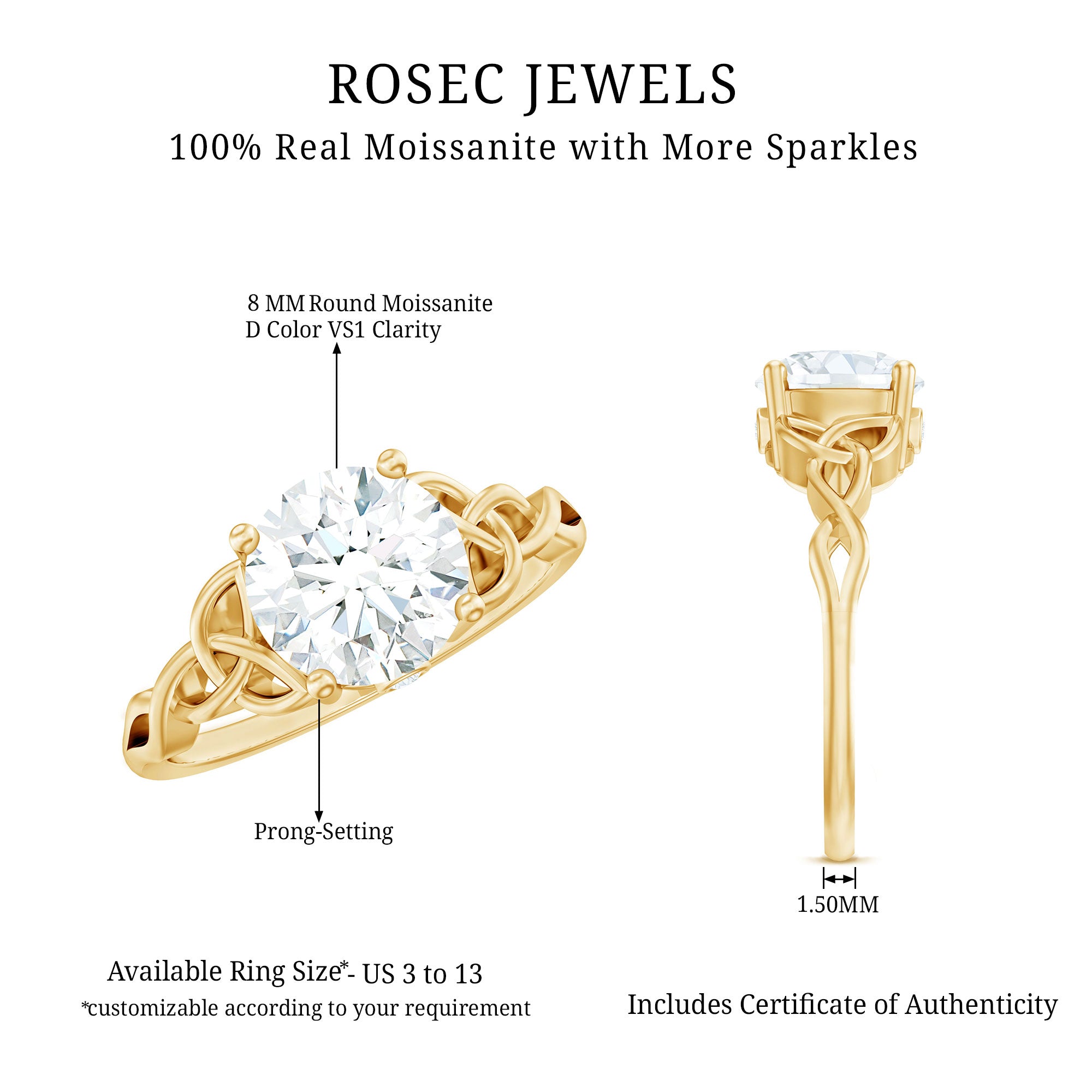 Celebrate love in its purest form with this captivating Moissanite Solitaire Engagement Ring, beautifully designed with timeless elegance and symbolic detail. At its heart lies a dazzling 8 MM round moissanite, securely set in prong setting, radiating exceptional brilliance and fire. The standout feature of this Moissanite Engagement Ring is the intricately crafted Celtic knot on either side of the center stone, a powerful symbol of eternal love, unity, and the unbreakable bond between two souls. The hidden moissanite beneath the main gem adds a touch of romance and meaning, making it much more than just a ring - it is a story of devotion woven into precious metal and stone. Designed with a harmonious balance of classic charm and contemporary style, this ring reflects sophistication while offering a deeply personal sentiment. Whether you are proposing to the love of your life or celebrating a special milestone, this Celtic Knot Engagement Ring is a unique expression of commitment and connection. It makes a thoughtful gift for a fiancée, wife, or someone close to your heart, beautifully packaged in a signature box. This 2 Carat Moissanite Ring is not only a timeless treasure but was created to honor the journey of love that has no beginning and no end.