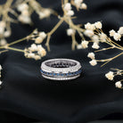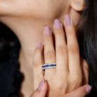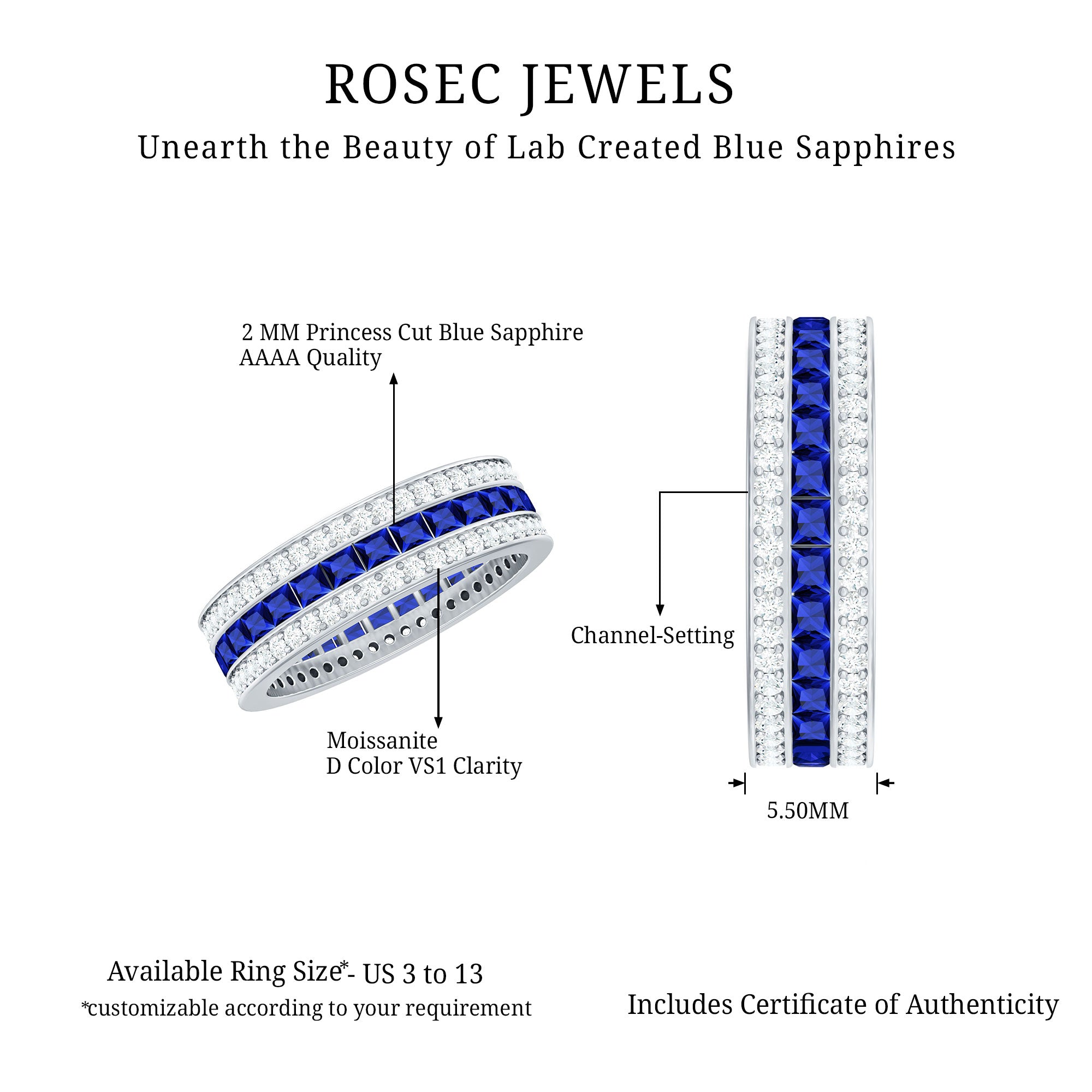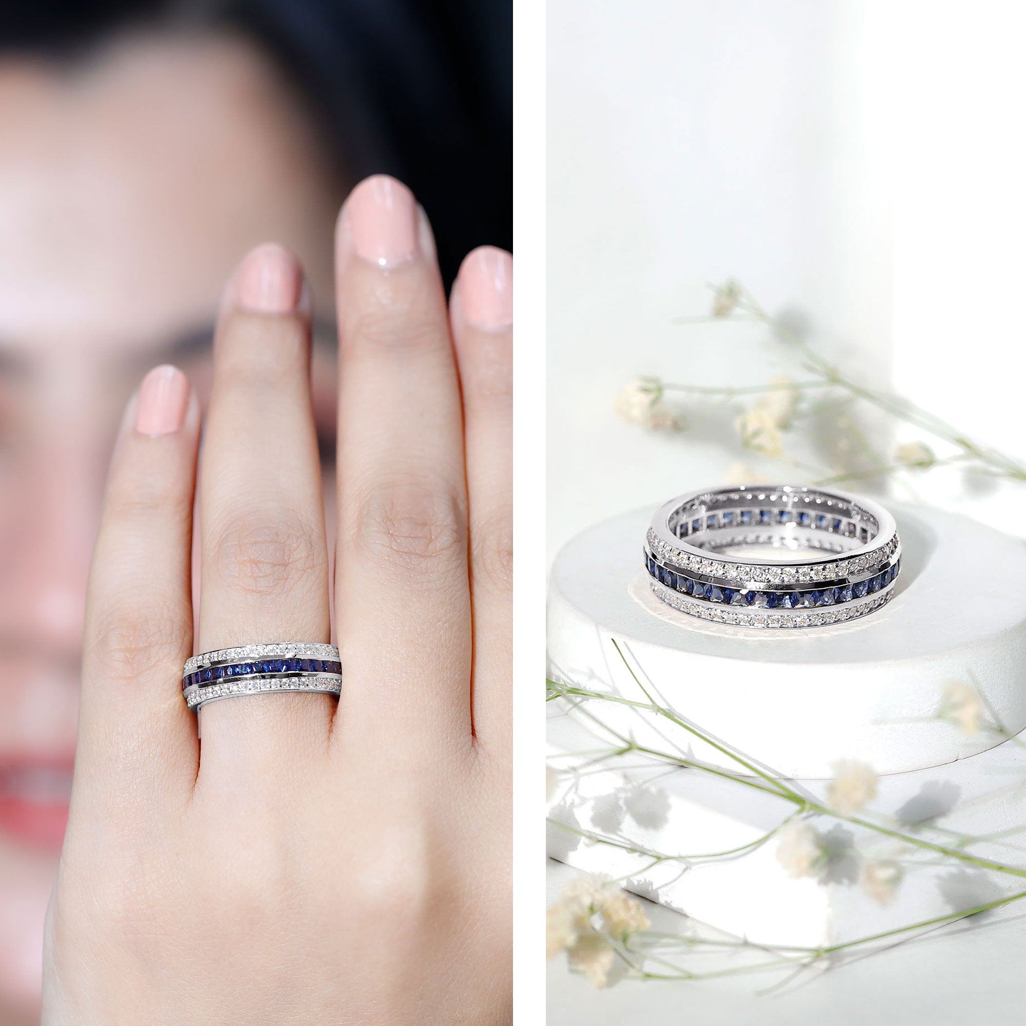 Make this wedding anniversary special by presenting our Eternity Band Ring, perfect for your big day. Showcasing princess-cut created blue sapphire and round moissanite elegantly held in channel setting on the eternity band. Crafted with proper care, this blue sapphire ring is a perfect fusion of timeless grace and sophistication. Celebrate a year of togetherness by surprising her with this sapphire ring, an extraordinary piece she will admire for the rest of her life.