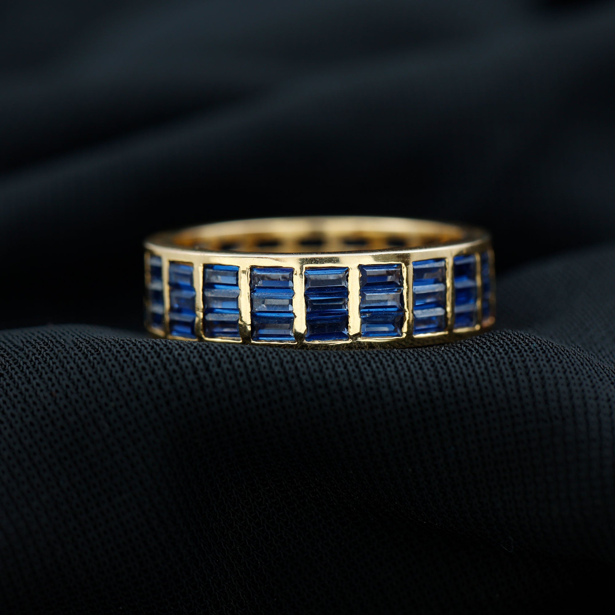 Deepen and strengthen your love with the rich and royal blue hue of this Created Blue Sapphire Eternity Band. Surprise her on your anniversary with this captivating piece, beautifully adorned with stunning color and embellishment. Let this Wide Eternity Ring be the expression of your enduring love, symbolizing the profound connection you share.