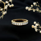 This Moissanite Band Ring reflects beauty and grace which marks the lasting impression of love. The band ring features Round Shape of Moissanite placed in Channel Setting making a continuous array of gemstones. This Channel Set Ring reflects the unmatchable shine of D-VS1 quality Moissanite making it perfect for D-Day. This Half Eternity Band can be styled solely or can be stacked with other statement rings to achieve a signature look. This Moissanite Wedding Ring is crafted precisely for your special day and will be delivered to you in a premium quality box for storage.