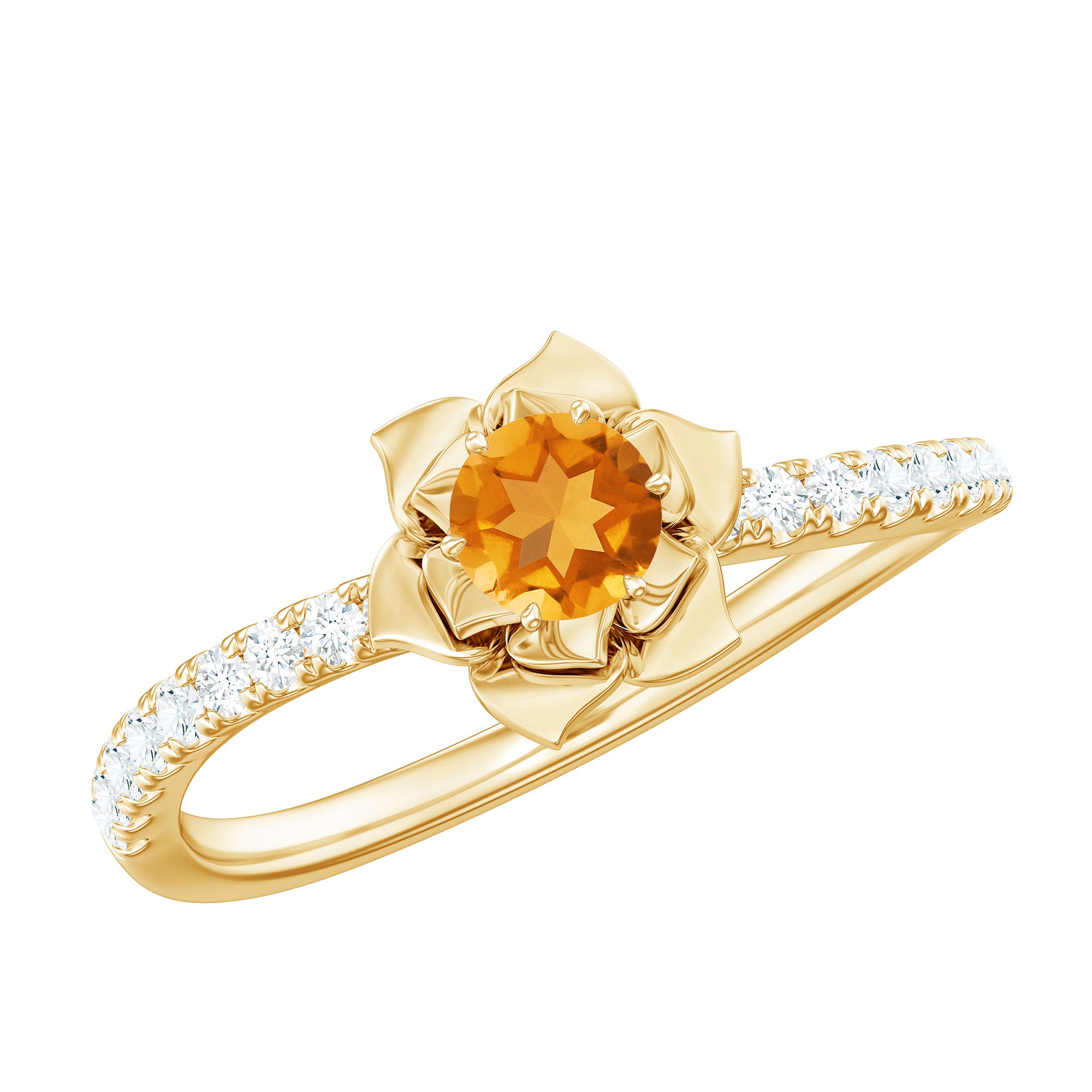 The Perfect Combination of Citrine and Diamond in this Rose Flower Ring is mesmerizing. The Round Natural Citrine is set in the Centre of Gold Petals of a Rose Flower in the curved shank. Get this Floral Inspired Engagement Ring for your Blooming Lady Love, this Citrine and Diamond Engagement Ring is a stunning piece of jewelry, which she will cherish her whole life.