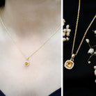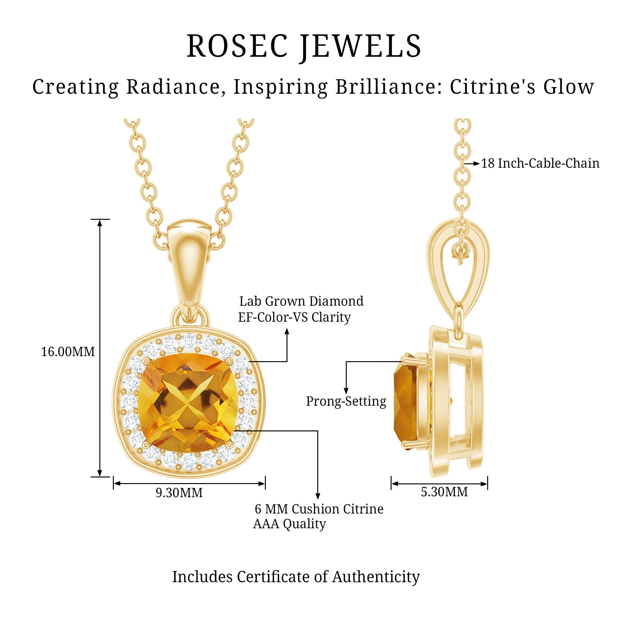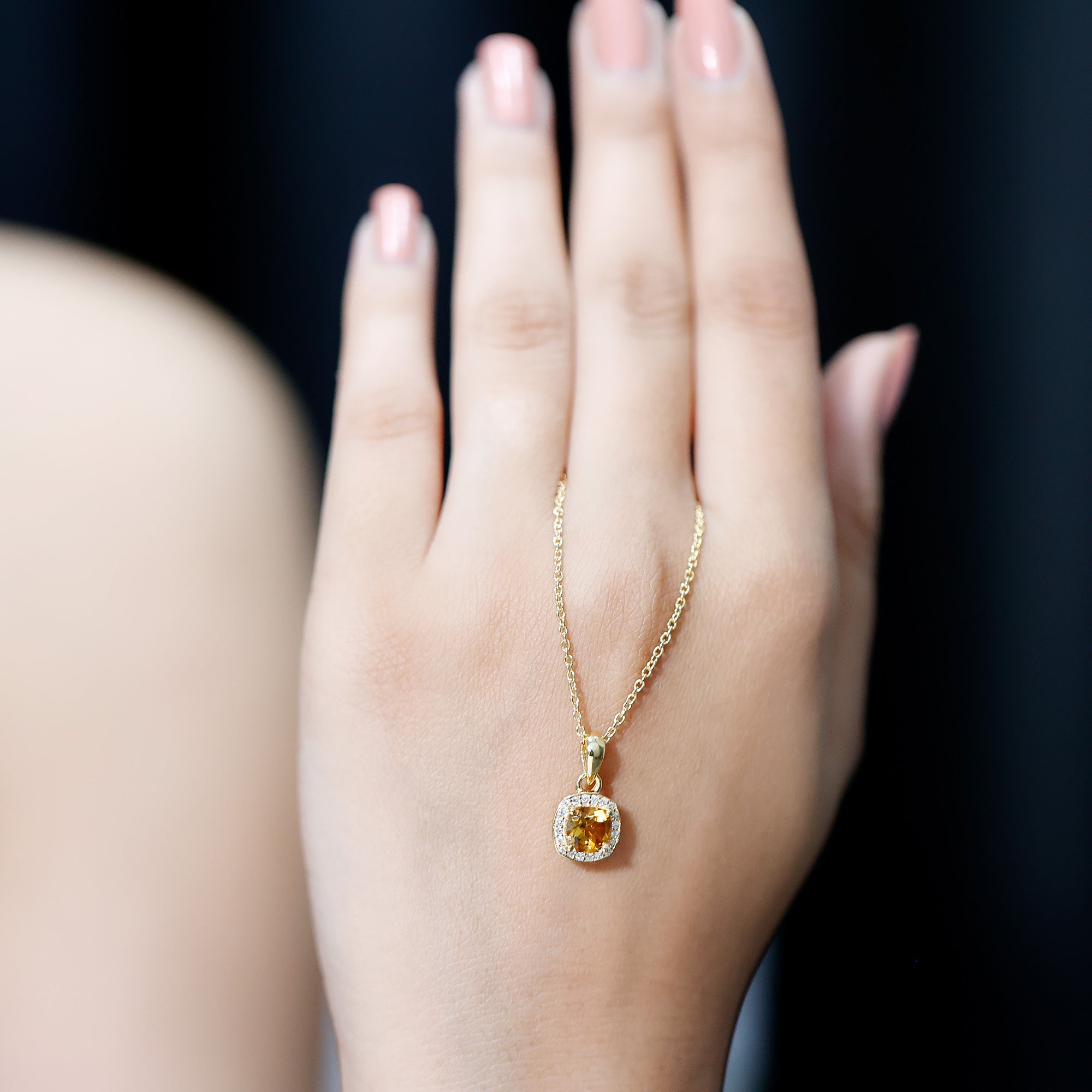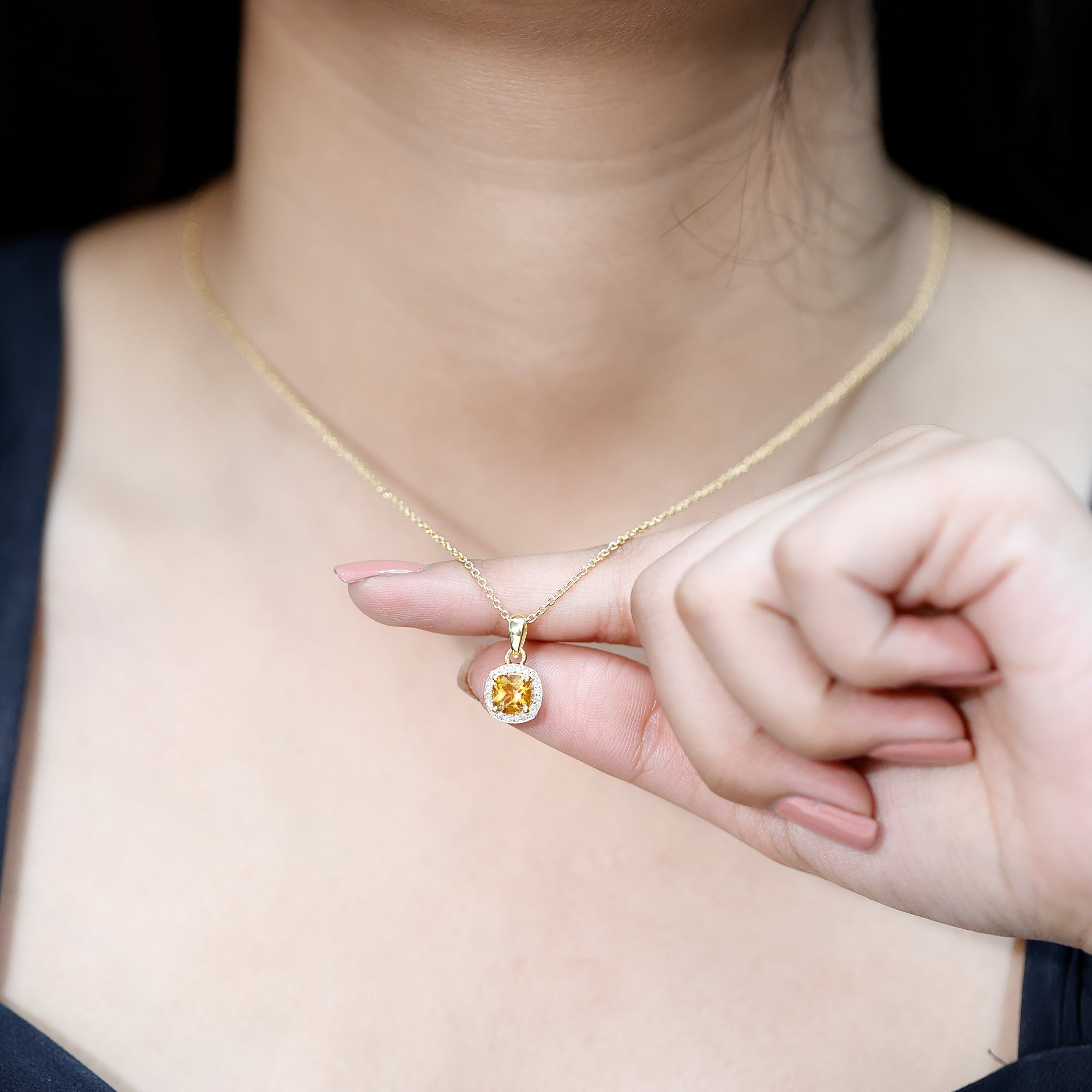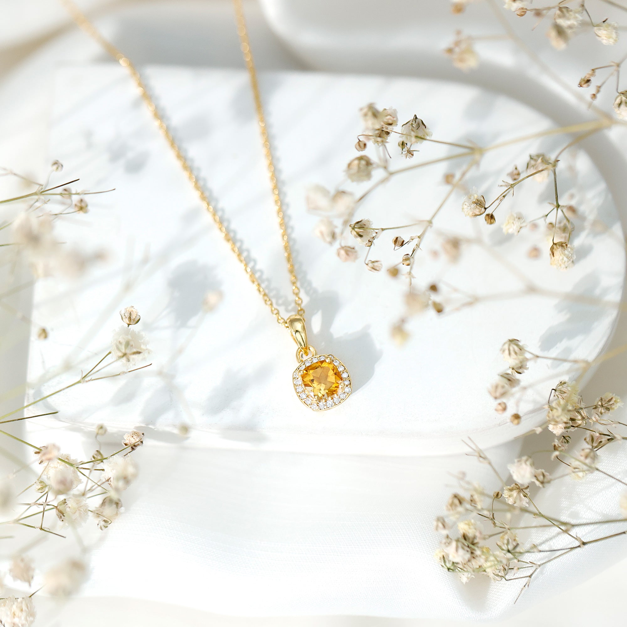 Celebrate the warmth and radiance of November with this exquisite Citrine Pendant Necklace, thoughtfully designed to capture the glow of the yellow gem. At the heart of this Halo Pendant is a stunning 6 MM cushion cut citrine of AAA Quality securely held by prong setting, symbolizing joy, abundance, and vitality. Surrounding the citrine centerpiece is a sparkling halo of EF-VS quality lab grown diamonds, meticulously set to enhance the brilliance and depth of the central gem. The Citrine and Diamond Necklace is expertly crafted in 14k yellow gold plated silver, offering a sleek and contemporary finish with the strength and durability for everyday wear. A sturdy, polished bail connects the pendant to a strong cable chain, providing both comfort and reliability, while complementing the overall design with subtle sophistication. Whether you are treating yourself or searching for a meaningful birthday gift, this November Birthstone Necklace arrives in a beautifully presented signature jewelry box, making every unboxing moment special. Its timeless design and thoughtful craftsmanship ensure it will become a cherished favorite in any jewelry collection. Radiating golden glow and surrounded by brilliant sparkle, this Yellow Gemstone Necklace is a celebration of personality, beauty, and the meaningful moments that define us. Ideal for November birthdays, special occasions, or everyday luxury.