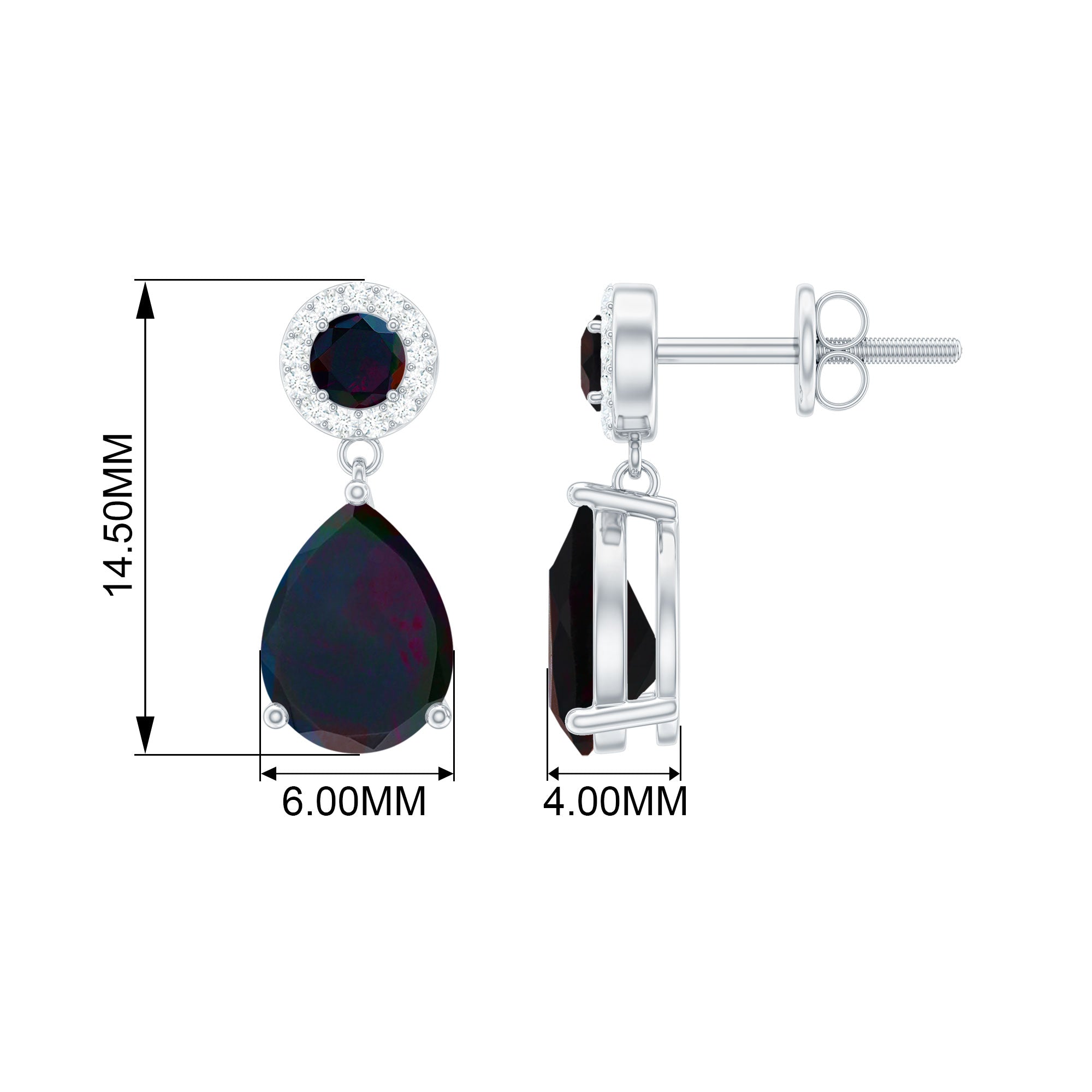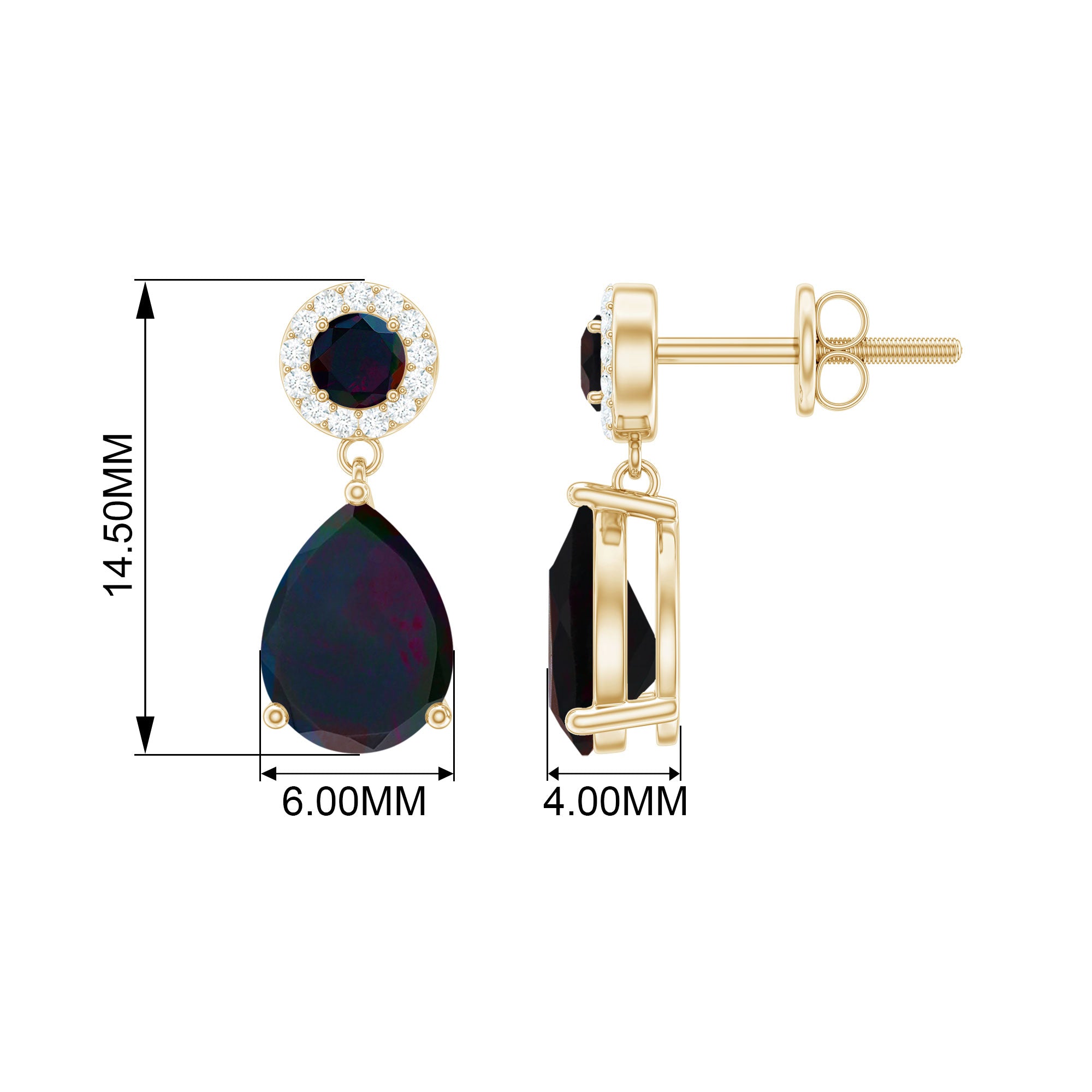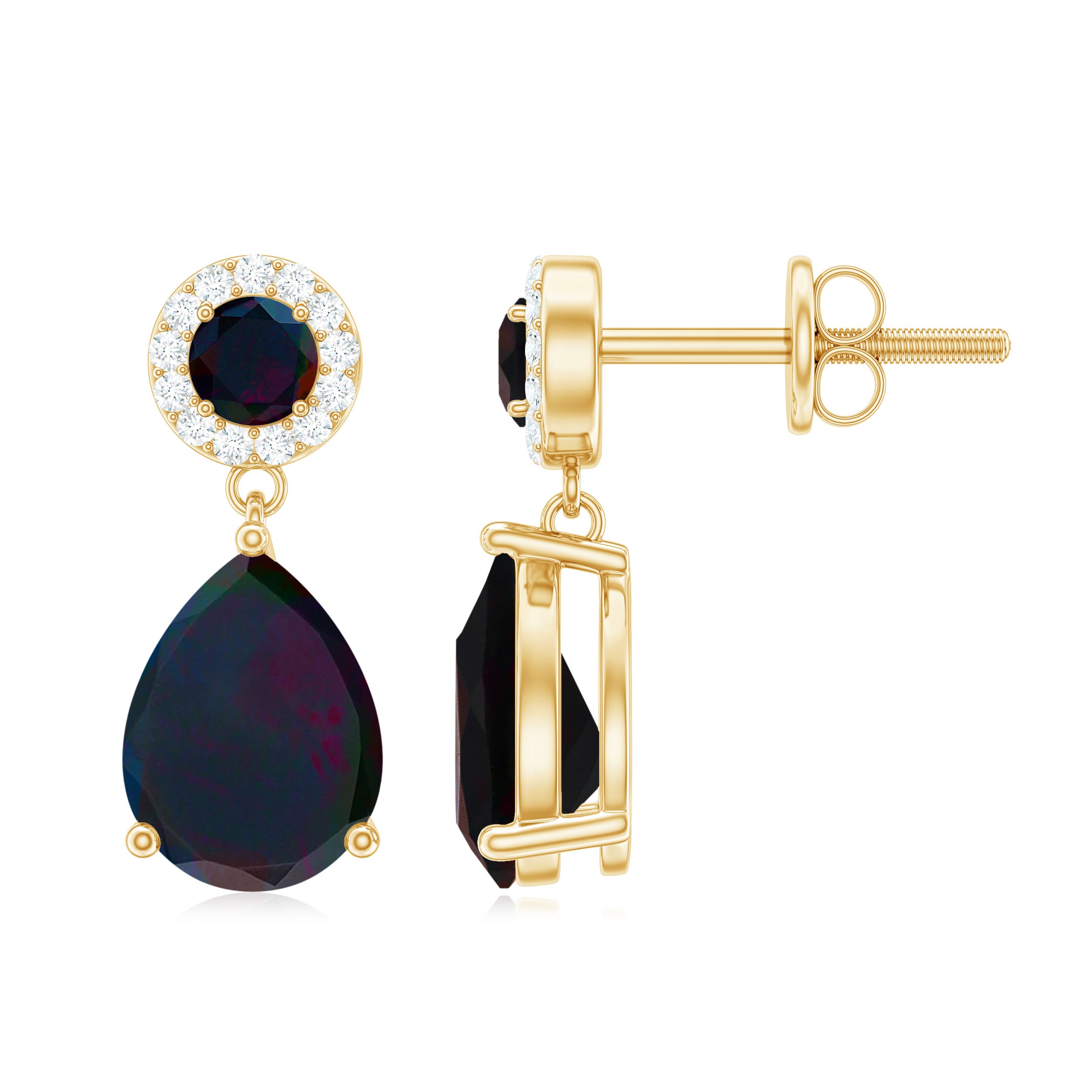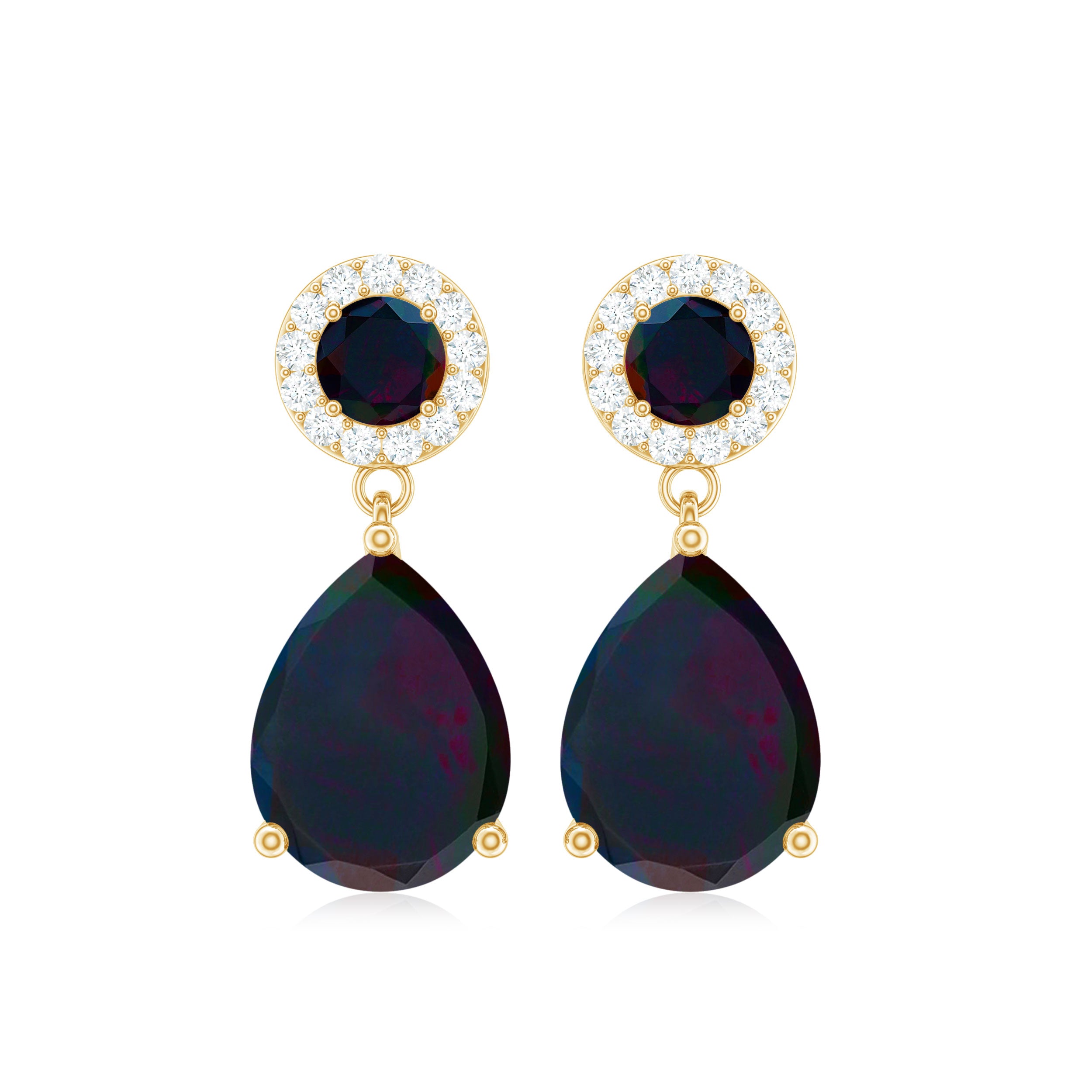 Elevate your outfit with a touch of grace by wearing these Teardrop Earrings, showcasing a pear-cut black opal drop and a halo of round Diamond surrounding the round black opal gemstones as the stud. Made from gold, these black opal earrings exude a playful yet sophisticated look, and their versatility makes them perfect for a variety of styles and occasions. With their timeless design, these bridal drop earrings are a must-have addition to any jewelry collection.