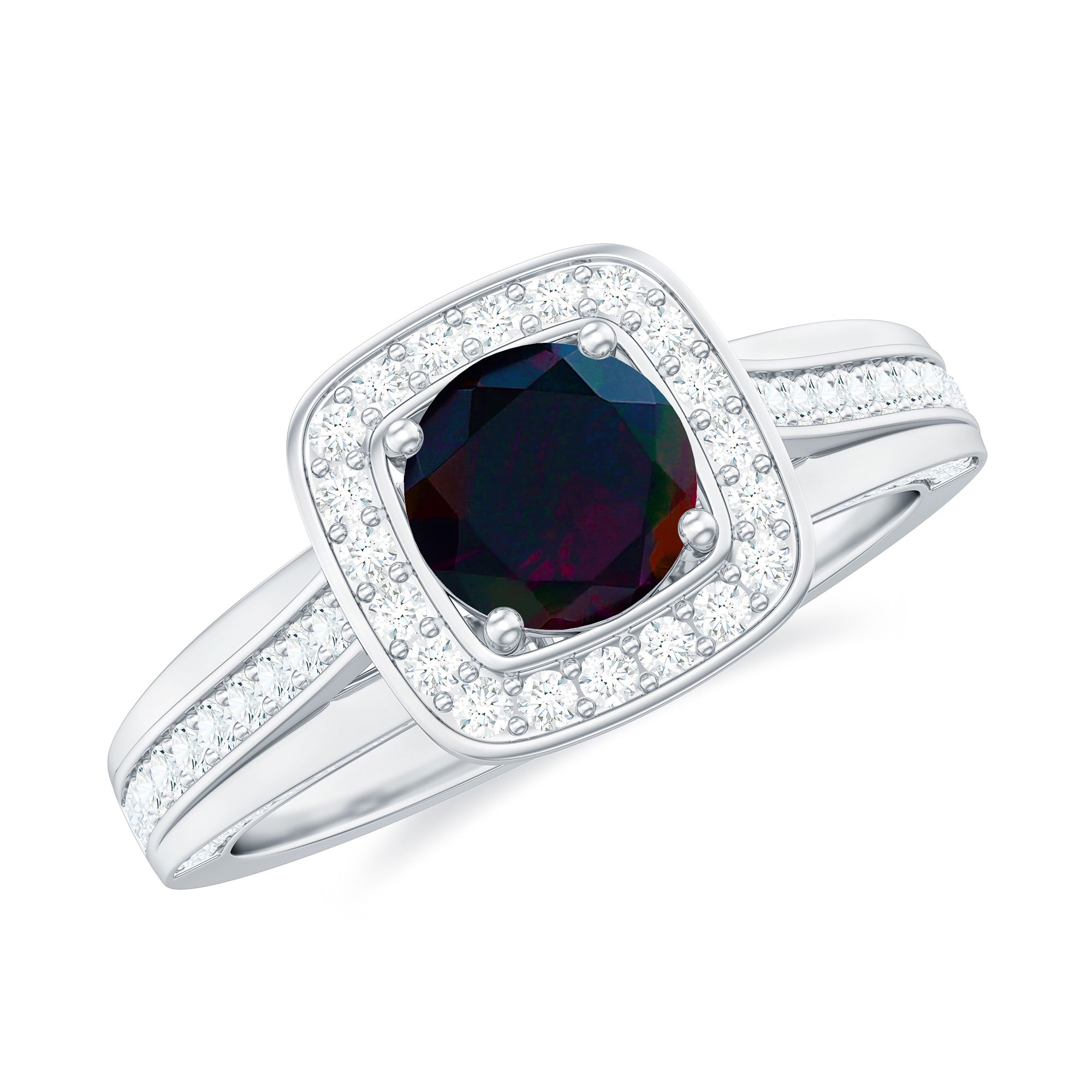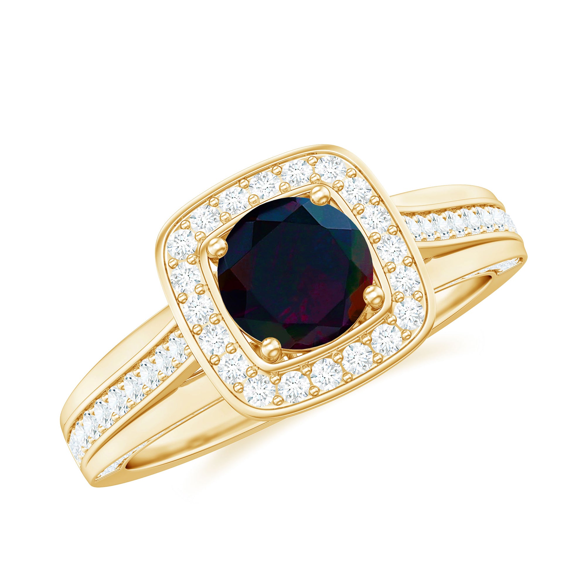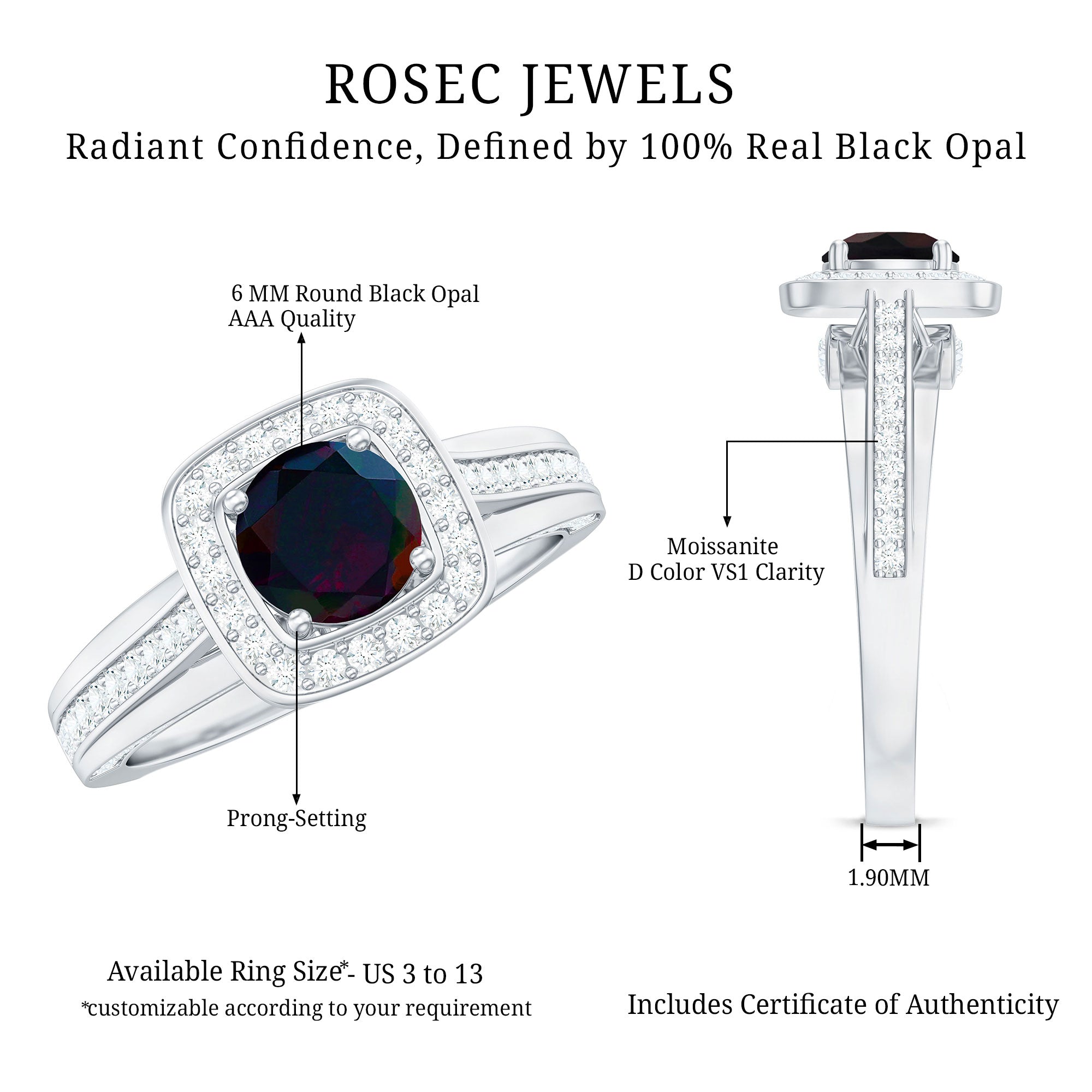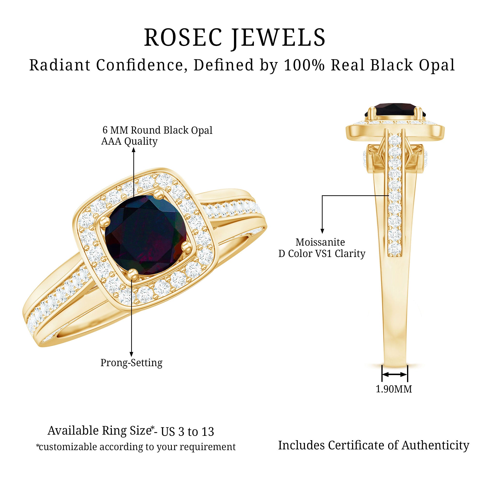 Make her speechless by proposing to her with this Classic Engagement Ring. With such a modern and timeless design composed in Solid Gold, the Black Opal Engagement Ring features a sparkling 6 MM Black Opal at the center stealing all the attention while Round Cut Moissanite adorn it as halo and as accent in prong setting.