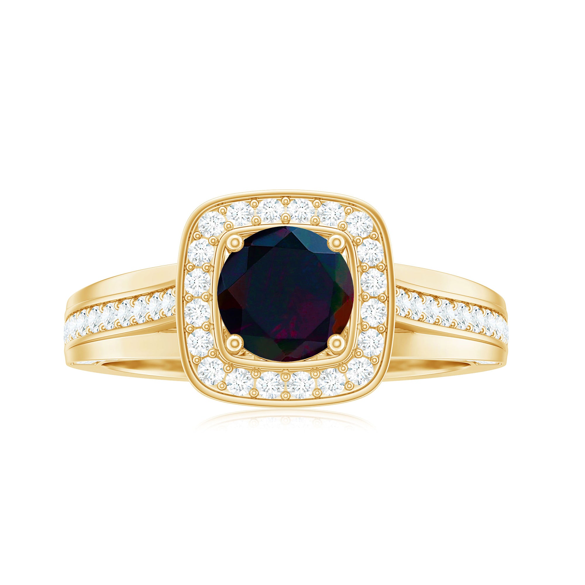 Make her speechless by proposing to her with this Classic Engagement Ring. With such a modern and timeless design composed in Solid Gold, the Black Opal Engagement Ring features a sparkling 6 MM Black Opal at the center stealing all the attention while Round Cut Moissanite adorn it as halo and as accent in prong setting.