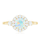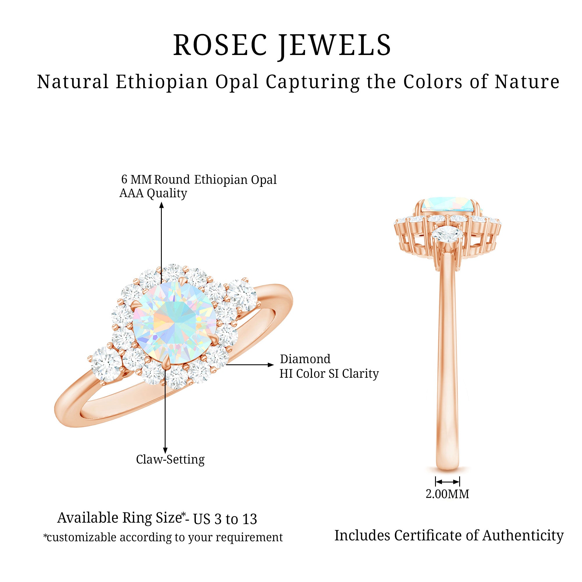 Dreamy and mesmerizing, this Classic Engagement Ring is made for the kind of love that feels both effortless and eternal. This Fine Engagement Ring features a glowing 6 mm Round Shape Ethiopian Opal that catches the light with every movement, revealing a soft rainbow of hues. Framed by a sparkling Diamond halo, the centerpiece is elevated to pure magic. On each side, a dainty Diamond adds just the right touch of elegance, like two stars guiding your forever journey. The design of this Opal and Diamond Ring is graceful yet unforgettable, blending classic beauty with a hint of whimsy, perfect for someone romantic at heart. Whether you are planning a surprise or choosing a ring together, this Halo Engagement Ring with Opal is a heartfelt symbol of strength and the lasting glow of love. Packaged in a beautiful jewelry box and available in a range of sizes, this Real Opal Engagement Ring is ready to fit perfectly into your most unforgettable moment.