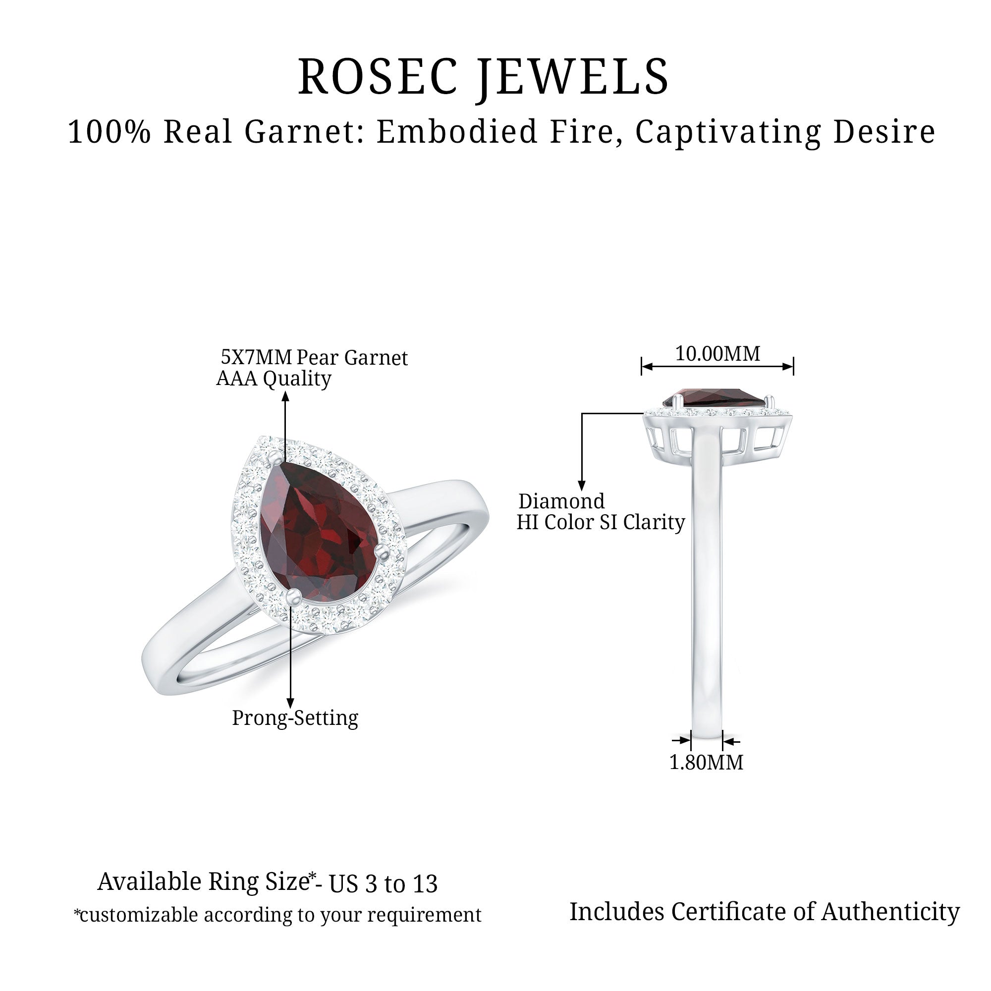 Turn heads and capture hearts with this Teardrop Engagement Ring, a timeless expression of love and devotion. The stunning 5X7 mm Pear Shape Garnet set in Prong Setting takes center stage, its deep red hue symbolizing passion and eternal commitment. Surrounding the AAA Quality Red Garnet is a sparkling Halo of Diamond stones, adding an extra layer of sparkle and highlighting its natural beauty. The design is simple yet striking, combining the classic elegance of a teardrop shape with the modern brilliance of a diamond halo for a look that is both sophisticated and unforgettable. Whether you are marking a special occasion or proposing to the love of your life, this Garnet Engagement Ring with Halo is a stunning choice that will leave a lasting impression. Presented in a signature jewelry box and available in various US ring sizes, this Garnet Diamond Ring is ready to fit perfectly on the finger of your beloved. Romantic and effortlessly chic, this Pear Shaped Engagement Ring is the perfect way to say forever.