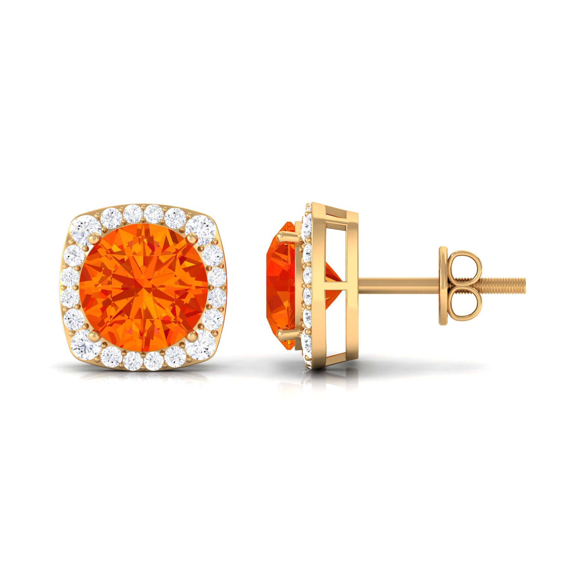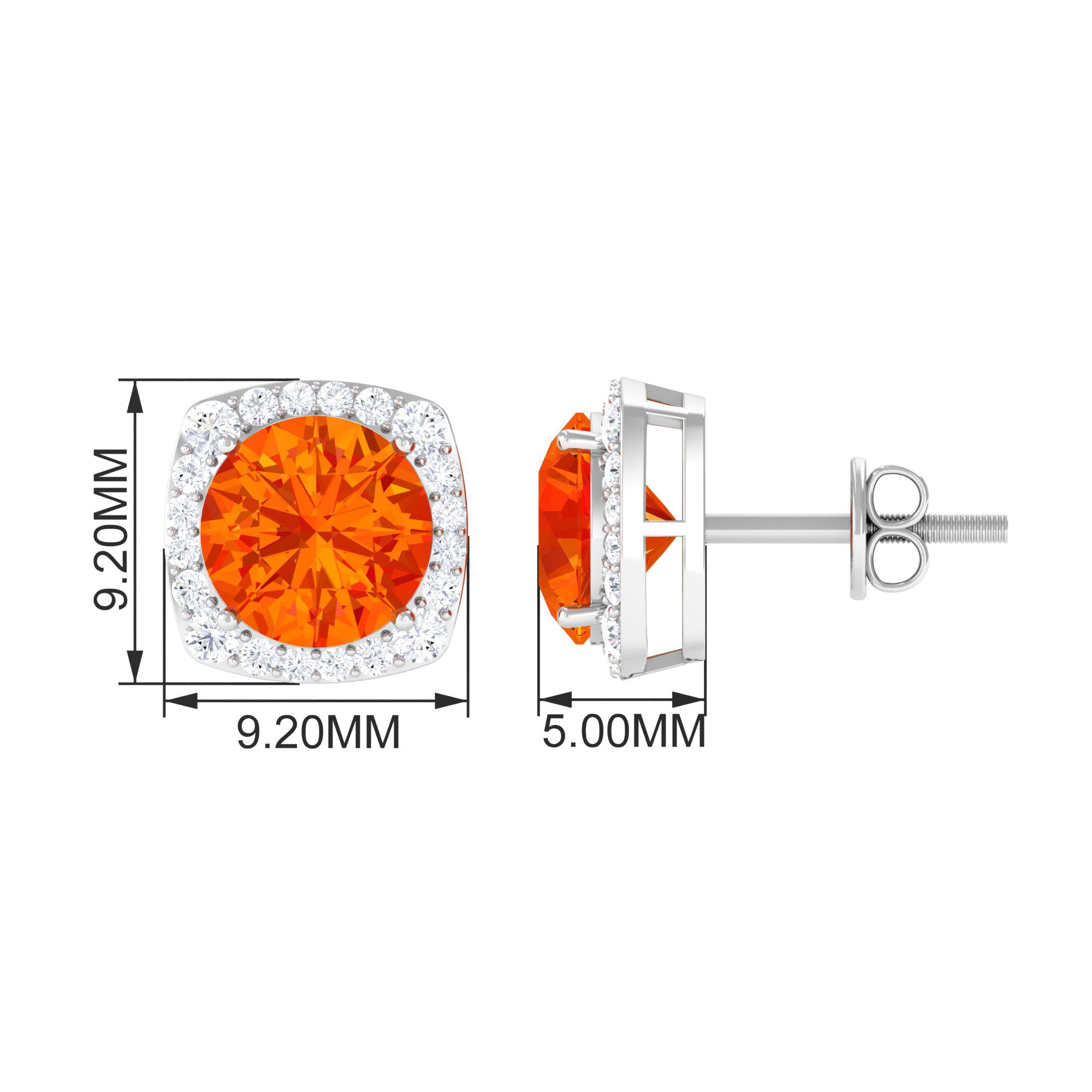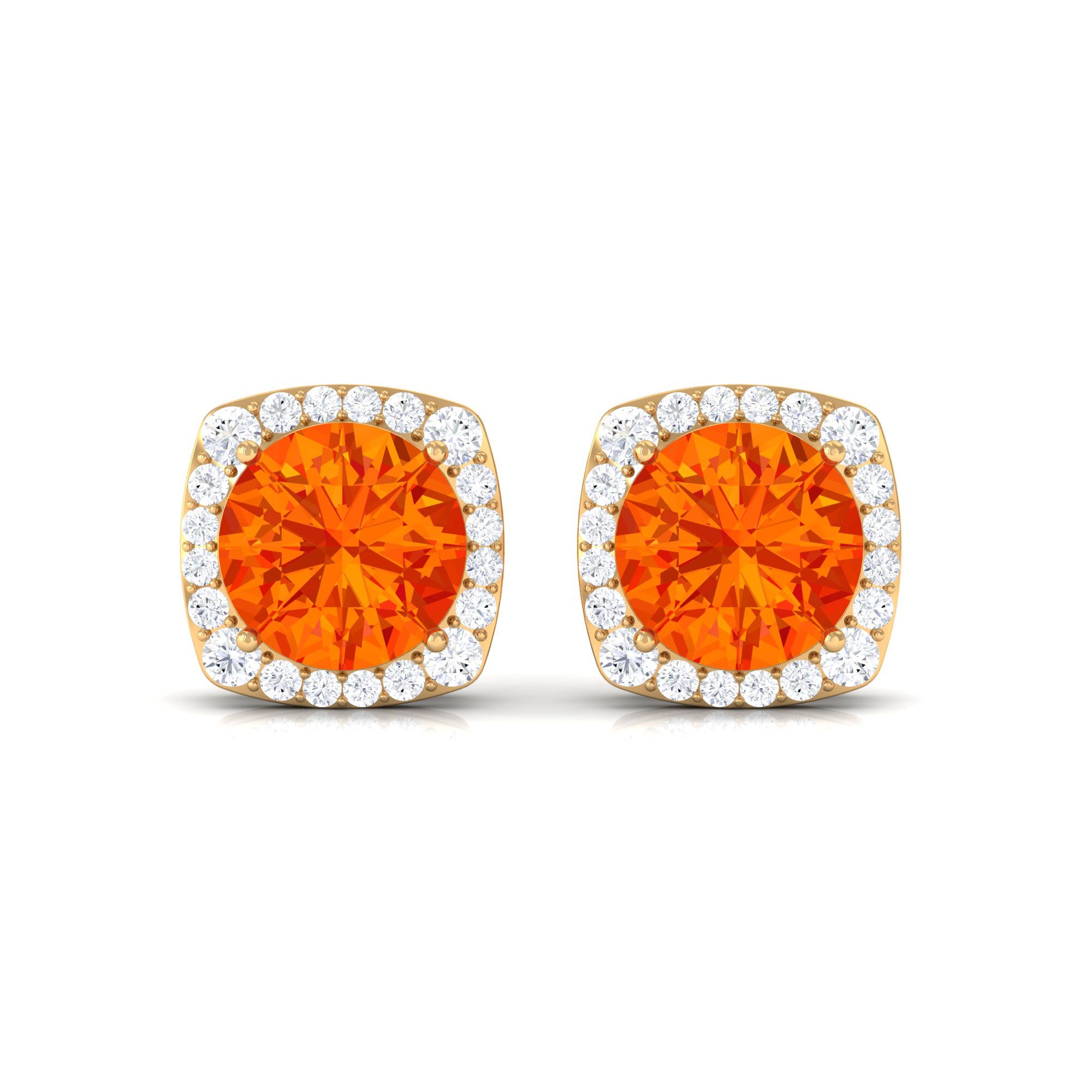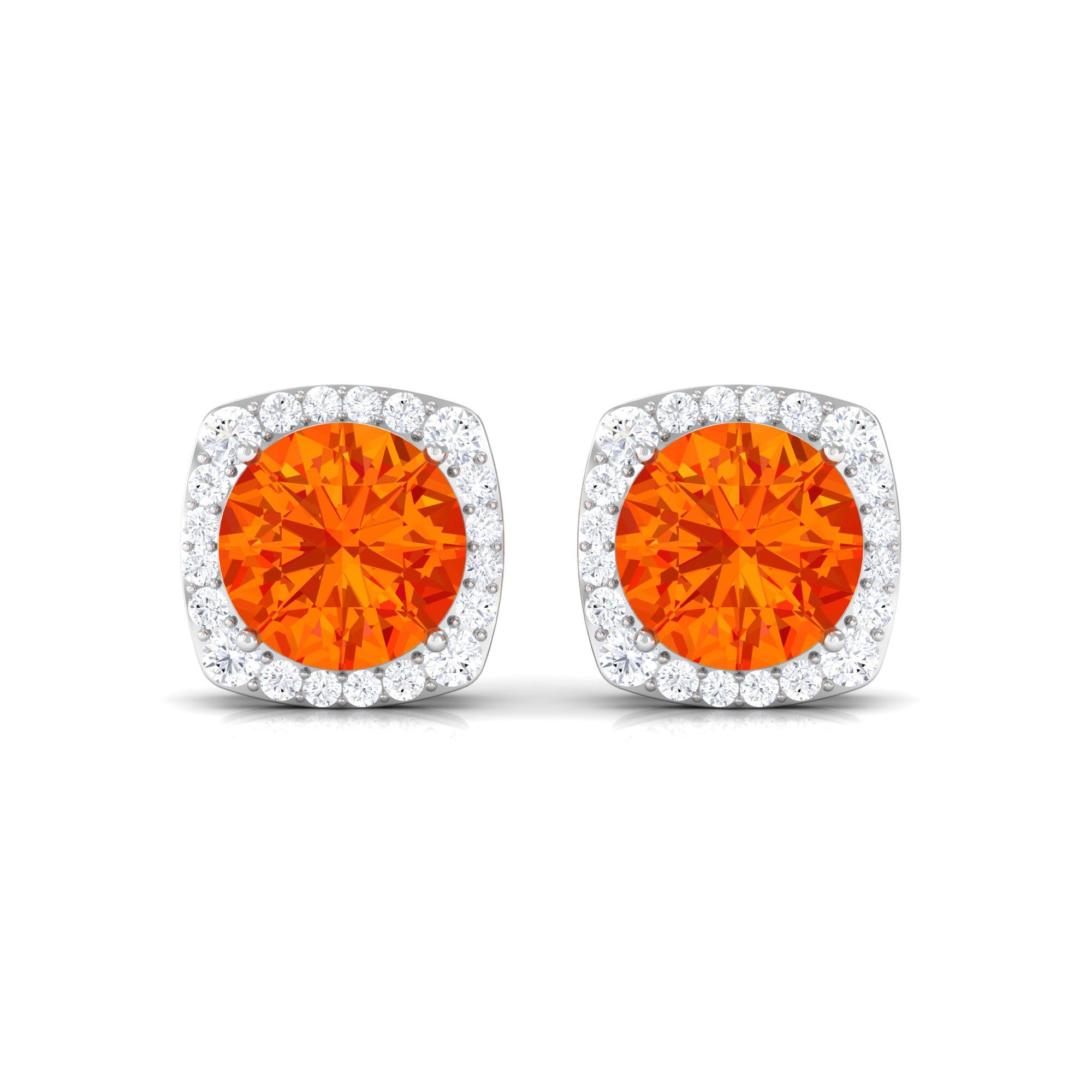 Bright and full of warmth, these Lab Grown Orange Sapphire Earrings bring a radiant touch of color to any look. At the center of each earring sits a 5 MM round shaped lab created orange sapphire, securely held in 4-prong setting. Surrounding the sapphire is a delicate halo of sparkling diamonds, adding brilliance and contrast that enhances the beauty of the center stone. The combination of the warm orange sapphire and the shimmering white diamonds creates a look that feels both elegant and lively. Carefully crafted in a sustainable lab environment, these Orange Sapphire Stud Earrings offer exceptional quality and ethical craftsmanship without compromising on style or sparkle. Their classic yet modern design makes them perfect for all occasions, whether you are dressing up for a special event or adding a pop of color to your everyday outfit. Lightweight and comfortable, these Orange Sapphire and Diamond Earrings are designed for effortless wear, bringing beauty and confidence wherever you go. These Sapphire Halo Earrings also make a wonderful gift for birthdays, anniversaries, or celebrations, offering a unique blend of charm and sophistication.