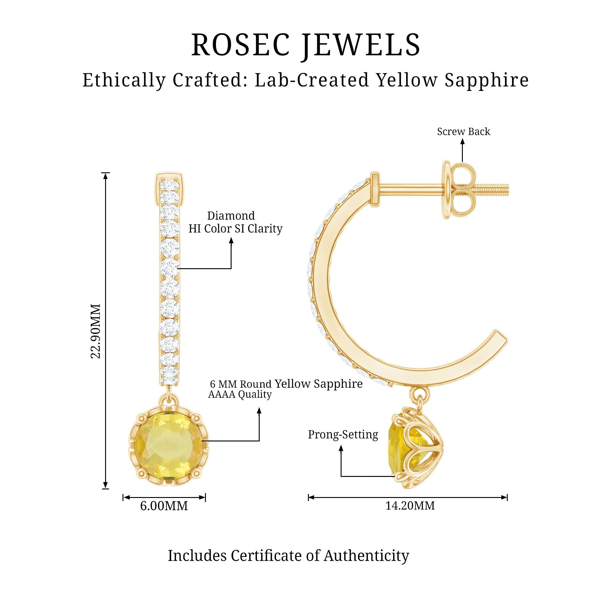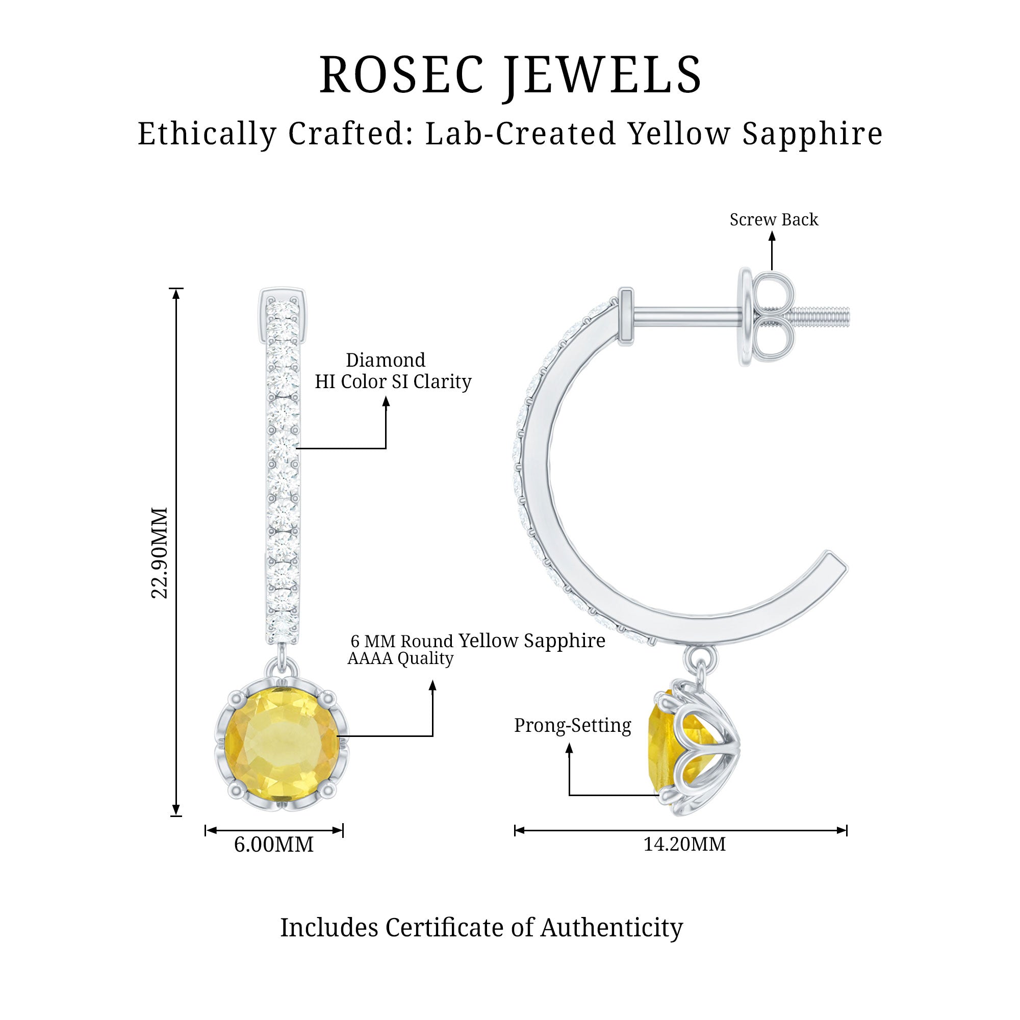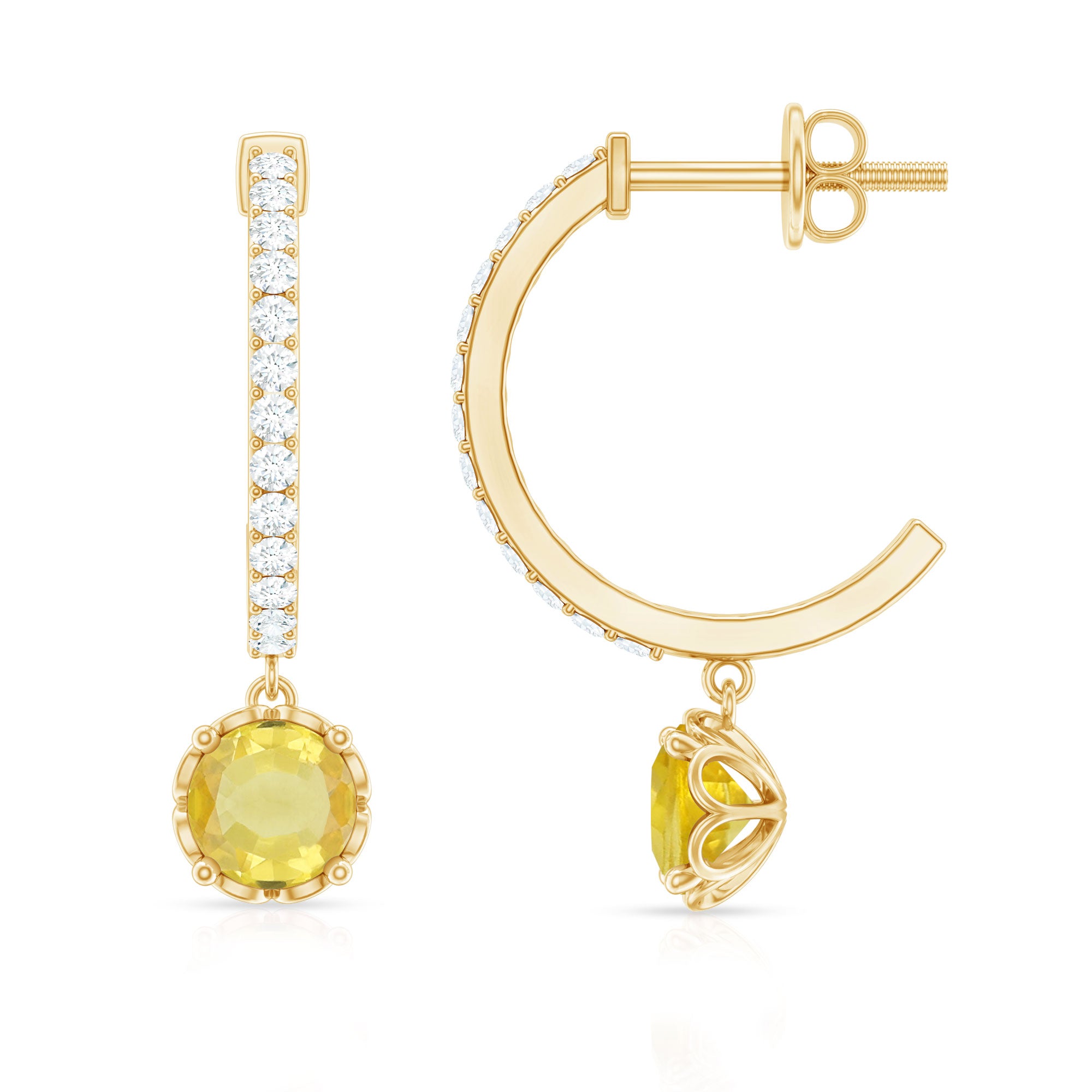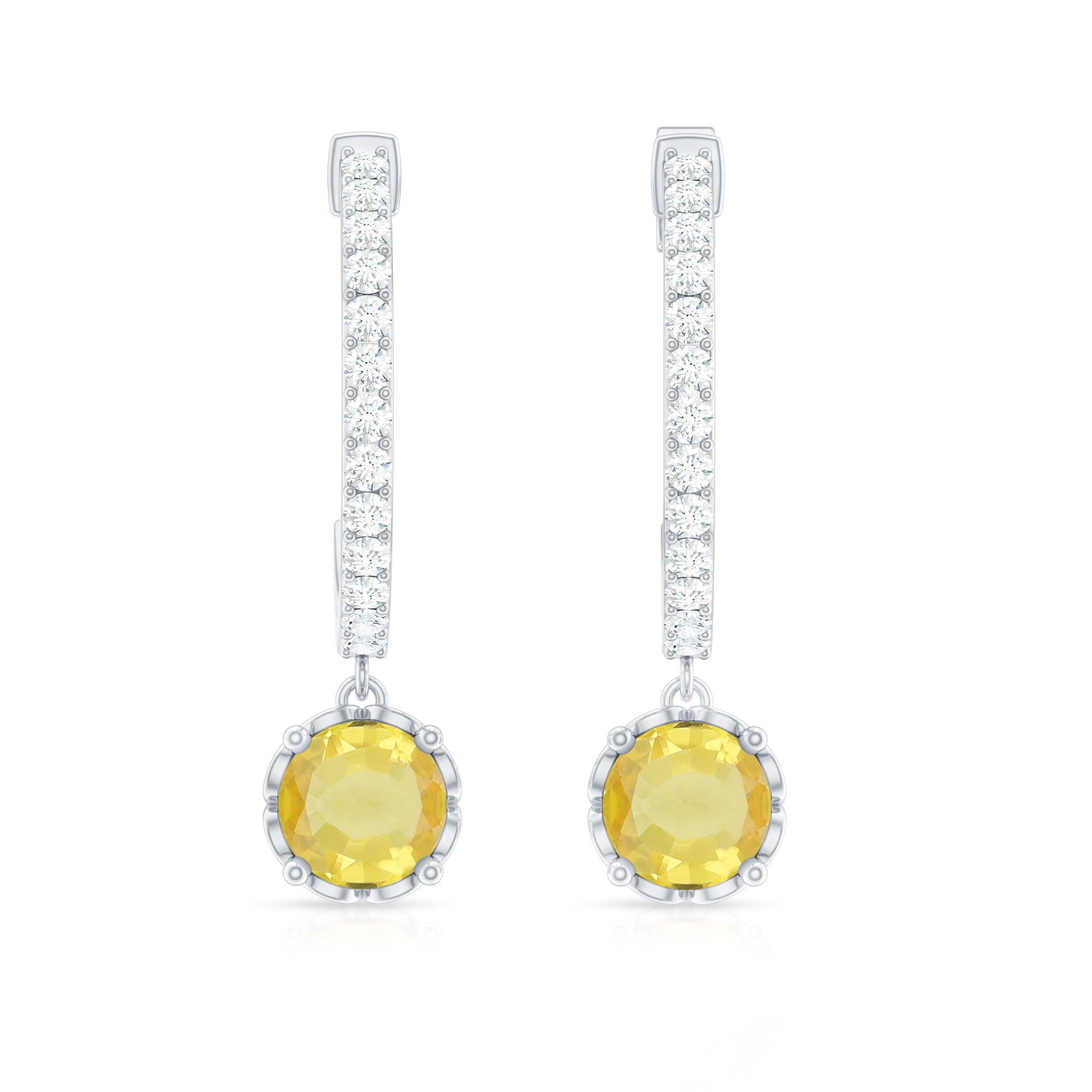 Dancing with golden light, these Lab Grown Yellow Sapphire Earrings capture the joy and brilliance of sunshine in every detail. Designed to blend timeless grace with a hint of modern charm, these earrings feature a 6 MM round cut lab created yellow sapphire that is elegantly suspended from a smooth half-hoop design. Along the curved hoops, delicate round cut diamonds are set in a fine line, adding a soft shimmer that enhances the vivid yellow hue of the sapphire. Together, they create a graceful balance of sparkle and color, bright enough to stand out yet subtle enough for everyday elegance. These Yellow Sapphire and Diamond Earrings are crafted with care for those who love jewelry that feels both luxurious and meaningful. Whether you wear them to a celebration or to add a glow to your daily look, they bring a cheerful sophistication that never goes unnoticed. Designed for comfort and lasting beauty, the secure screw-back closures keep these Yellow Sapphire Hoop Earrings perfectly in place, allowing you to move with confidence and ease. These Sapphire Drop Earrings are a celebration of light and style, a timeless accessory that beautifully reflects warmth, joy, and effortless elegance in every wear.