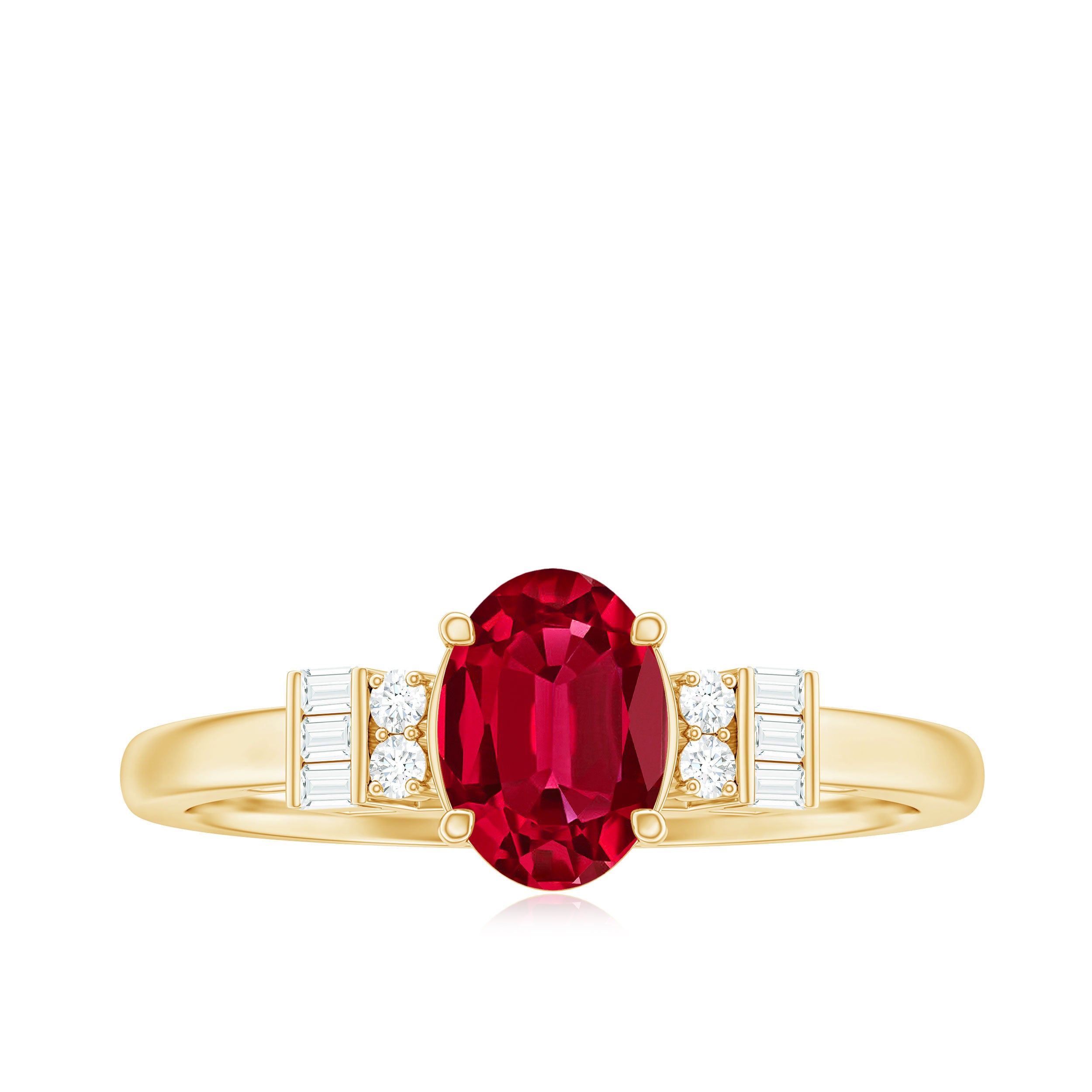 Surprise her with this Lab Grown Ruby Engagement Ring that speaks louder than words, elegant, vibrant, and full of meaning. The gorgeous design centers around a 6X8 MM oval cut lab created ruby. Its deep color instantly draws attention, making it a piece that feels both powerful and graceful at the same time. On each side of the ruby, baguette and round cut diamonds are carefully set, adding the right amount of sparkle and sophistication. The contrast between the AAAA quality lab grown ruby and HI color and SI clarity diamonds creates a breathtaking effect that is hard to miss. Every detail, from the smooth band to the perfectly aligned stones, reflects quality craftsmanship and thoughtful design. What makes this Ruby and Diamond Ring special is its perfect mix of classic charm and modern flair. Together, they create a balance that is elegant, ideal for women who love jewelry with personality and style. Whether it is for an engagement, an anniversary, or just because she deserves something beautiful, this Oval Cut Engagement Ring is a true showstopper. Comfortable for everyday wear yet dazzling enough for special occasions.