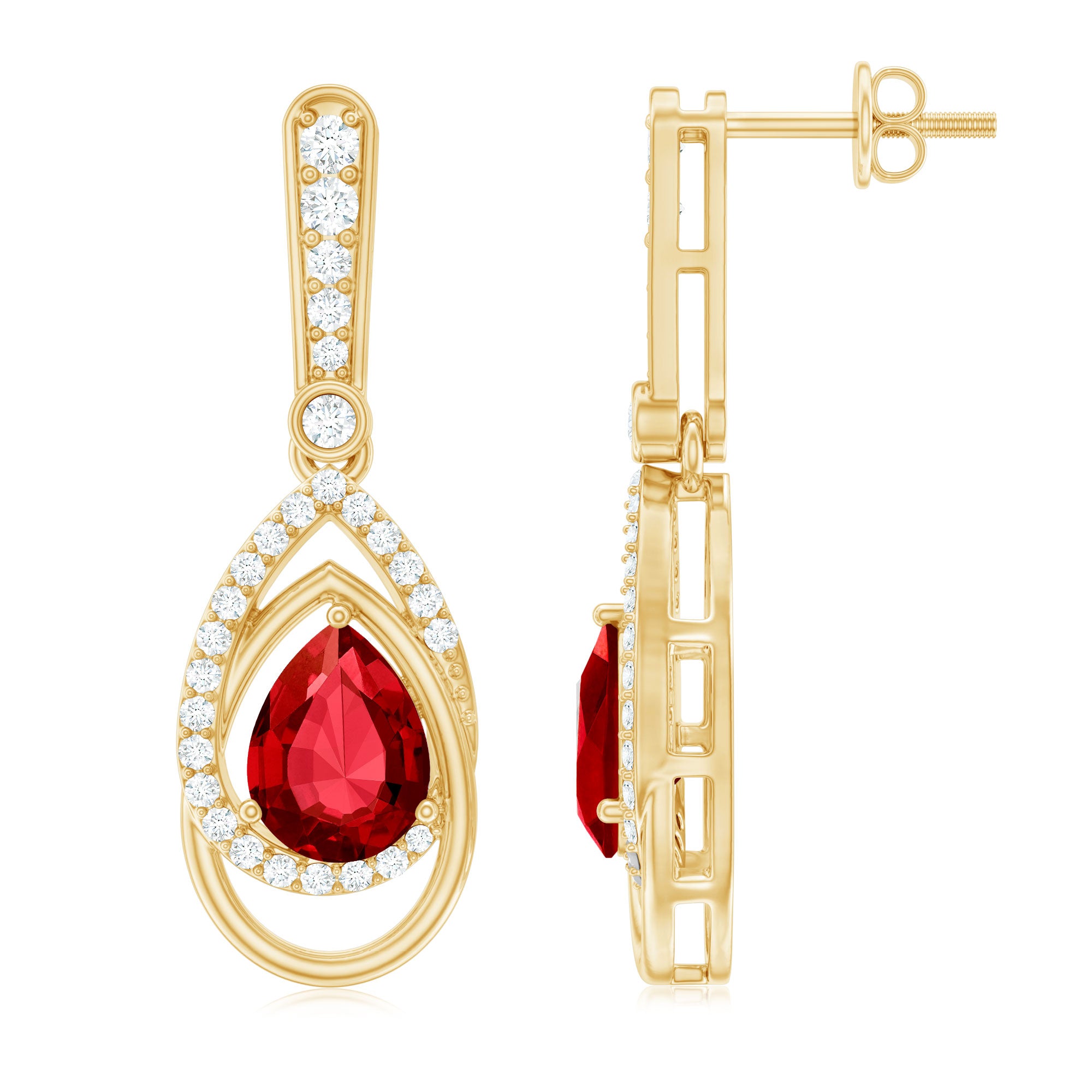 Command attention wherever you step with these striking Created Teardrop Earrings. What sets this Ruby Earrings apart is its bold artistic design, showcasing a centrally placed 6x8mm Pear Shaped Lab Created Ruby within two intertwined teardrop metal frames. One frame sparkles with accent of the Lab Created Diamonds, while the other completes the piece with its radiant metallic grace. The captivating combination of Aaaa Quality Ruby and Ef-Vs Quality Diamond with metal makes this Ruby Diamond Earrings eye-catching, ensuring heads will turn wherever you go. Rosec Jewels, specializes in crafting show-stopping pieces with Certified Lab Grown Gemstones. Order to check!