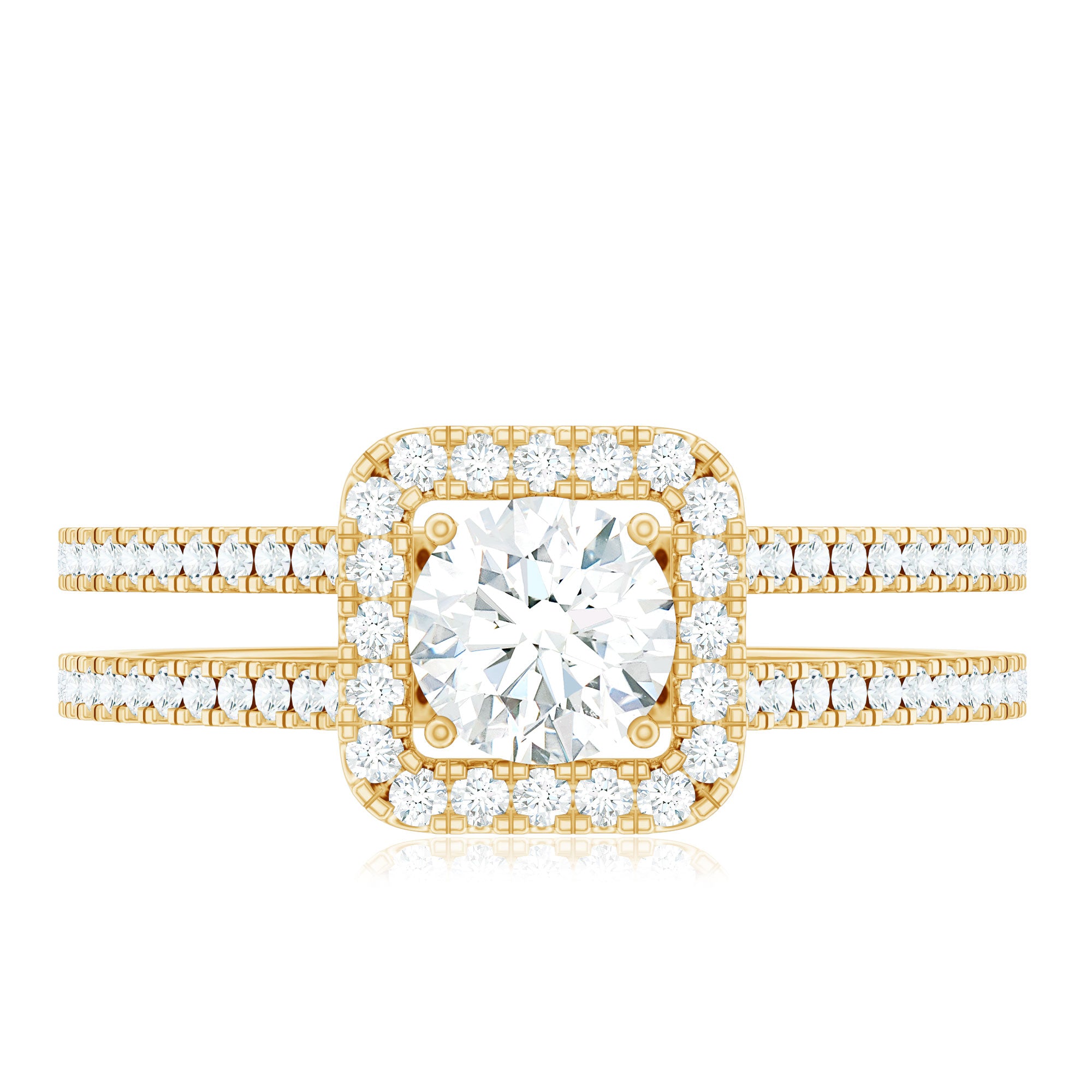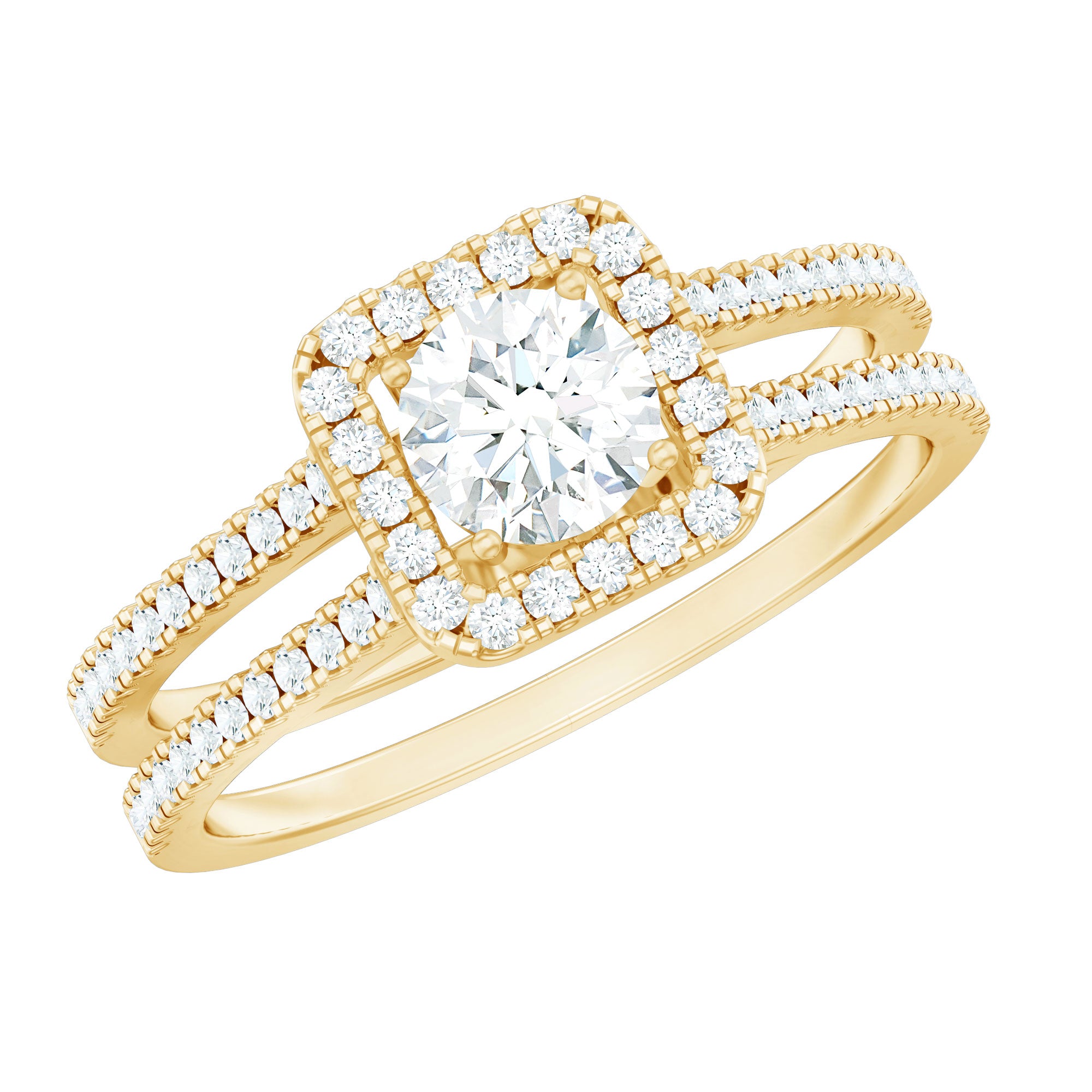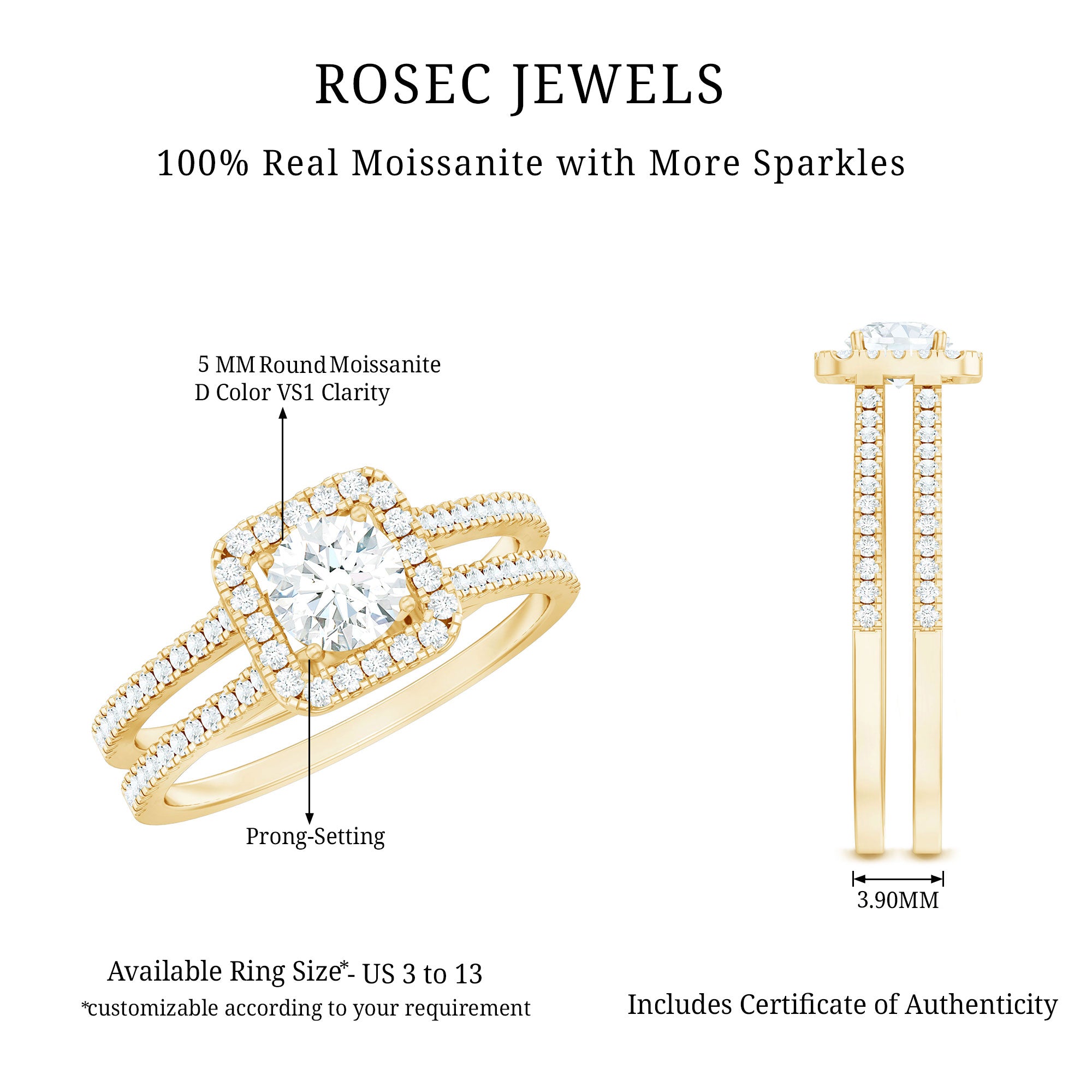 If you are on the hunt for a ring that embodies modern style, meaning, and a touch of sparkle, this Moissanite Engagement Ring is a fantastic choice. At its heart lies a stunning 5 MM Round Cut Moissanite, elegantly set in Prong Setting and encircled by a moissanite halo that radiates brilliance. What makes this ring unique is its Double Band design, embellished with glittering Round Shape Moissanite stones. The combination of the double band and halo results in a look that is both distinctive and timeless, striking a perfect balance between boldness and sophistication. With a total weight of Half Carat, the center stone boasts D Color VS1 Clarity. The gemstones has been certified and put through strict quality checks. This Halo Engagement Ring is ideal for someone who appreciates a blend of classic and contemporary styles. Available in US sizes 3 to 13, this Round Moissanite Ring is designed for a perfect fit and everyday comfort. Whether you are planning a proposal or gifting it as a cherished present, it arrives in a beautiful jewelry box, ready to create a memorable moment.