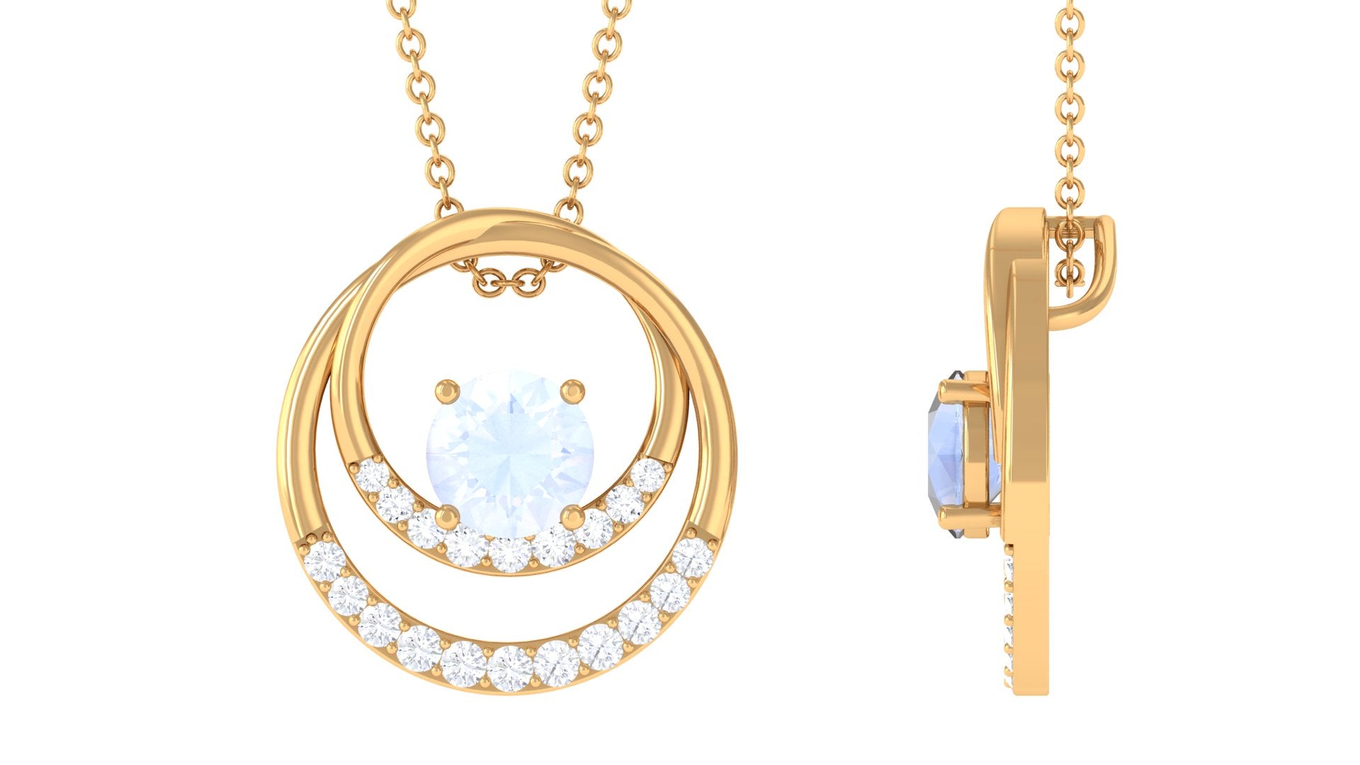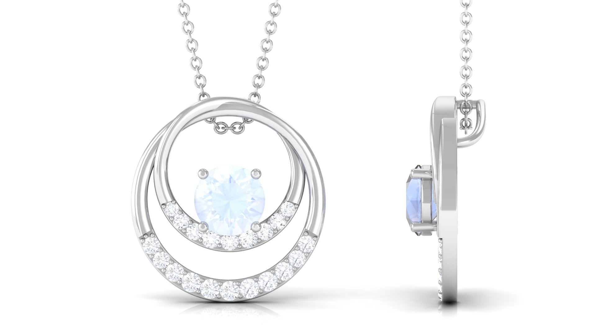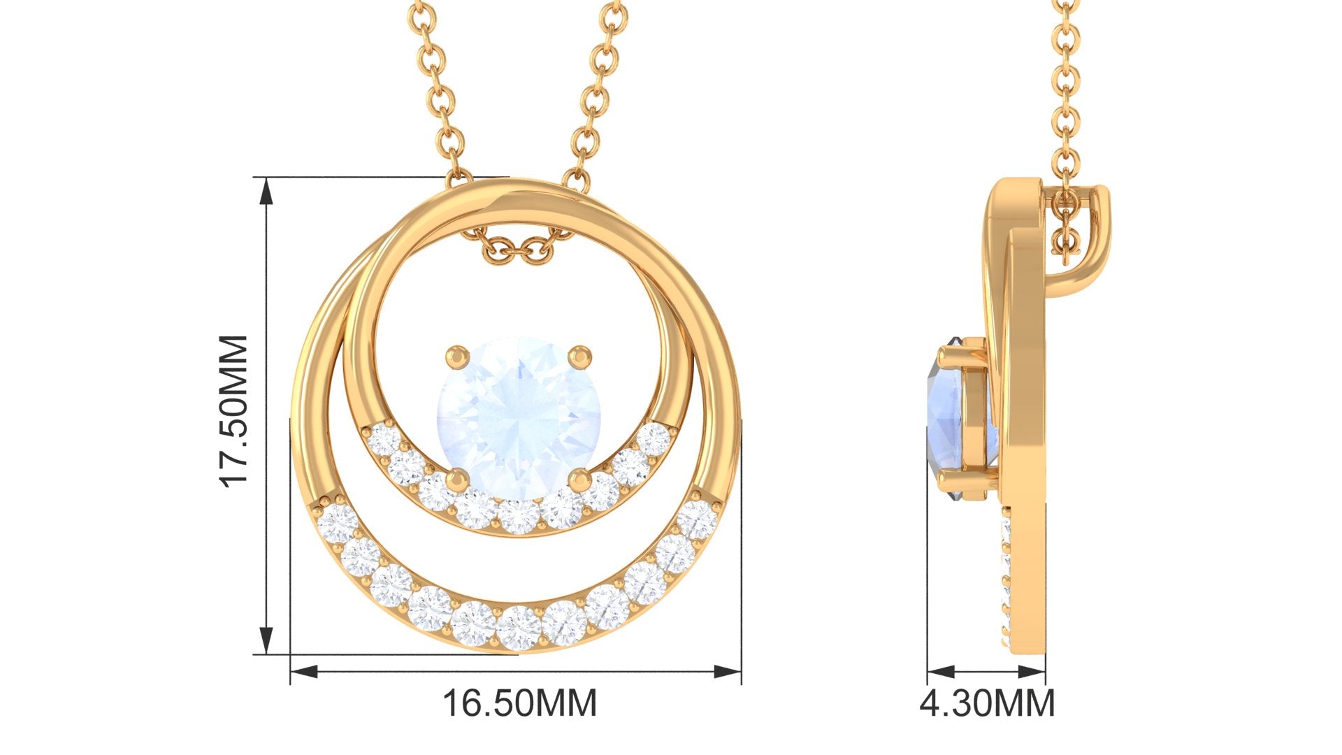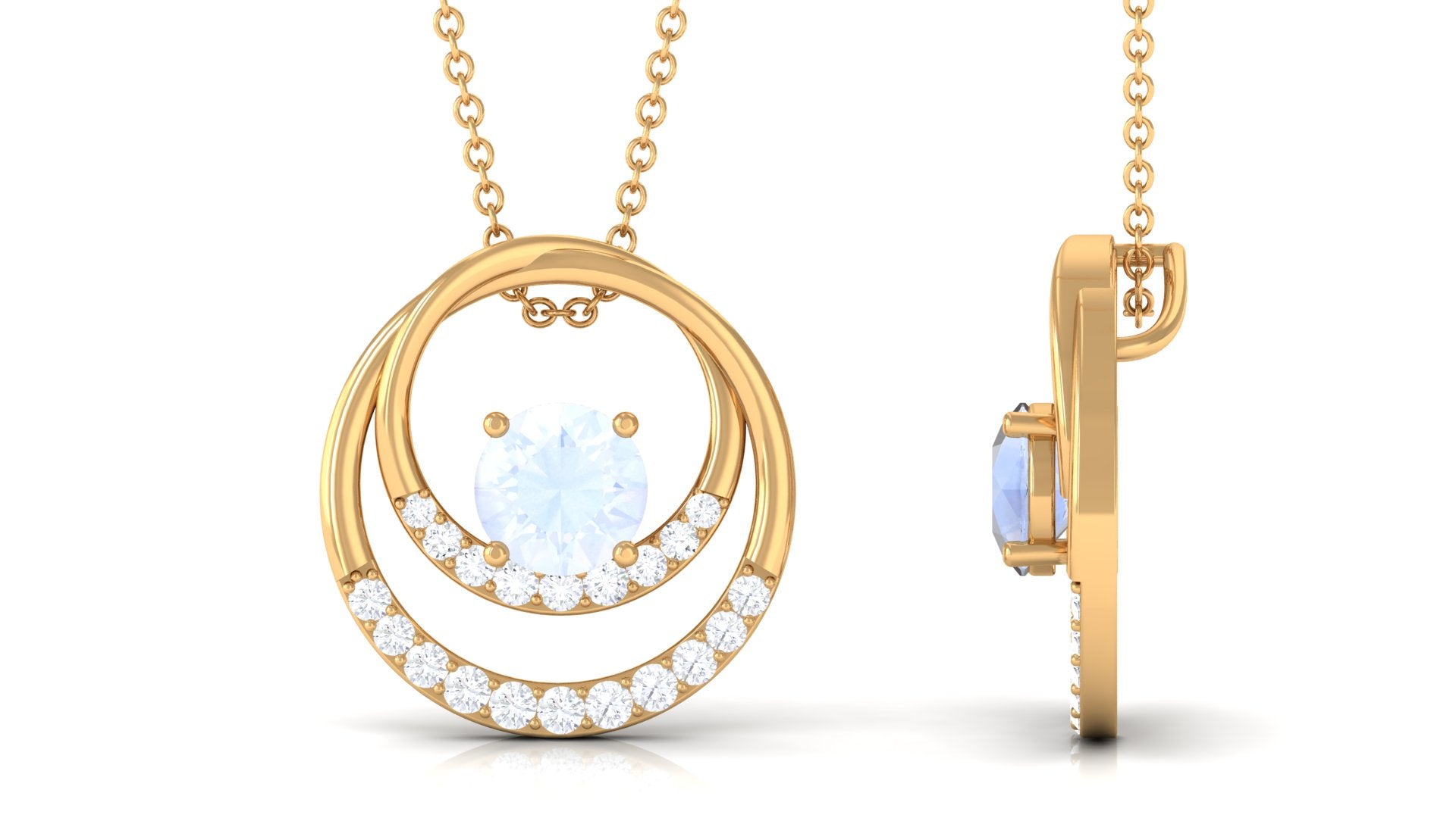A round moonstone is set in the center of this open circle pendant that looks minimal yet alluring. Shimmering round Diamond decorates the interlocked circle frame in a modern fashion. The moonstone is held in a prong setting and exhibits an opalescence hue that draws the eye. It is connected to a hidden bale that adds a bit of mystery and excitement to this scintillating pendant design.