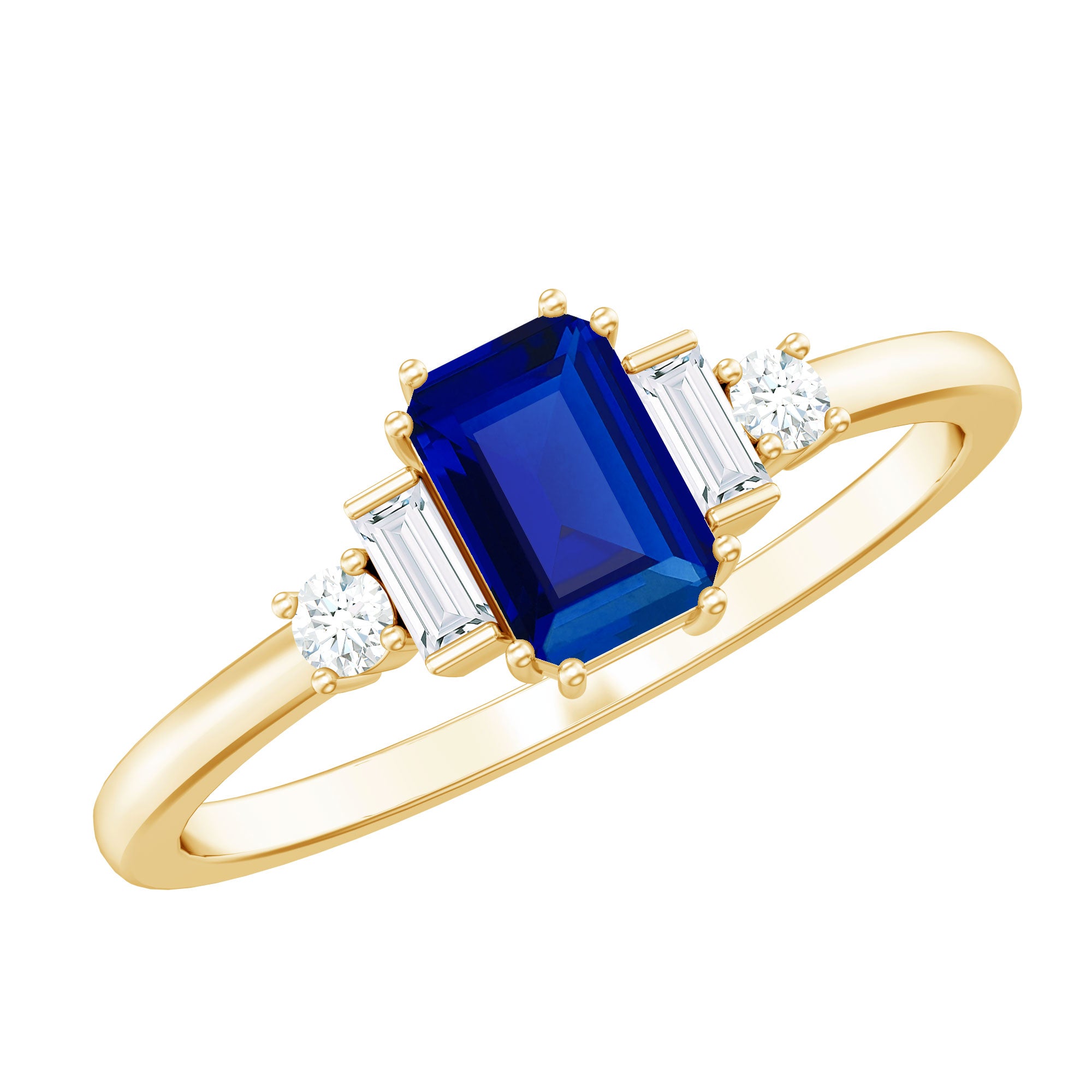 Elevate your style with this exquisite Minimal Ring, adorned with an Octagon Cut Created Blue Sapphire Solitaire in a secure Prong Setting and Diamond Side Stones. This Created Blue Sapphire Ring is an excellent choice for an Engagement Ring, if youre in the market for one.