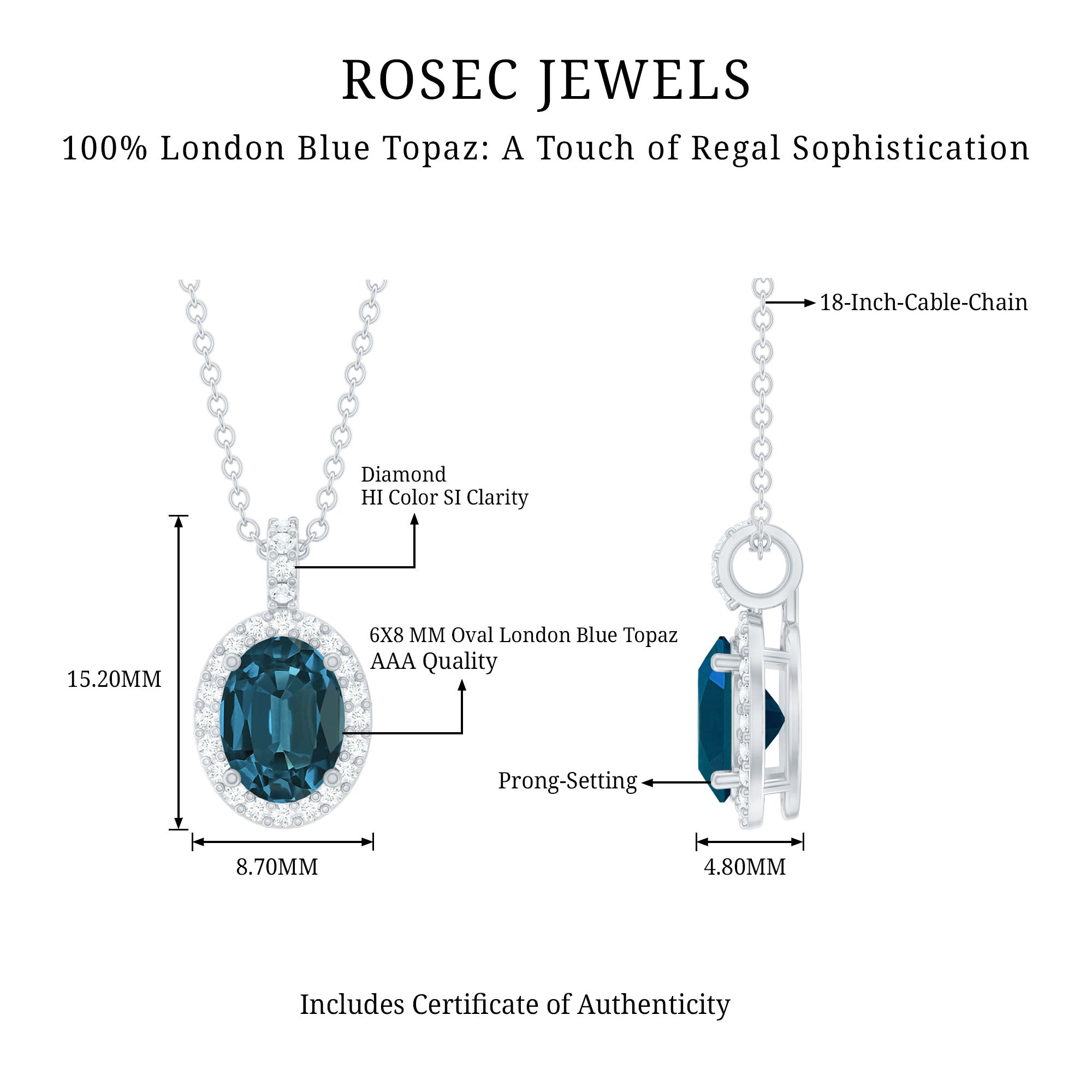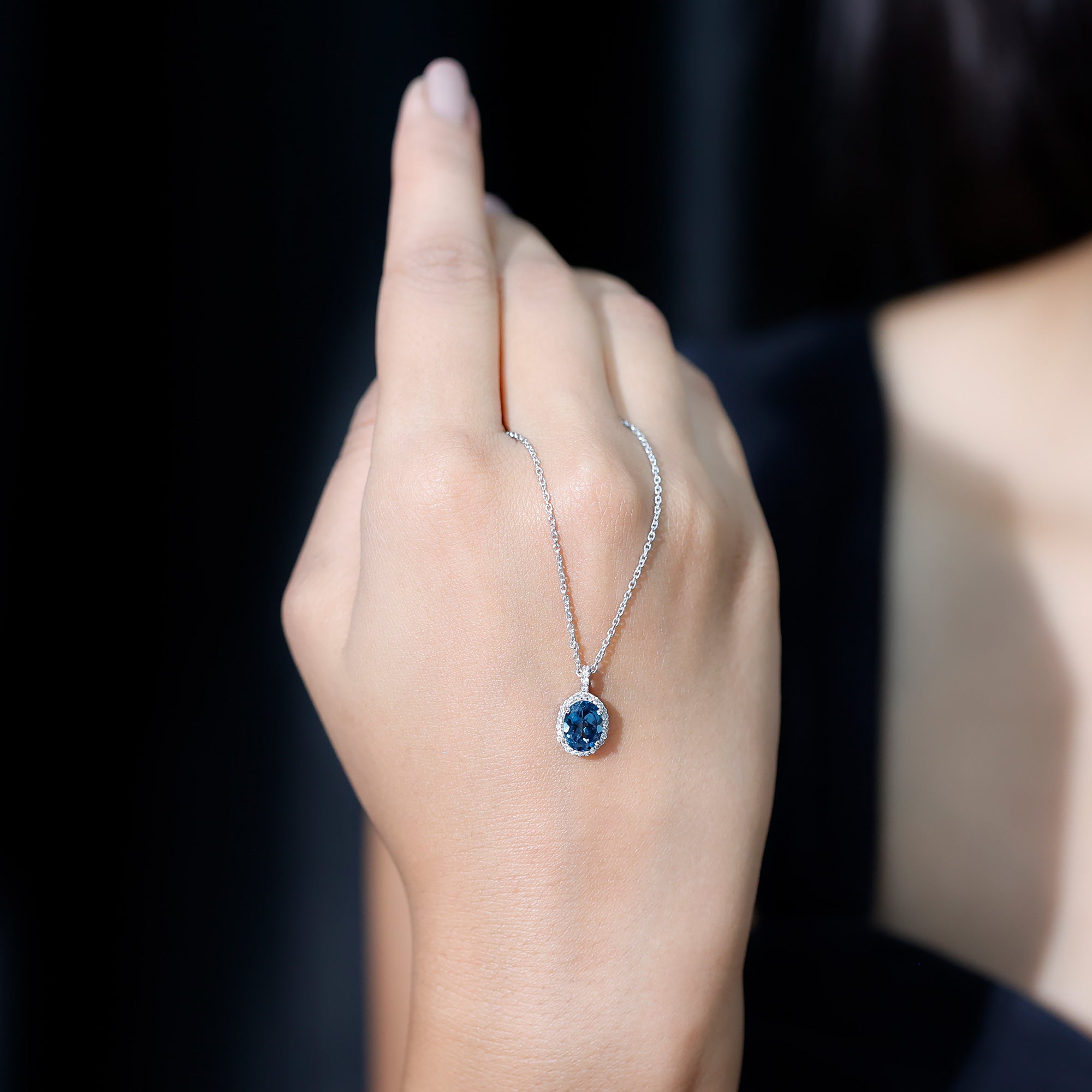 A rich splash of blue can instantly brighten your look, and this London Blue Topaz Pendant brings that beauty to life in the most stunning way. At the center of the Classic Necklace rests a striking 6X8 MM oval London Blue Topaz, held securely in prong setting. Surrounding the gemstone is a sparkling halo of round diamonds, adding brilliance that catches the light with every small movement. The contrast between the vivid topaz and the shimmering diamonds creates a glowing and eye-catching design perfect for special occasions or elegant evenings. The Oval Halo Necklace hangs from a diamond-studded bail, which adds even more sparkle, and is paired with a smooth cable chain that sits comfortably around the neck. Its timeless style makes it easy to wear with party outfits, formal dresses, or even simple evening looks when you want a touch of luxury. Crafted with care and attention to detail, this London Blue Topaz and Diamond Necklace is designed to be treasured for years. Whether gifted to someone special or added to your own collection, it brings color, shine, and sophistication to every moment.