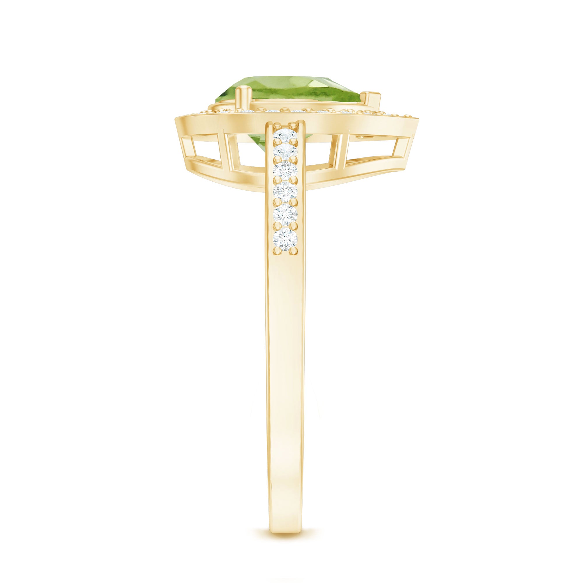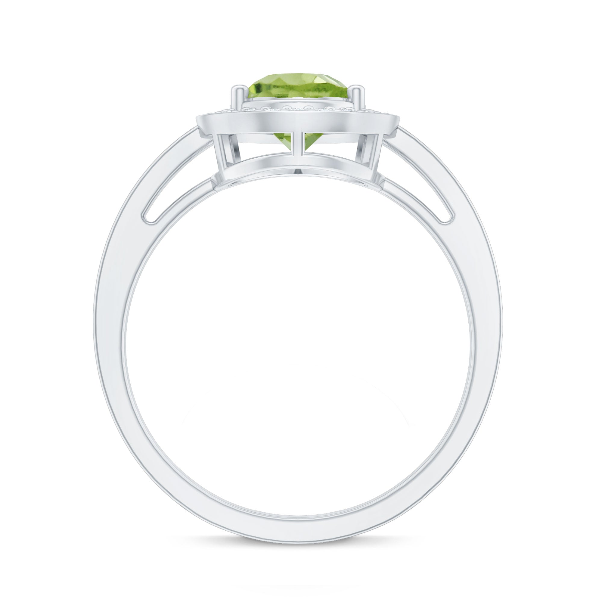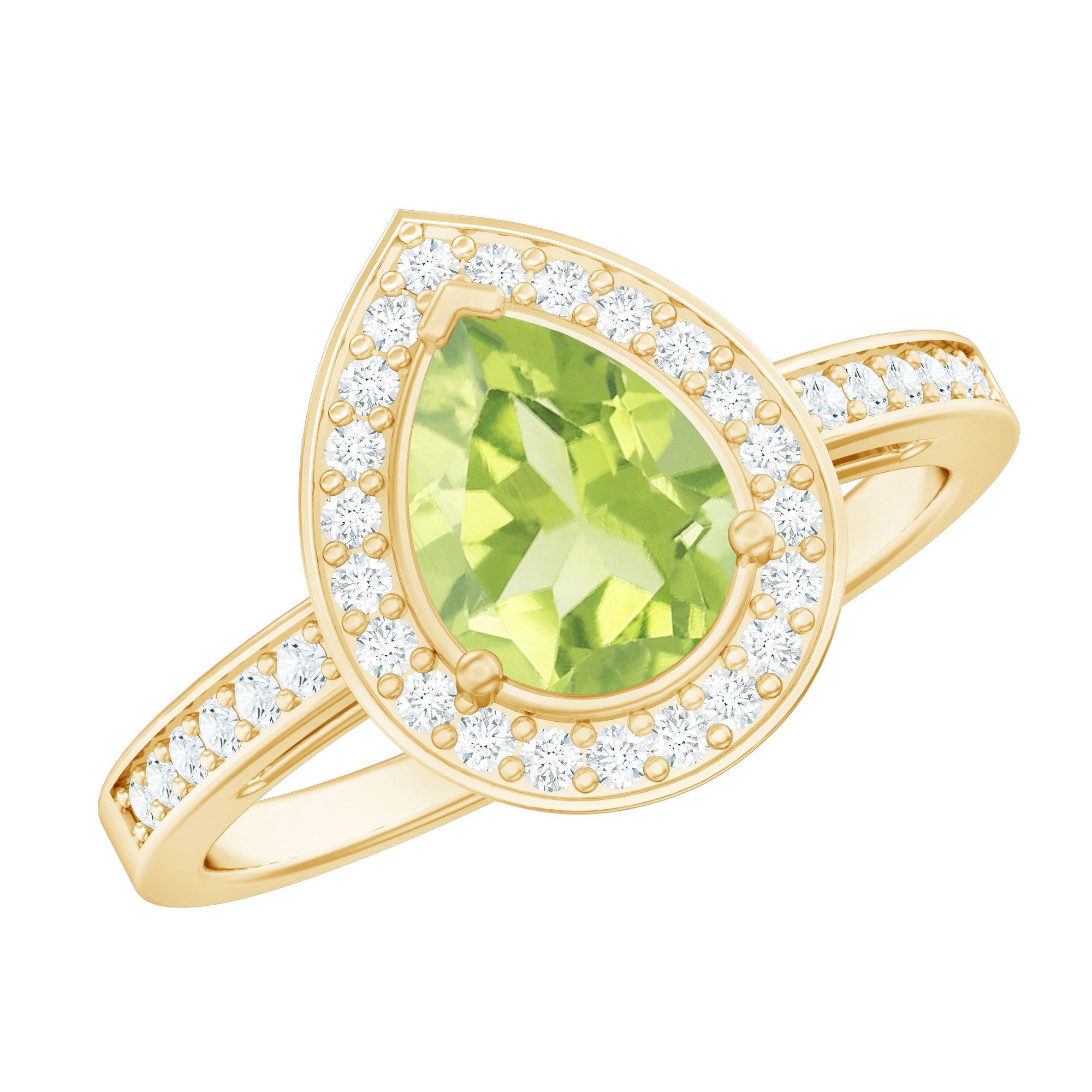 Get this alluring Peridot Engagement Ring adorned with Pear Cut Peridot in Prong Setting and more dainty Round Shape Diamonds studded as Halo and on the shank. The Peridot Ring will make her look elegant when paired with special attires. Declare your feelings for your partner by getting this Halo Ring and she will find reasons to wear it again and again.