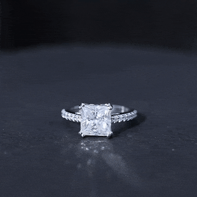 Celebrate the one of a kind love that you two share with a Moissanite Solitaire Ring. Weighing a whopping 3 CT, it highlights the Center Stone of 8 MM Princess Cut Moissanite that is held tightly by Peg head Setting. Lending this Moissanite Engagement Ring more character are the side-stones of Round Cut Moissanite in Double Prong Setting. Grab this Square Engagement Ring which is a perfect blend of timeless and elegant style. Your lady will be astonished by the remarkable shine of D-VS1 quality Moissanites embedded in the ring. Mark the special day memorable forever with this Princess Cut Engagement Ring precisely crafted by Rosec Jewels.