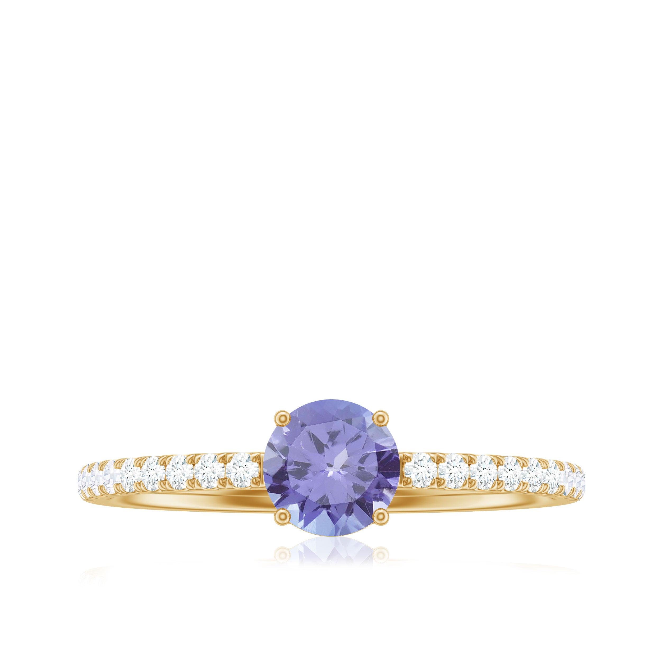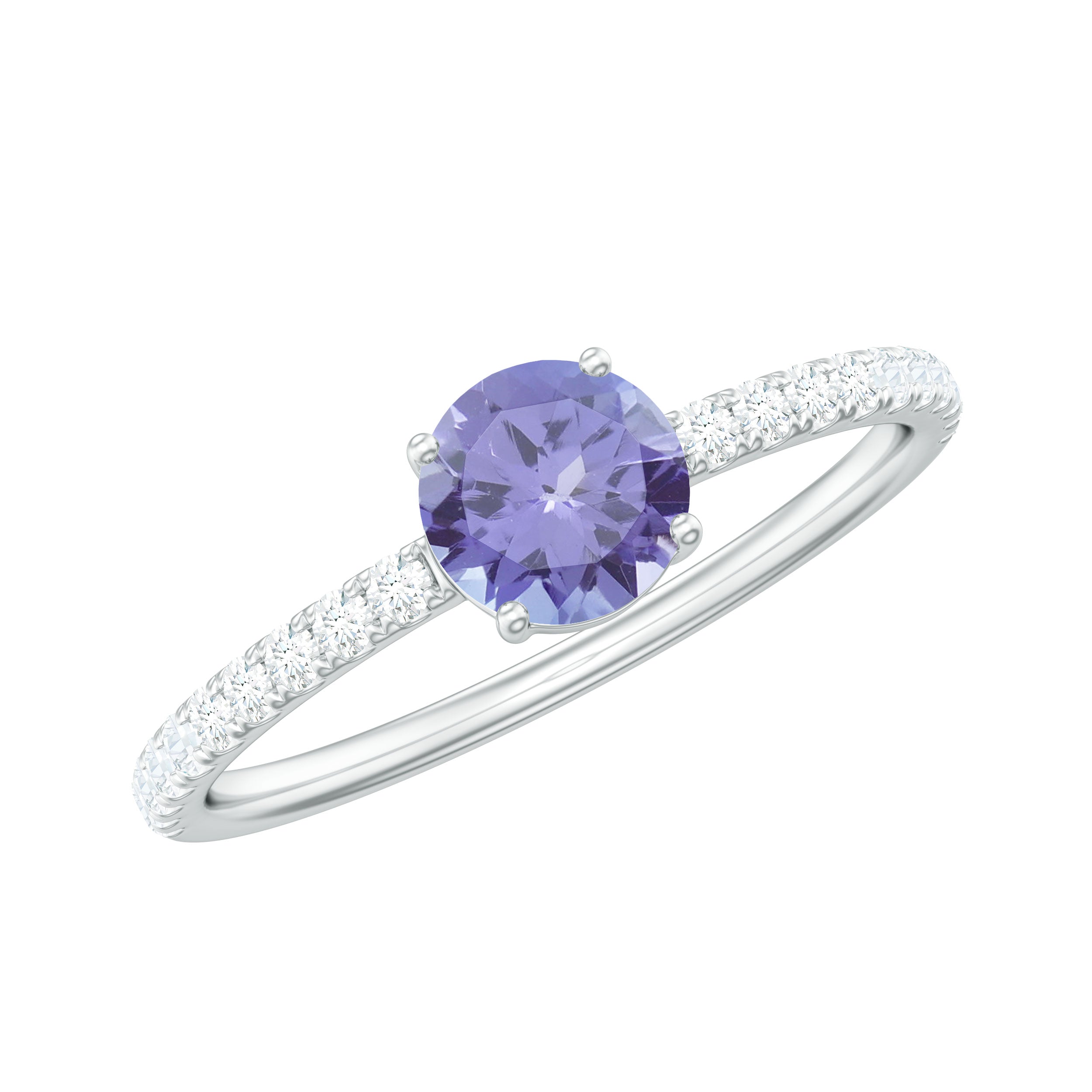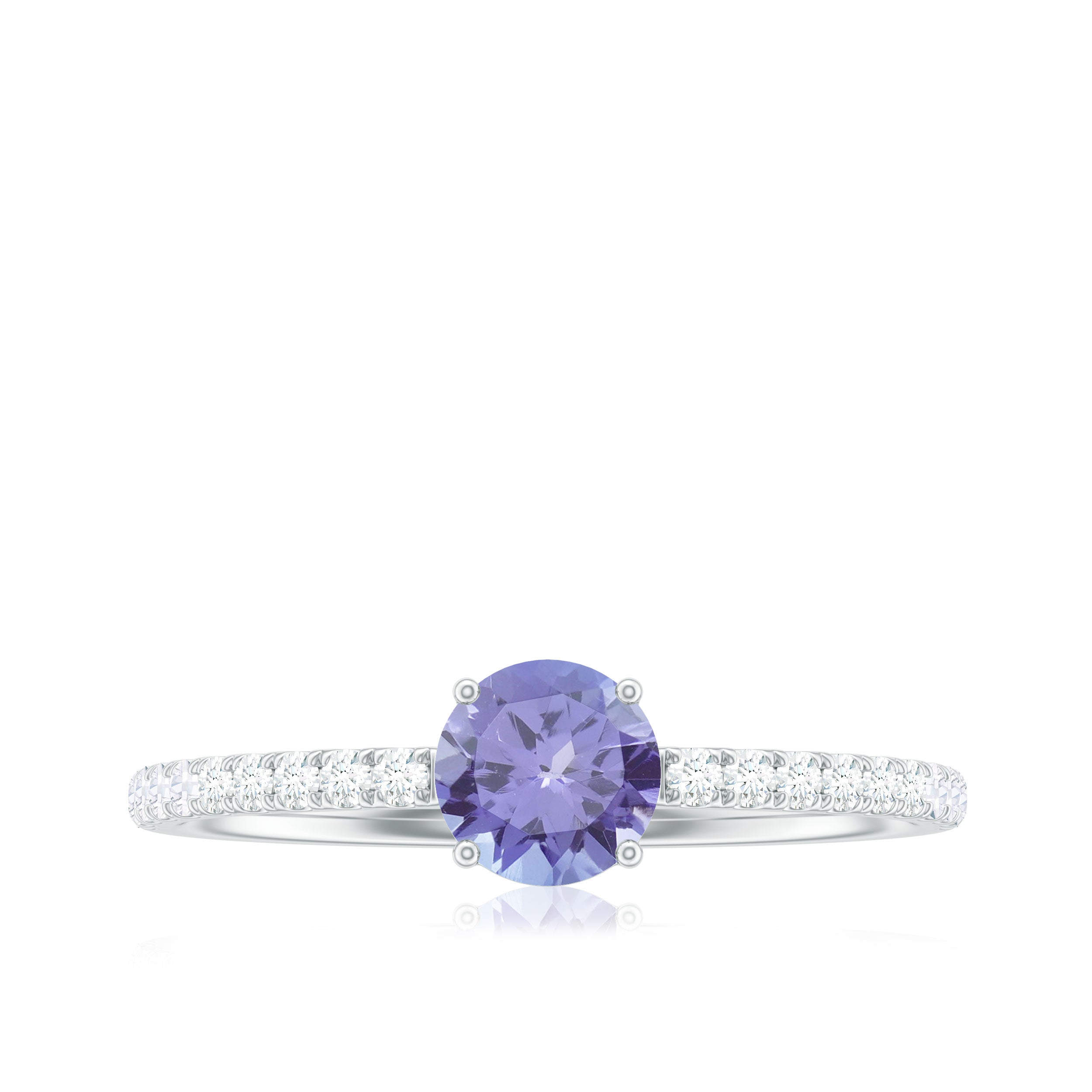 It is a Classic Ring for Women featuring Round Shape Tanzanite as Solitaire embellished in Prong Setting with Round Shape Diamond stones as Side Stones embellished in Pave Setting.