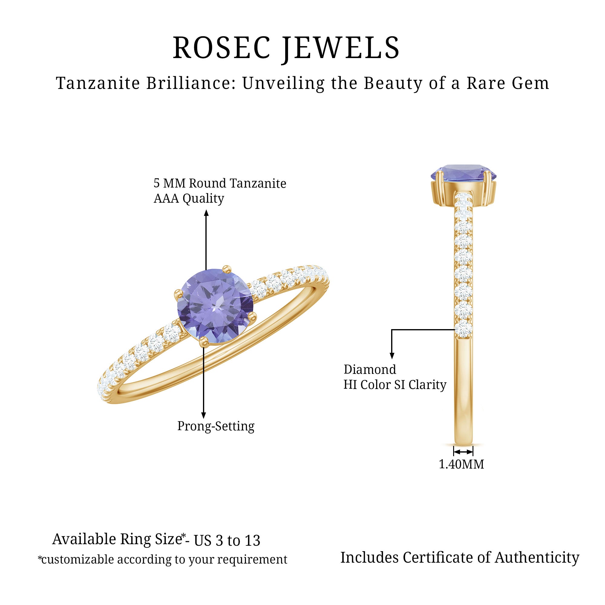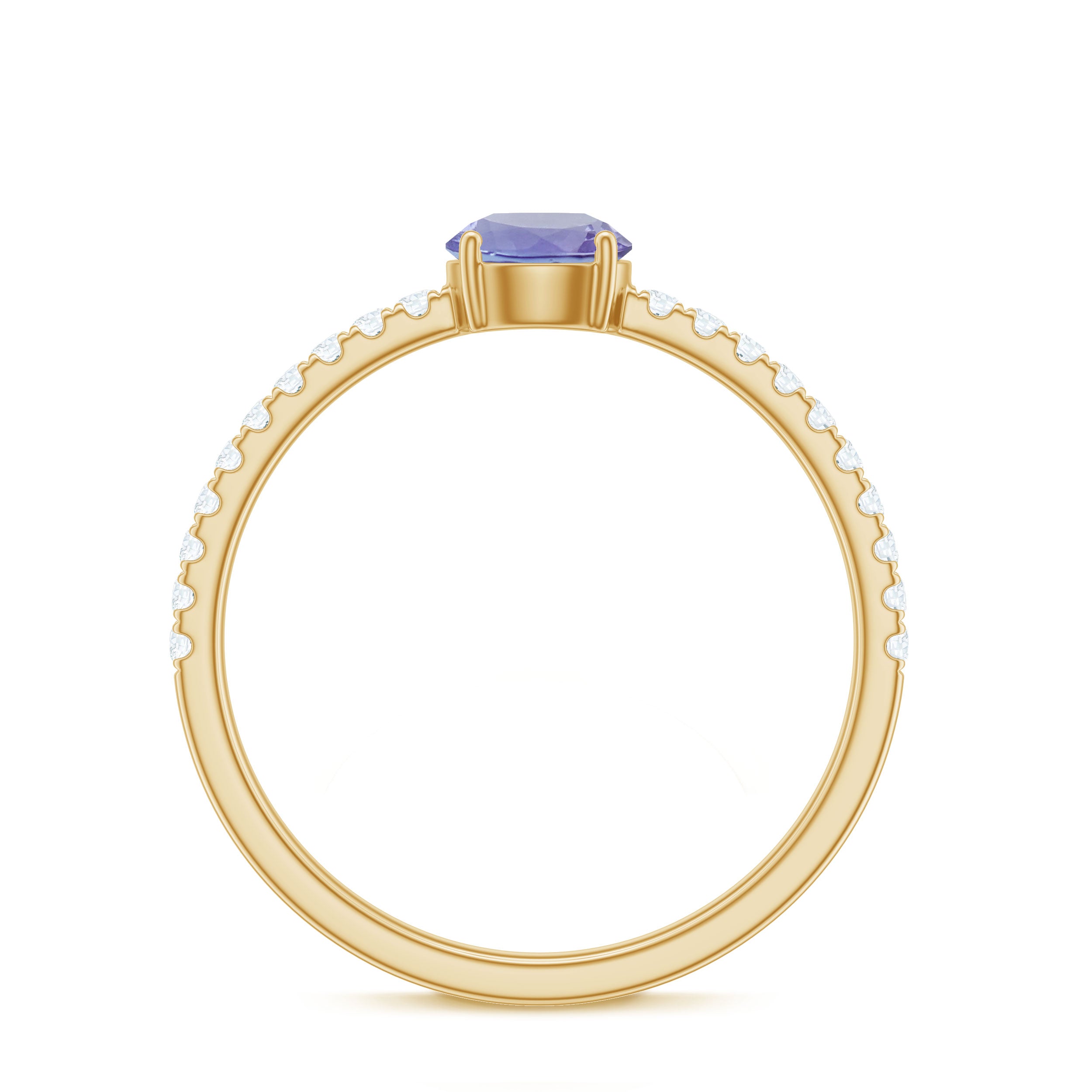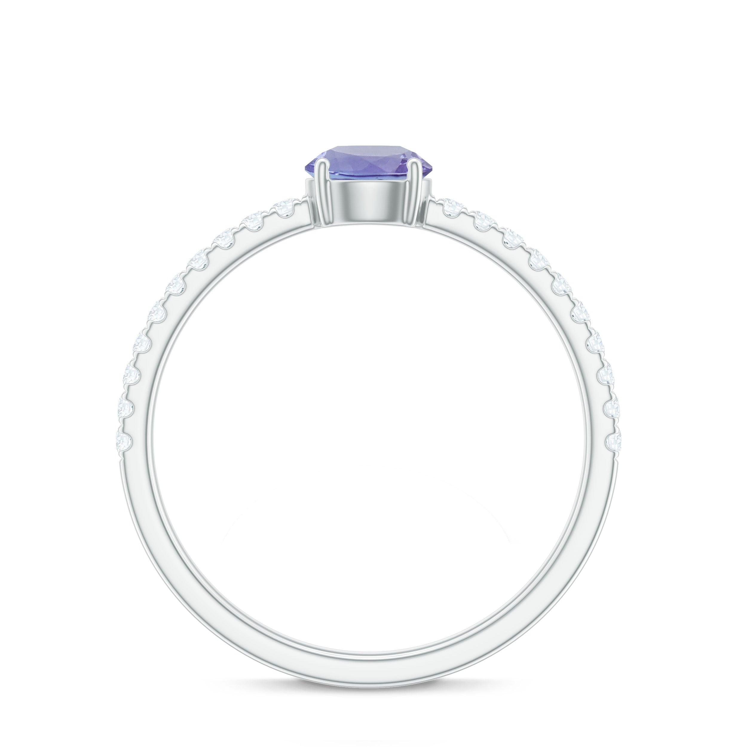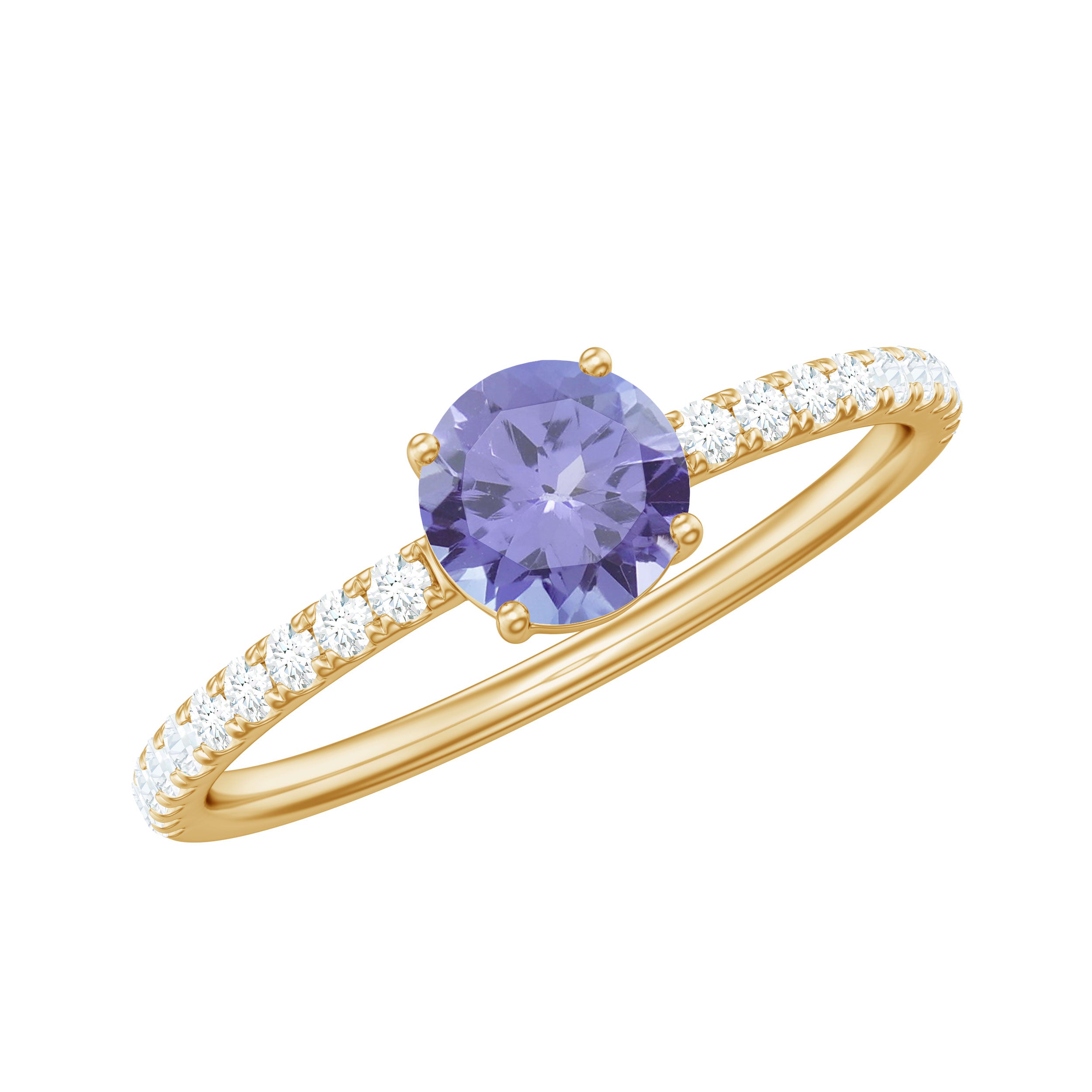 It is a Classic Ring for Women featuring Round Shape Tanzanite as Solitaire embellished in Prong Setting with Round Shape Diamond stones as Side Stones embellished in Pave Setting.