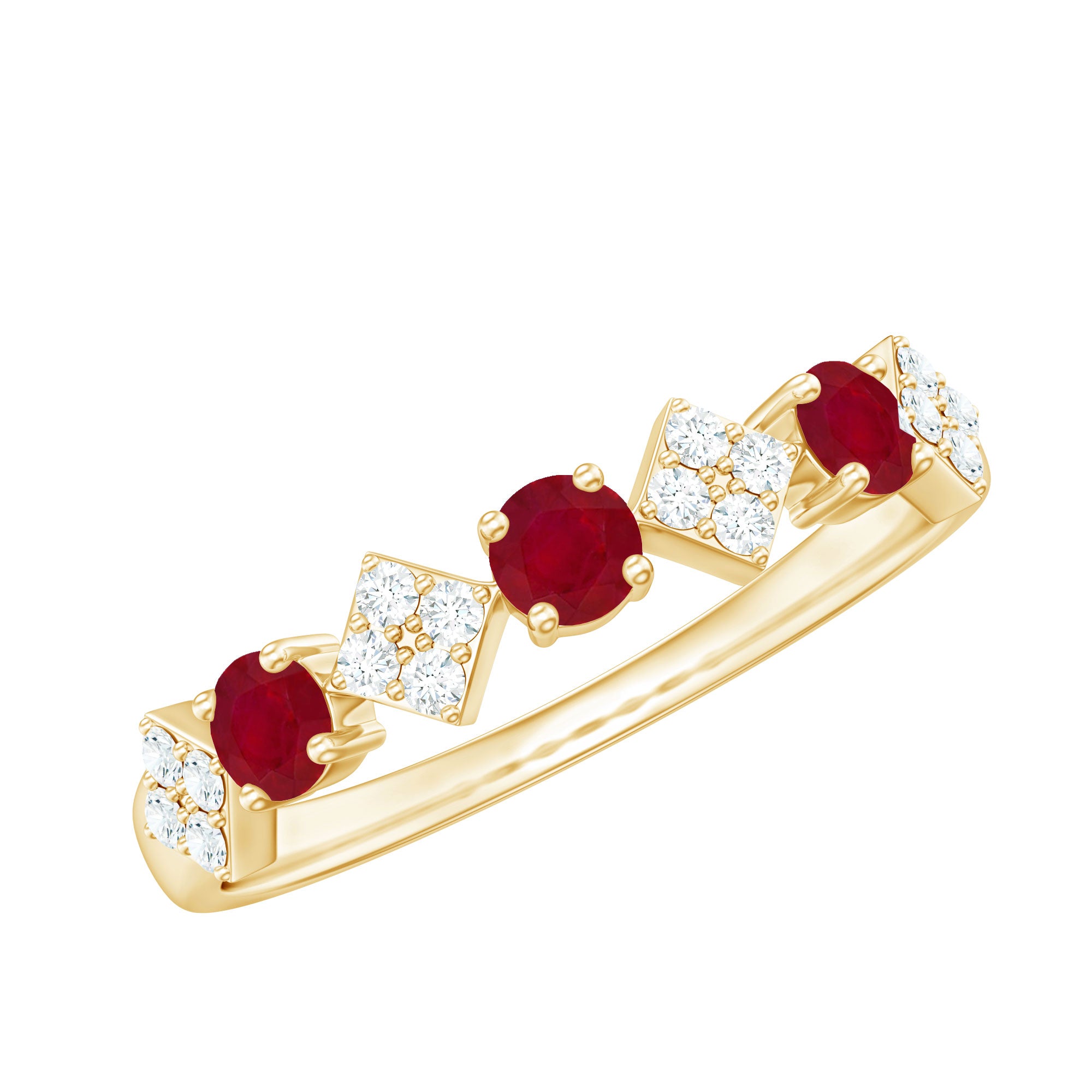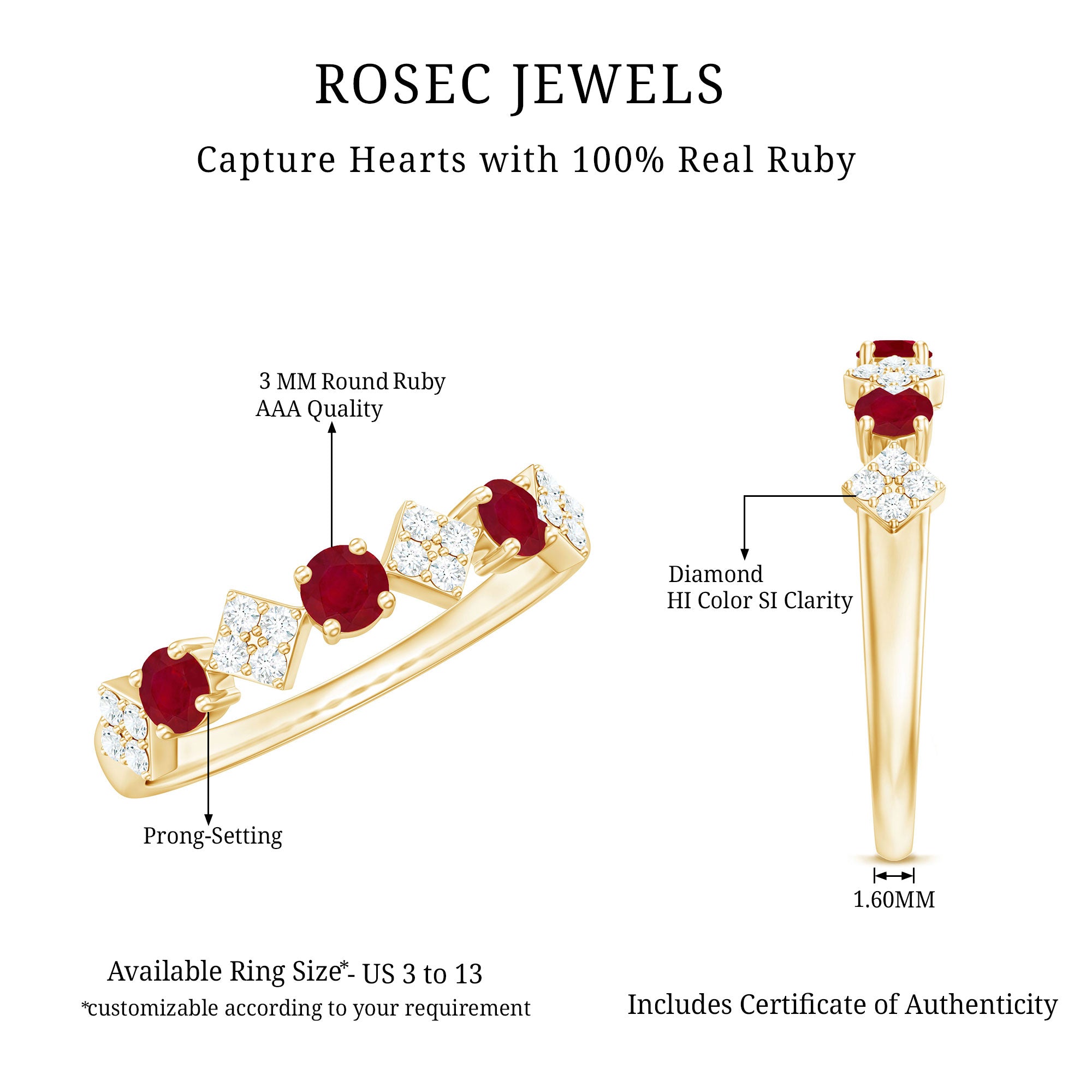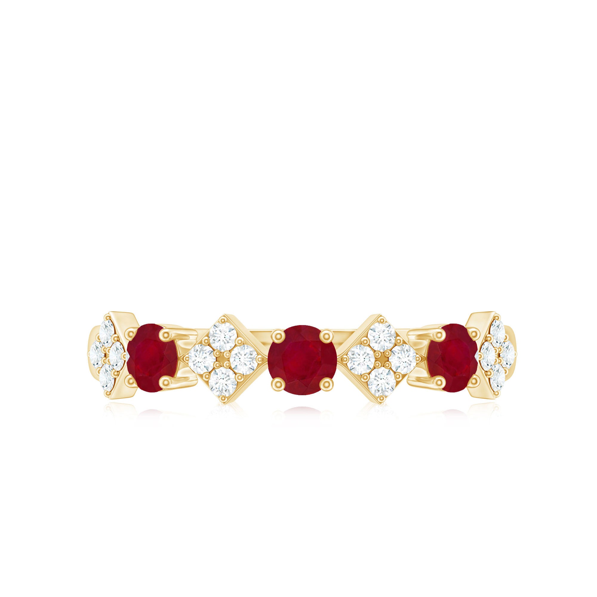 Synonymous with romantic, this Ruby Half Eternity Ring is all you need to speak the virtual language of love. Taking their turns at wooing us over, the stones of Round Shape Ruby and Diamond are set in an alternating pattern half way through the band, both secured by Prong Setting. Flaunted solo or stacked up with your favorite rings, this Certified Semi Eternity Ring wont fail to make a befitting statement.
