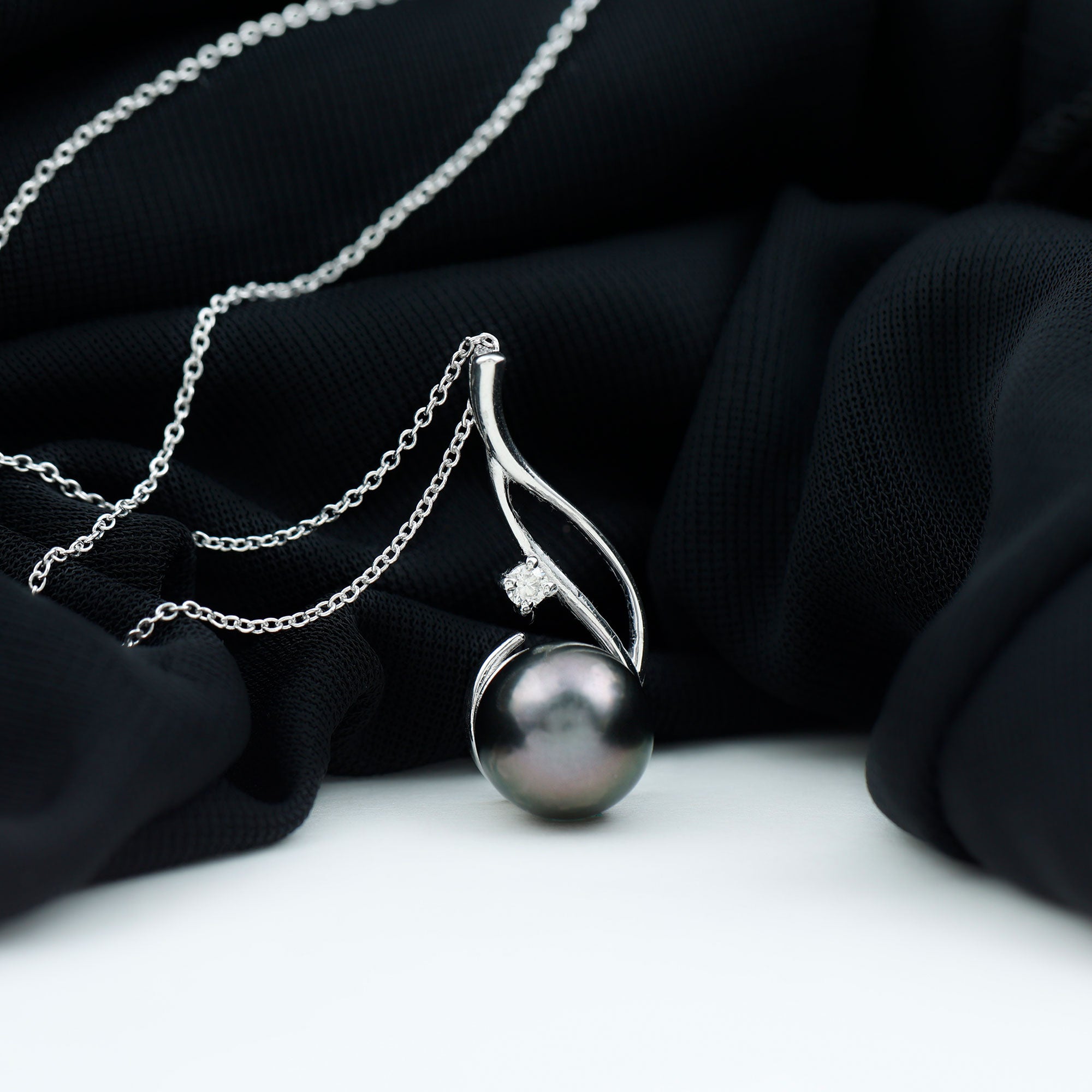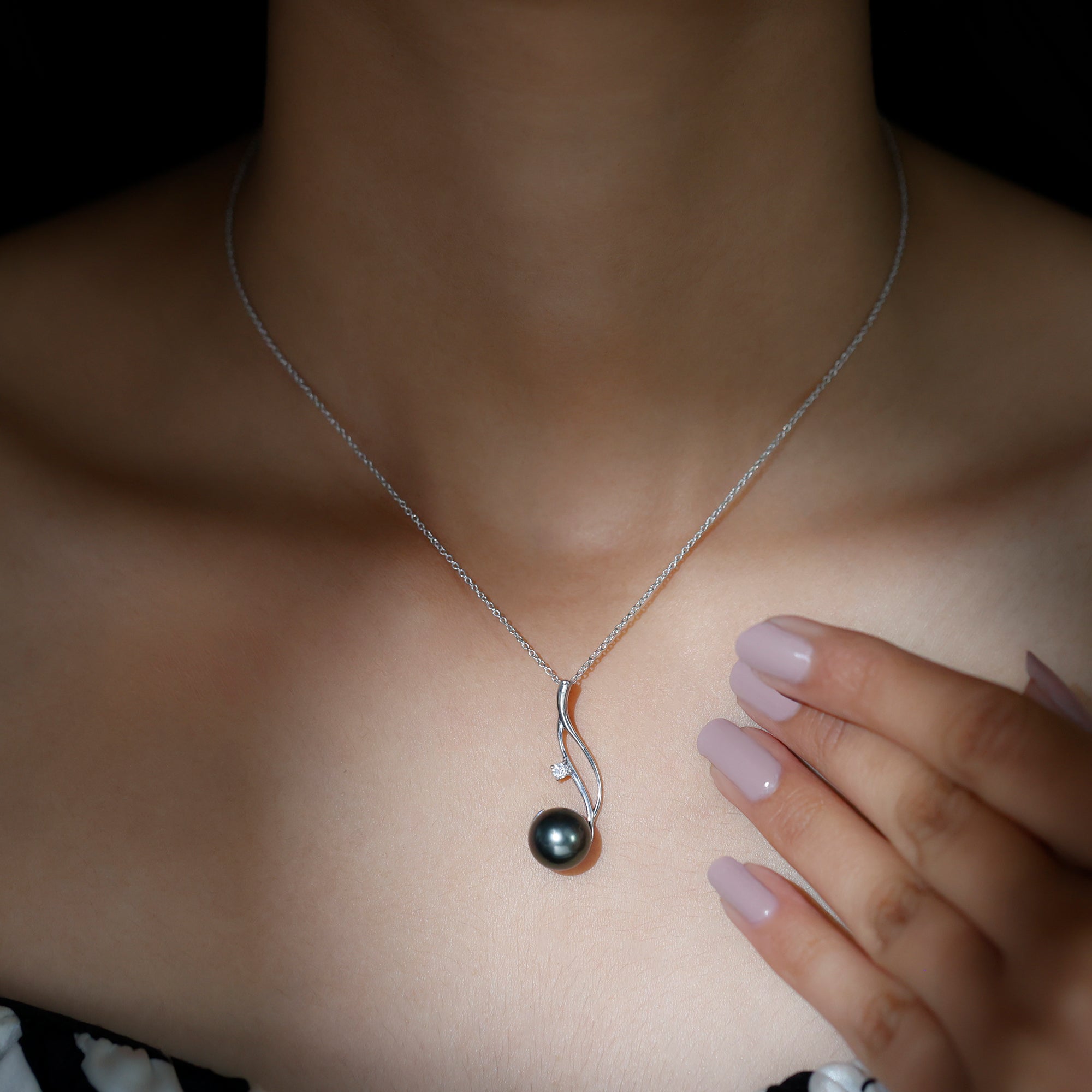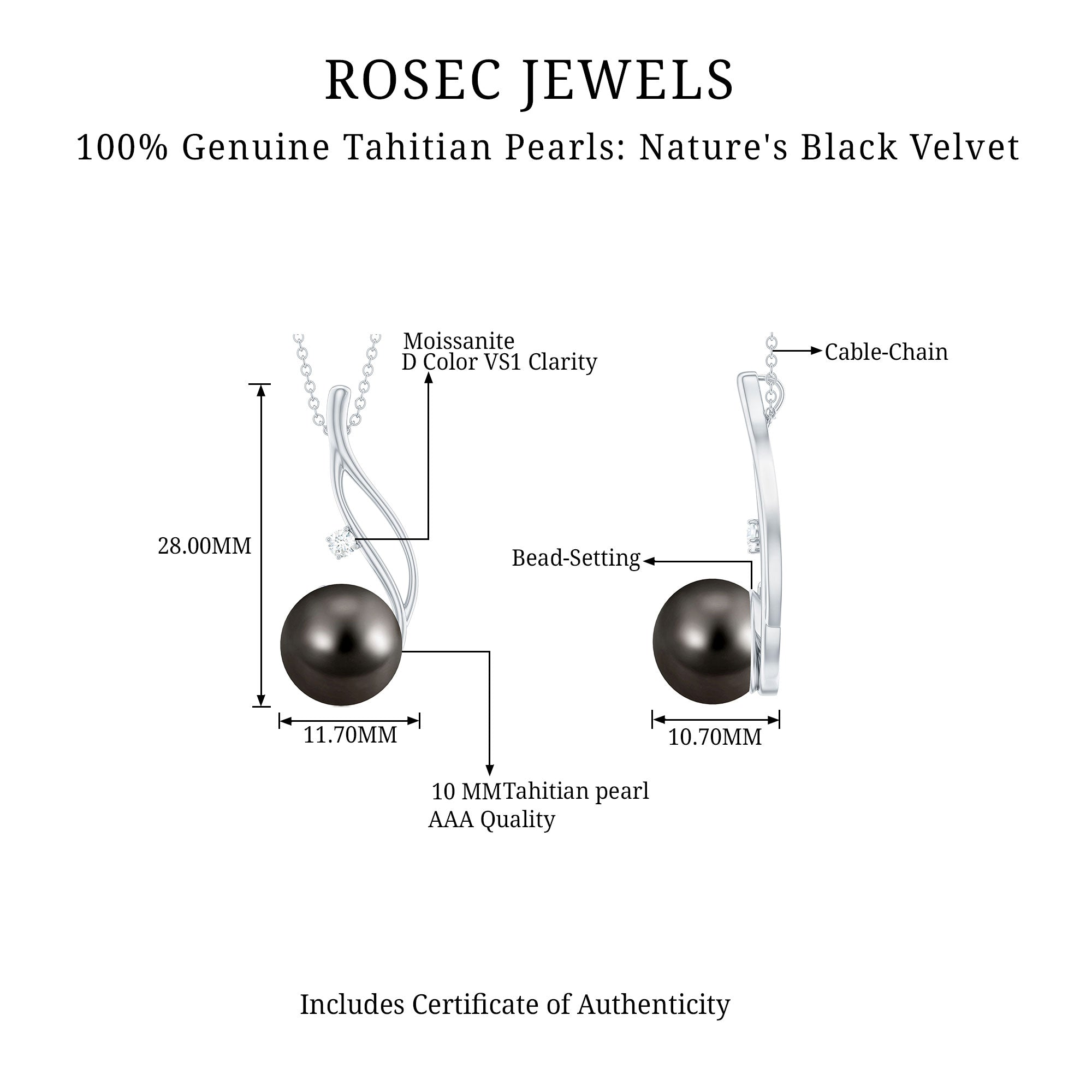 Enrich your jewelry assortment and earn compliments by adding this exquisite Minimal Pendant. The drop pendant features a 10 MM round-shaped Tahitian Pearl set in bead style, adorned with sparkling round Moissanite stones, all enclosed in a solid gold crafted casing. Its a stunning piece of jewelry that will surely catch everyones attention.
