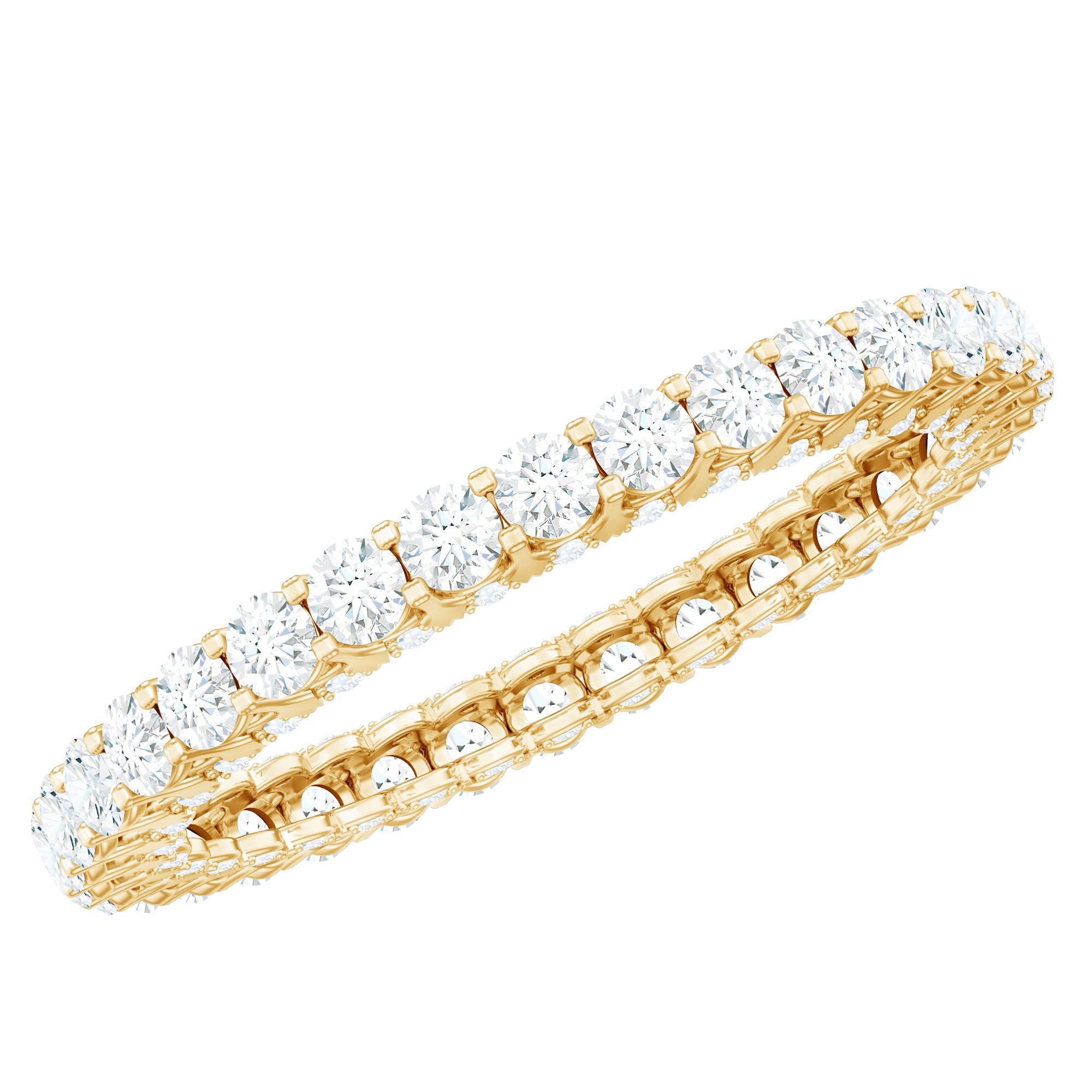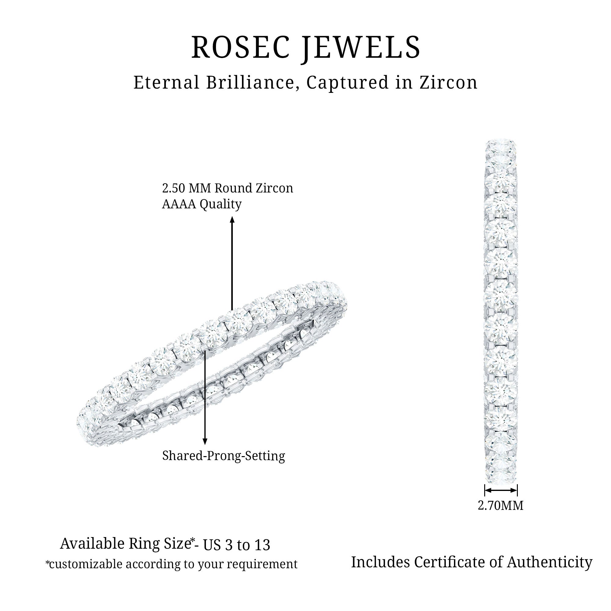 Add some more sparkle to your daily wear with our Classic Full Eternity Ring, adorned with brilliant round Zircon gemstones meticulously set in a shared prong setting, accentuating their timeless beauty. This ring offers versatility with a selection of metal options, allowing you to personalize your piece to match your unique taste and style.