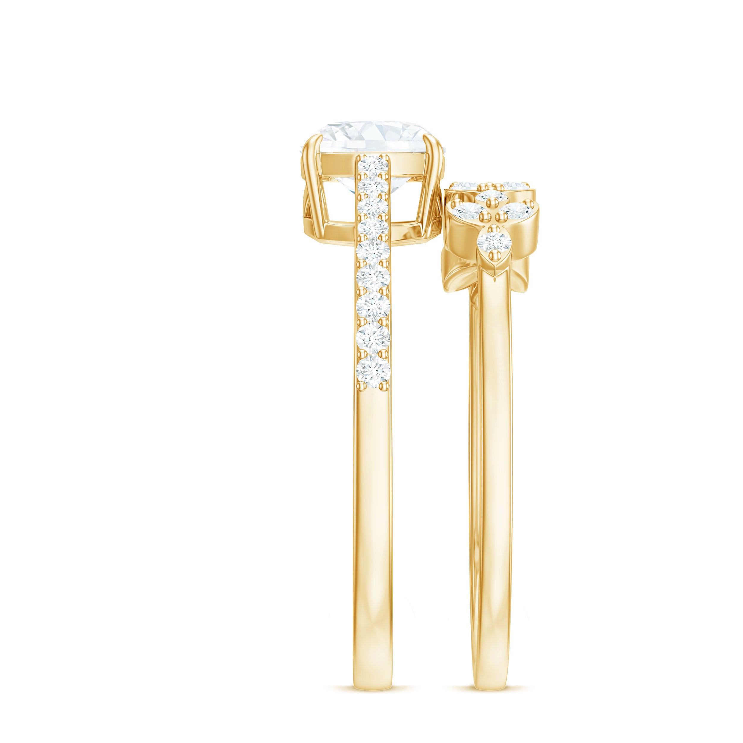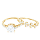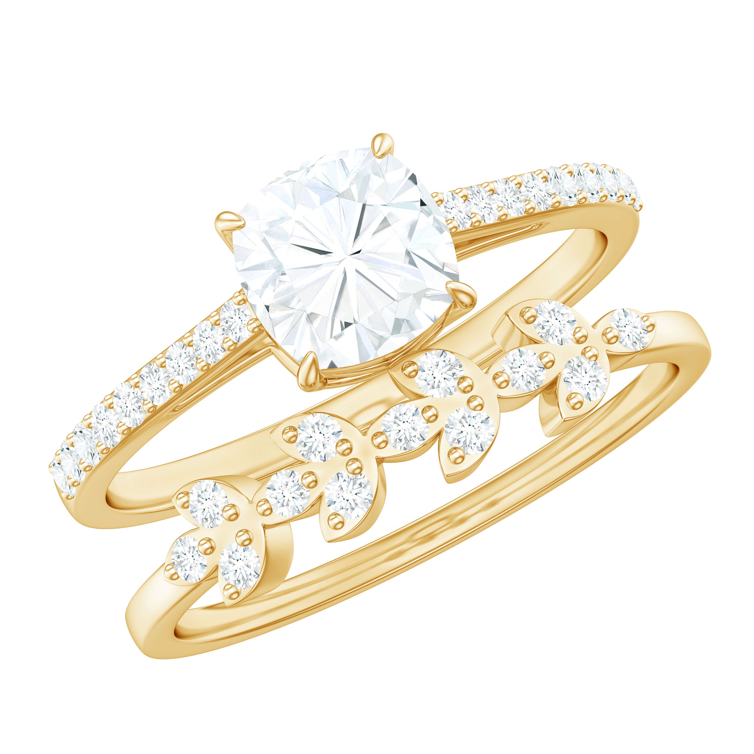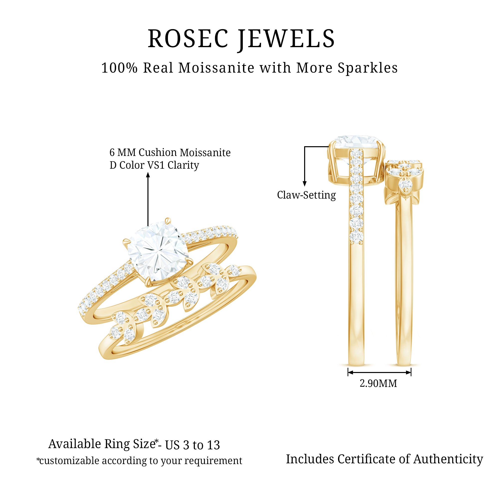 Designed to capture hearts and crafted to endure, this Moissanite Bridal Ring Set blends timeless beauty with a touch of modern artistry. This ring set of 2 includes a captivating Solitaire Engagement Ring and a Leaf Inspired Wedding Band, seamlessly paired for an elegant, romantic look. At the center of the engagement ring lies a dazzling 6 MM Cushion Cut Moissanite, set in claw setting that showcases its fire and brilliance from every angle. Delicate side stones are thoughtfully set along the band, adding subtle sparkle that enhances the bold centerpiece. Completing the Solitaire Wedding Ring Set, the coordinating wedding band features graceful leaf motifs, each accented with round cut moissanite stones, symbolizing growth, harmony, and eternal love. The artistic design brings a nature-inspired charm that perfectly complements the engagement ring, creating a cohesive yet unique bridal look. Designed for comfort and daily wear, this Moissanite Engagement Ring Set offers a secure and elegant finish that feels as good as it looks. This Engagement Ring with Wedding Band Set arrives in a beautifully crafted jewelry box, ready to be gifted or cherished for a lifetime.