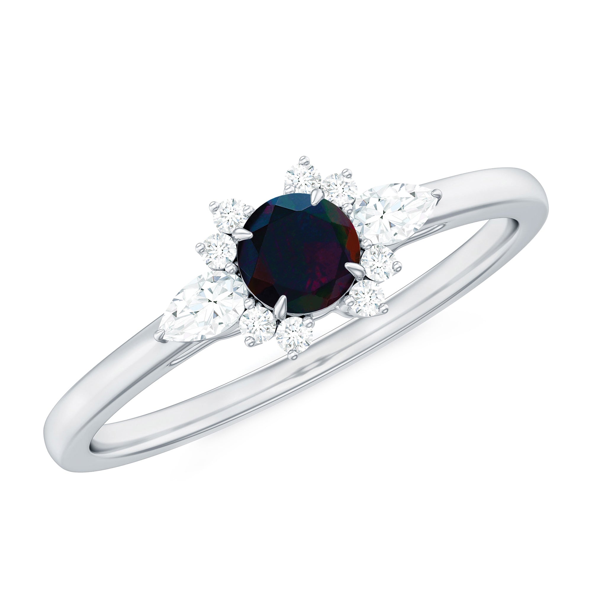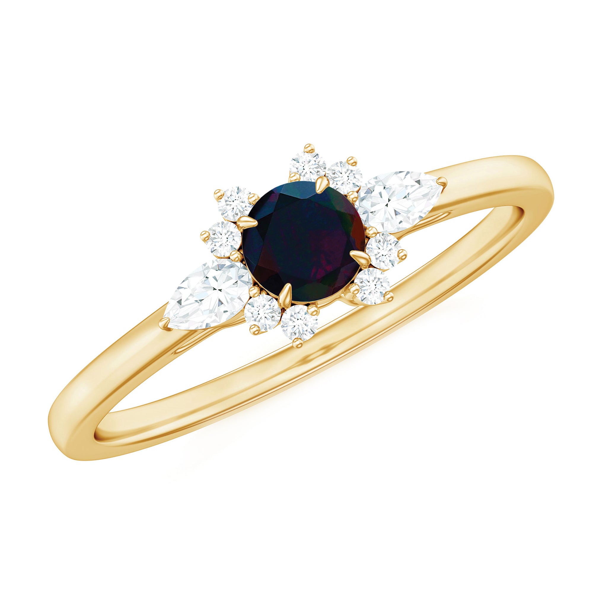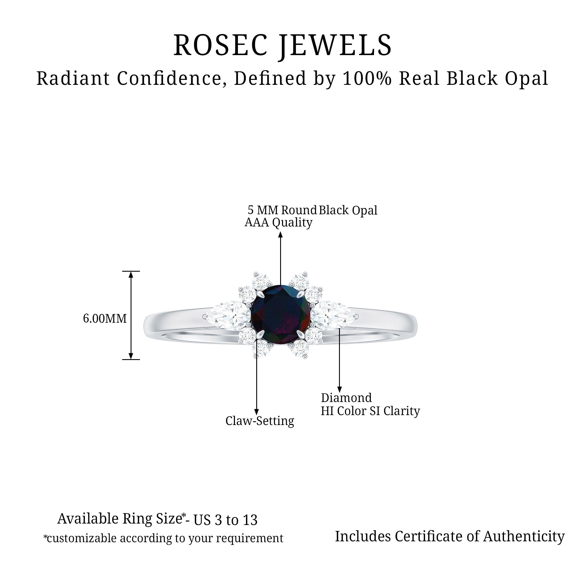 Give your beloved a delightful surprise with this exquisite Promise Ring adorned with a 4 MM Round Shape Black Opal in a claw setting, surrounded by pear and Round Shape Diamond Stones in a stunning halo design. Fashioned from Solid Gold, this gorgeous Promise Ring is the perfect gift for your special lady, sure to leave her feeling loved and cherished.