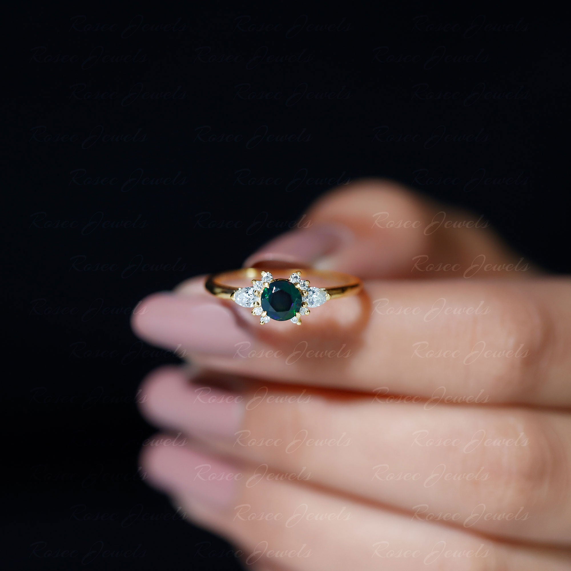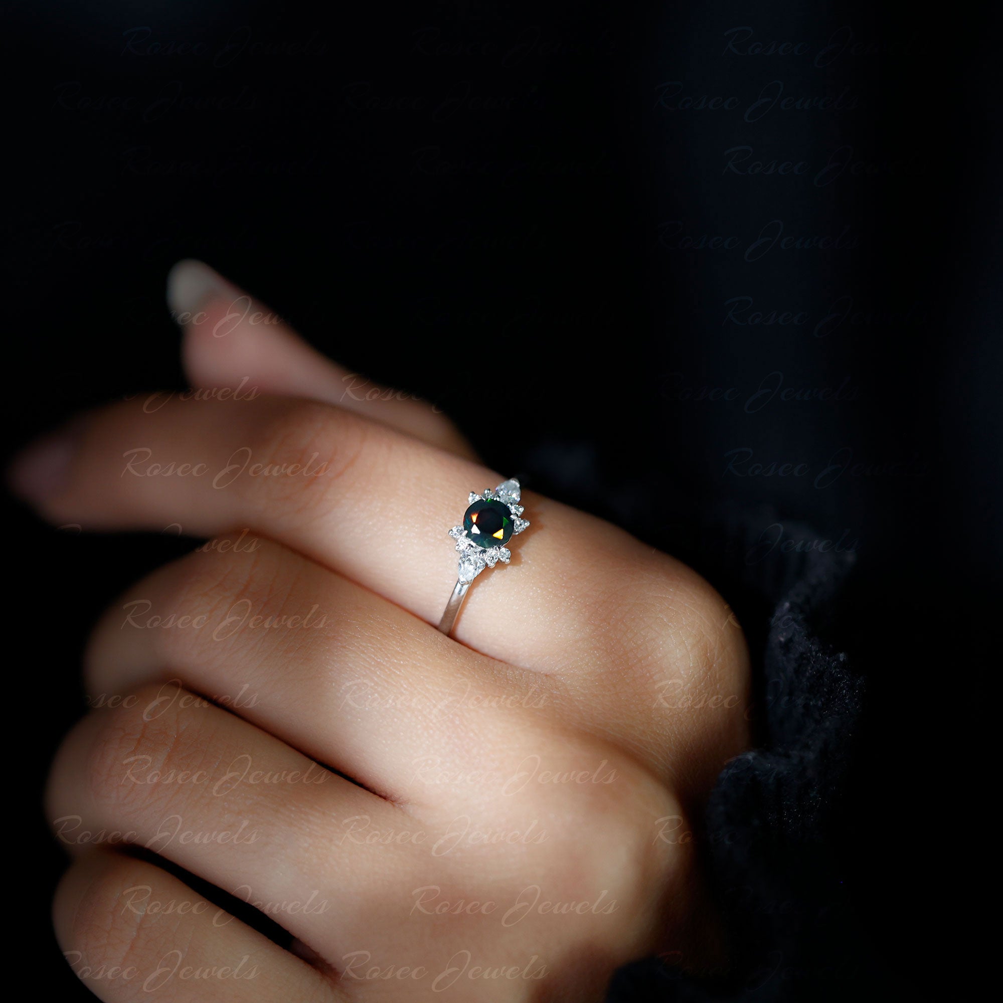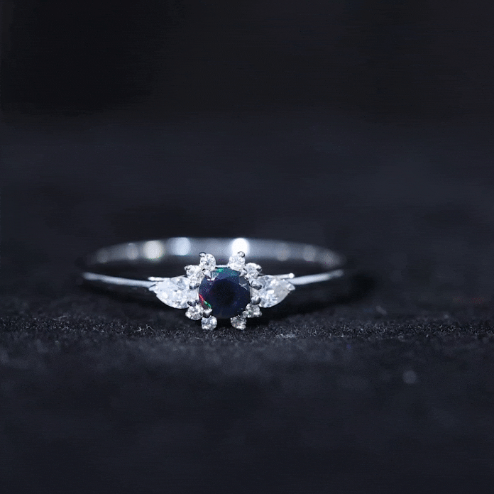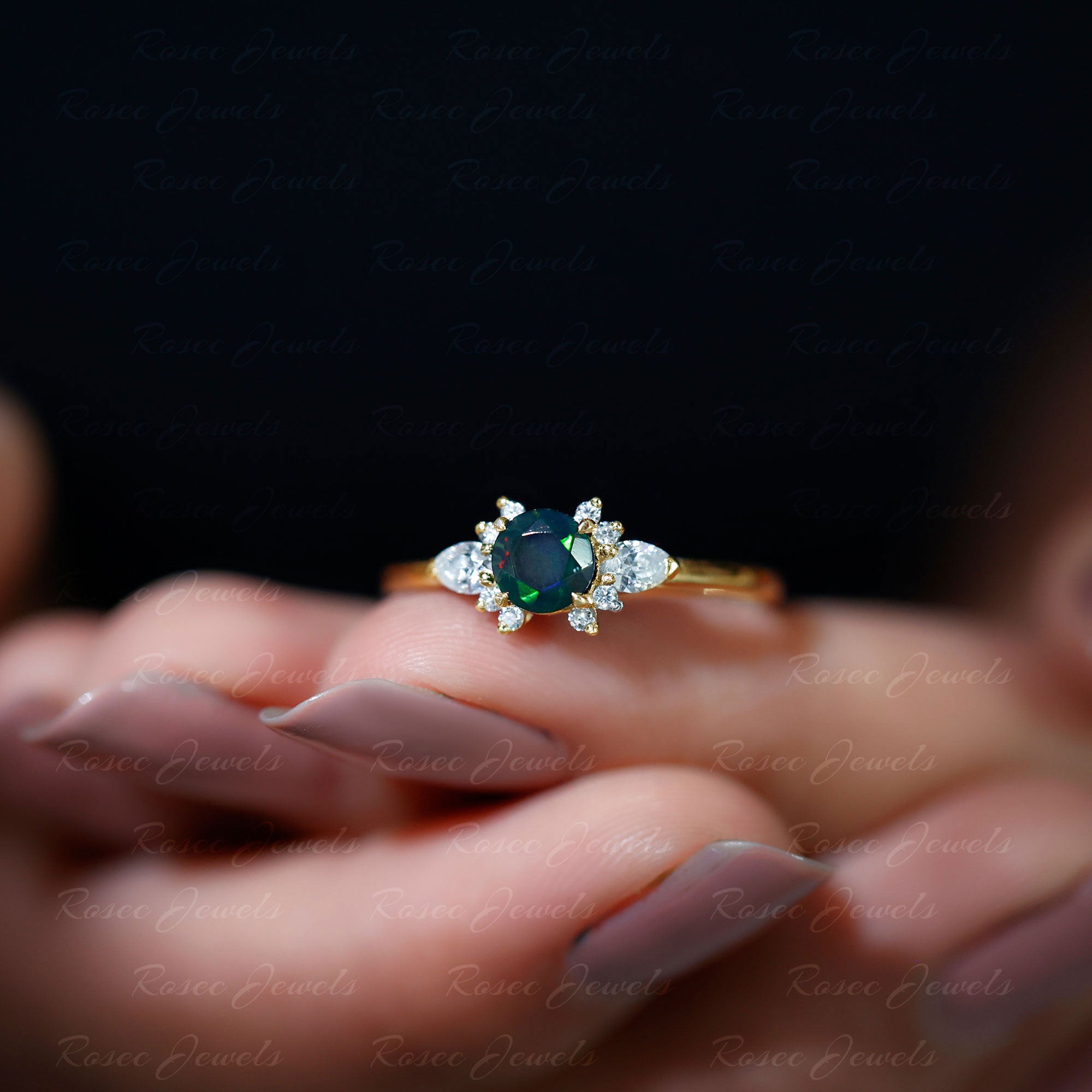 Give your beloved a delightful surprise with this exquisite Promise Ring adorned with a 4 MM Round Shape Black Opal in a claw setting, surrounded by pear and Round Shape Diamond Stones in a stunning halo design. Fashioned from Solid Gold, this gorgeous Promise Ring is the perfect gift for your special lady, sure to leave her feeling loved and cherished.