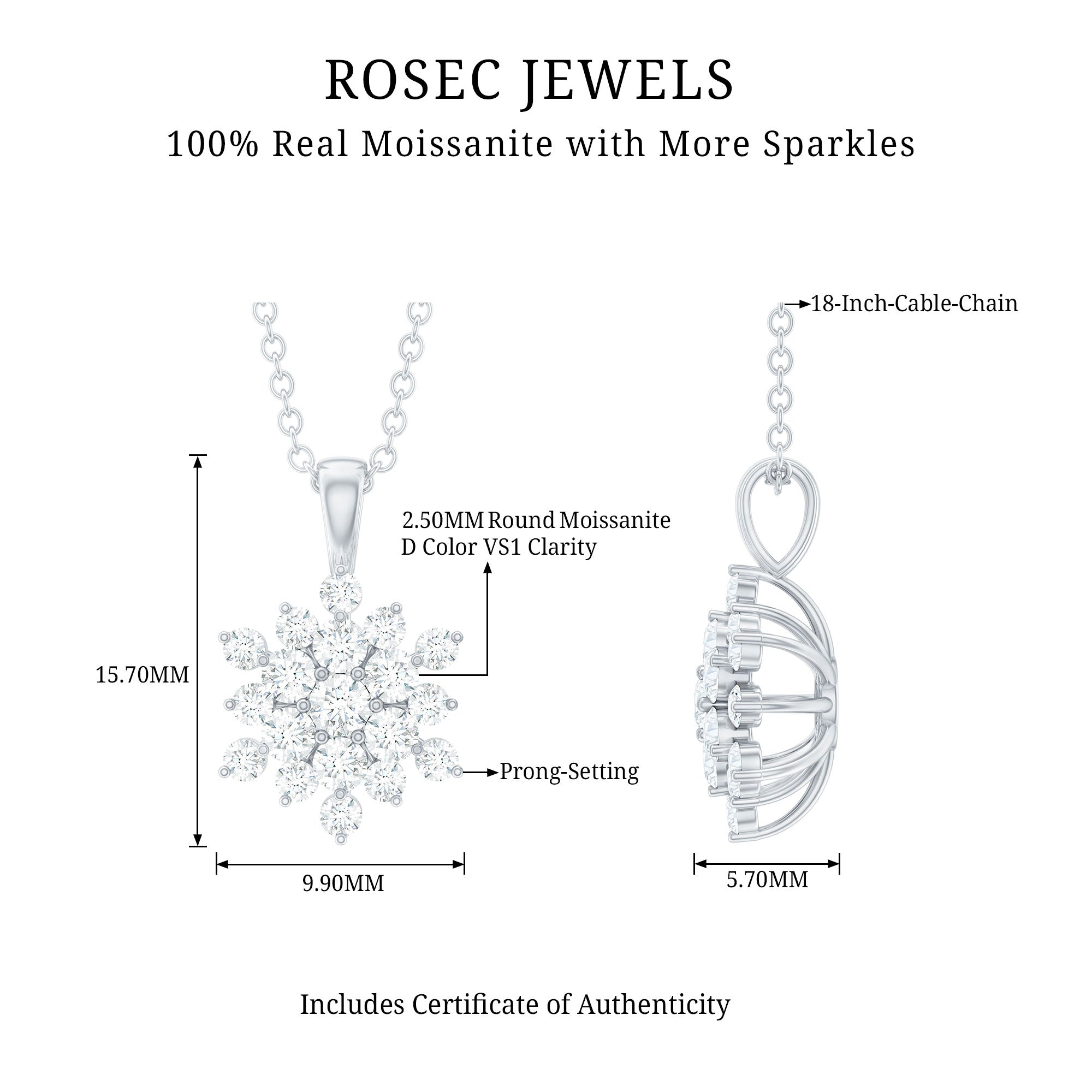 Look cool even on the hottest day with our one and only sparkling Moissanite Pendant Necklace. While embracing the natures beauty of winter, it carries the meaning of uniqueness and rebirth. Capture the mesmerizing allure and symbolism with the Round Shape Certified Moissanite arranged in a cluster form in secure prong setting. Shine bright with the icy sparkle, this beauty is inspired by the frozen motif to make great symbolic jewelry for the one you care about. Give the outfit a dose of shine through this one-of-a-kind enchanted Snowflake Pendant that shines with strong and enchanting brilliance. This Statement Necklace is crafted in 14k white gold plated silver, sure to make an impression and showing it has power in beauty, which is majestic and cool. This radiant Winter Necklace suspends from a sturdy cable chain, giving your neckline a captivating look. It is the ideal birthday gift for her, a sweet Valentine’s Day surprise for your girlfriend, or a thoughtful Christmas present for mom - this Moissanite Snowflake Necklace is sure to light up their faces. It is versatile enough to complement any outfit, whether you are wearing a casual dress or a partywear gown. This Snowflake Jewelry is a timeless piece for your collection that will be cherished for years to come.