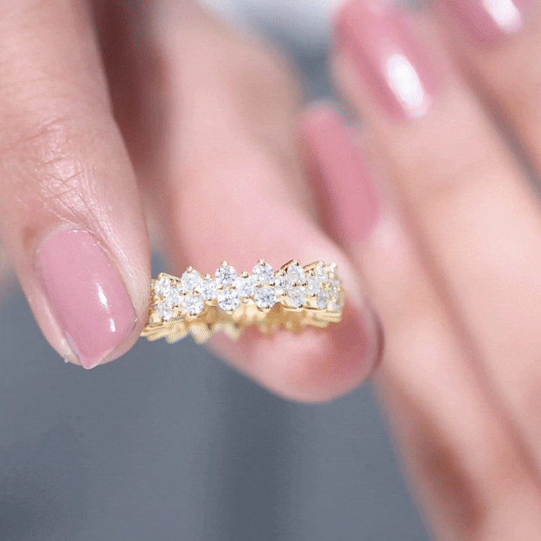 She will fall in love with every sparkling detail of this breathtaking Cluster Eternity Band - a timeless expression of beauty, romance, and devotion. Designed to wrap the finger in brilliance from every angle, this Full Eternity Ring features a seamless circle of round cut moissanite gemstones, each carefully placed in secure prong setting to form an elegant cluster pattern that dazzles with light and depth. Crafted with precision and passion, this Wedding Eternity Band showcases the art of fine jewelry through its delicate symmetry and flawless design. The continuous sparkle of high-quality moissanites makes it a meaningful representation of everlasting love - no beginning, no end. Whether worn as a wedding ring, anniversary gift, or simply a personal celebration of love, this Moissanite Wedding Band brings elegance to any occasion. Its intricate cluster style offers a fresh twist on traditional eternity bands, giving it a bold yet romantic feel that suits both classic and modern styles. Made for the one who cherishes detail and brilliance, this Stackable Ring is as enduring as the bond it represents.