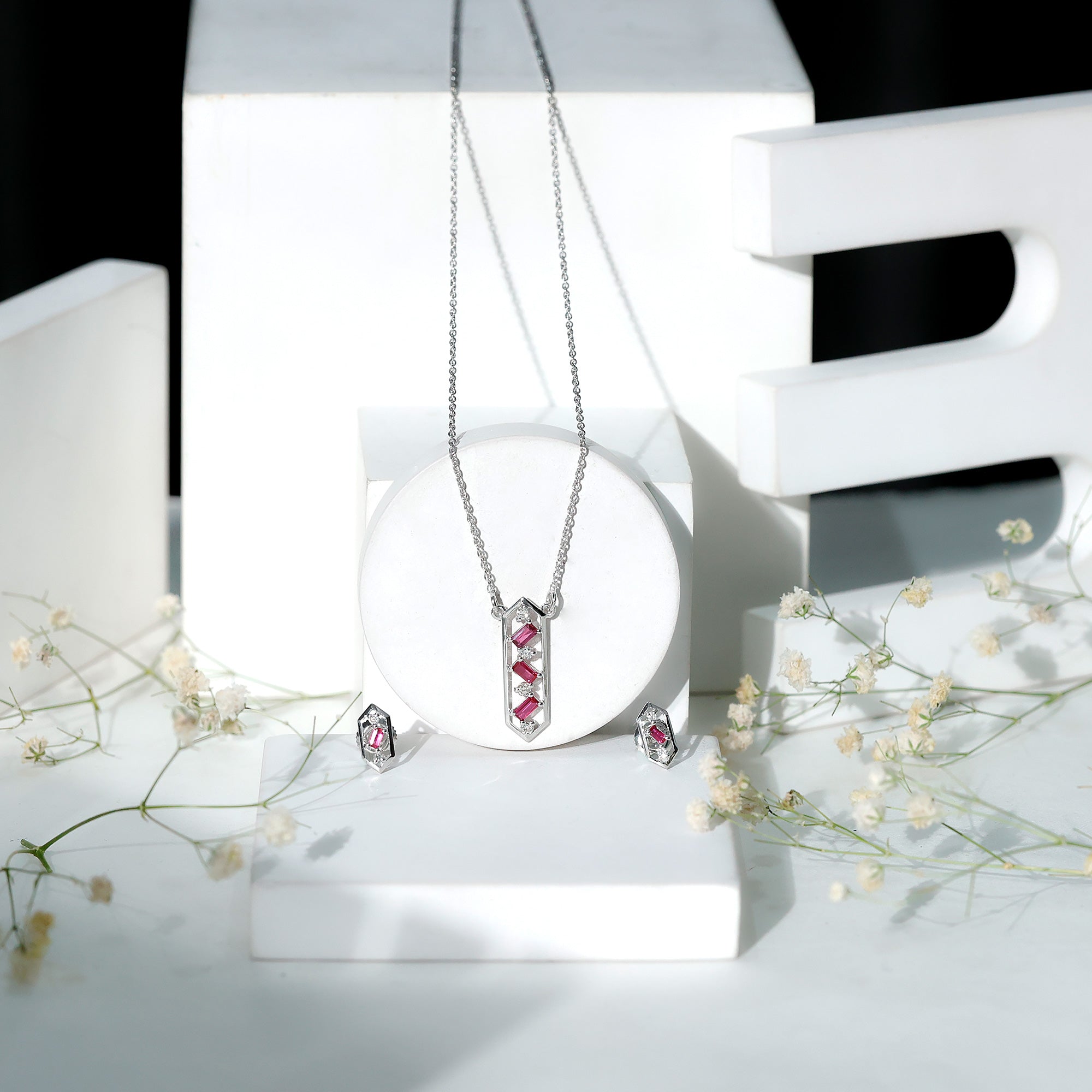 Make a stylish statement with this Contemporary Jewelry Set. Featuring stunning baguette cut Ruby stones paired with round Diamond stones set in prong setting in the center of an open hexagon shaped bar, this Necklace and Earrings Set offers a modern take on classic jewelry styles. The elongated design adds movement and elegance to the pieces, making them the most suitable choice for any special occasion. Add this Ruby and Diamond Necklace Set to your jewelry collection for sophistication and luxury. The necklace hangs from a delicate cable chain that is both strong and stylish, while the earrings come with secure screw back closures, so you can wear them comfortably all day long. This Geometric Pendant and Earrings is perfect for women who love simple yet striking pieces of jewelry. Presented in a signature jewelry box, making it a thoughtful and personal surprise that is ready to gift.