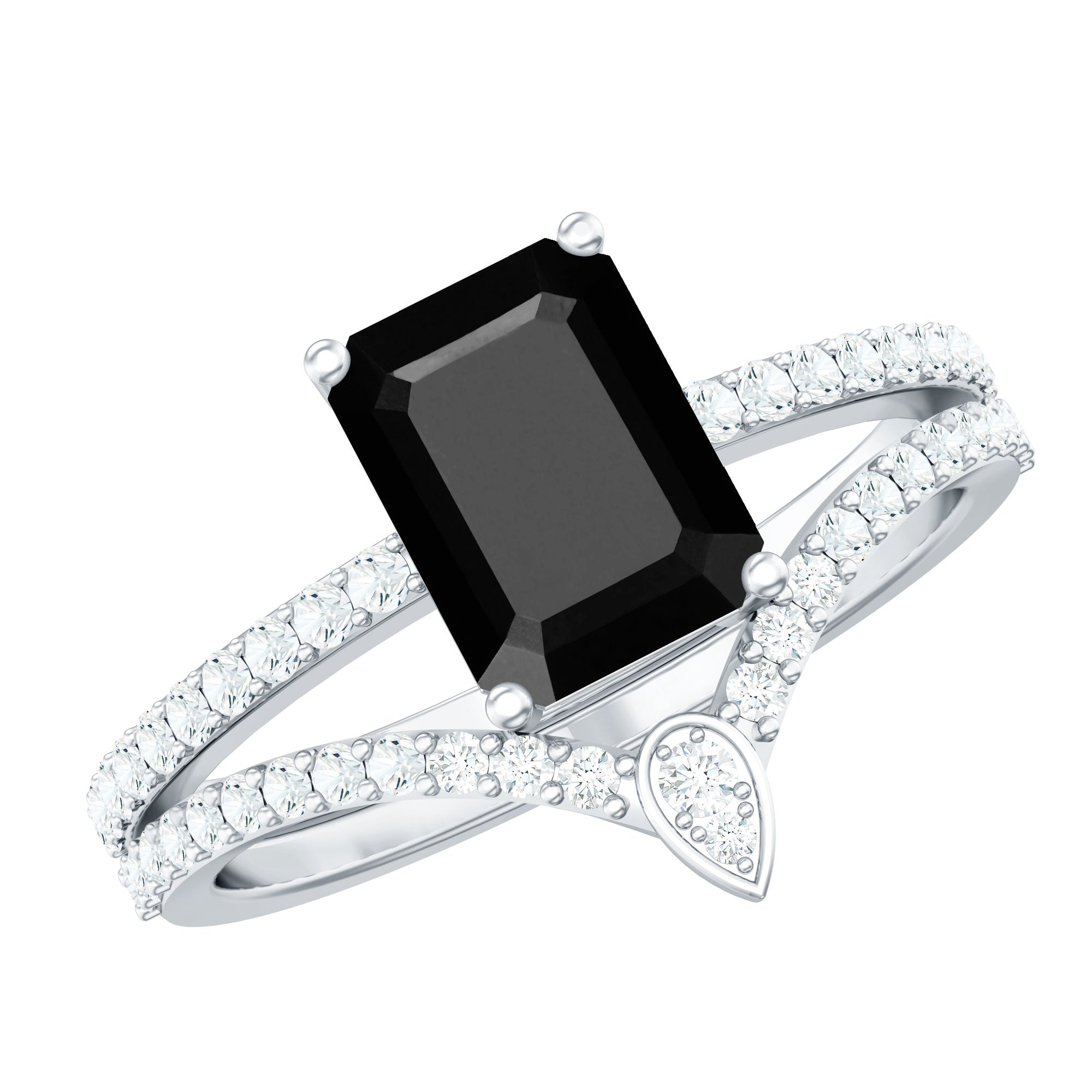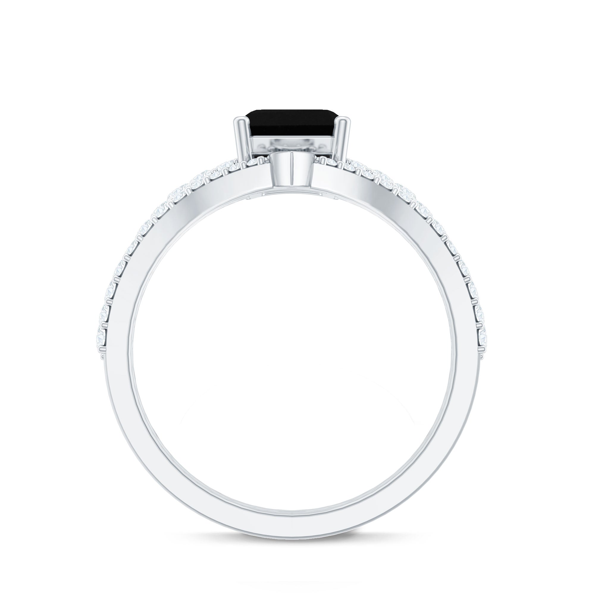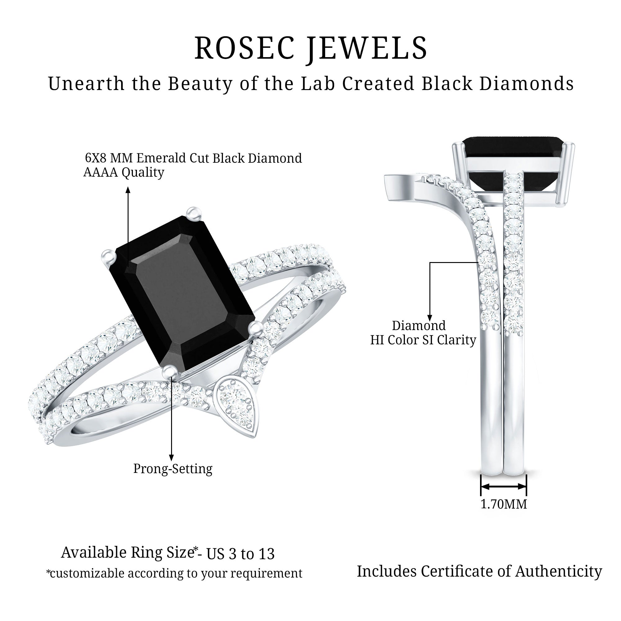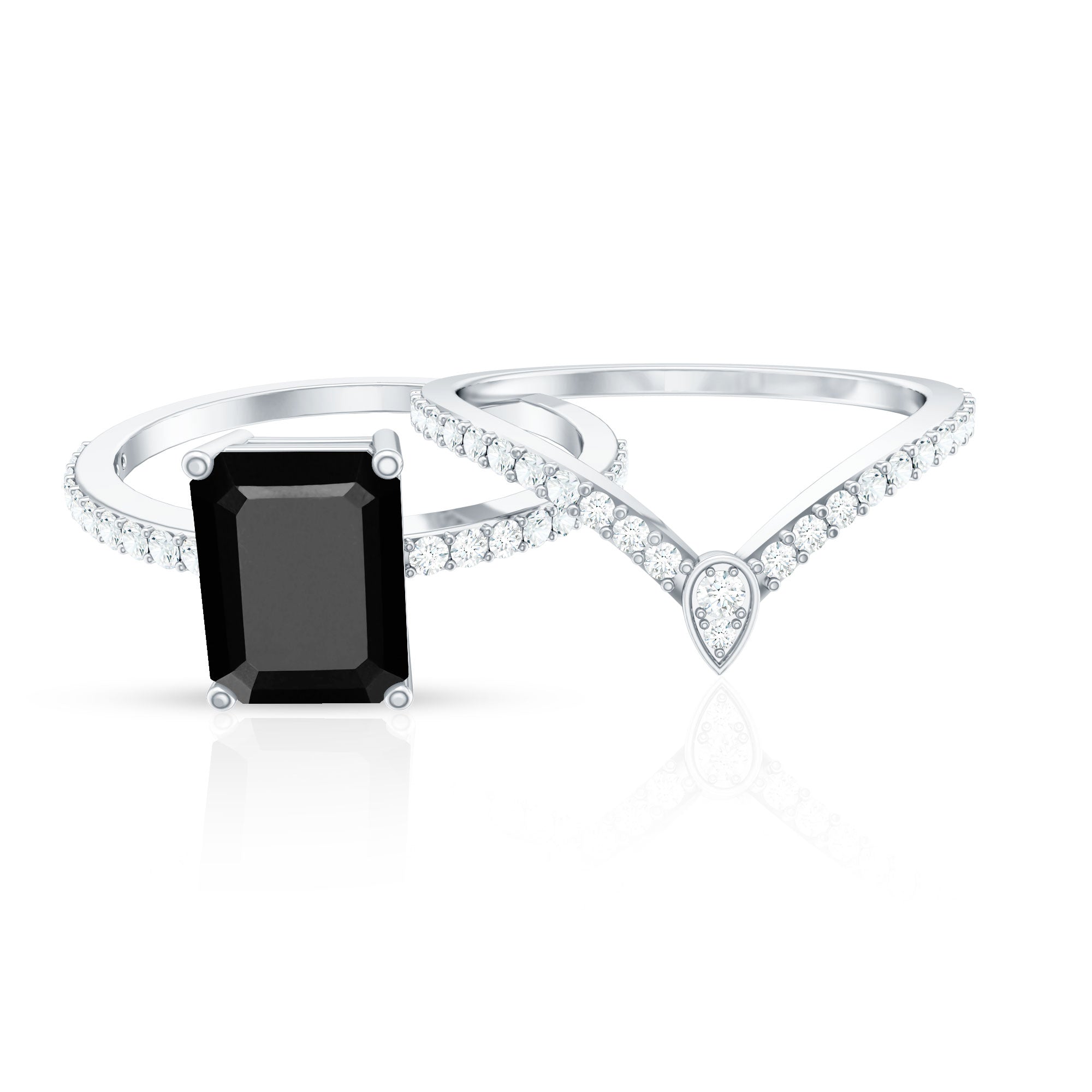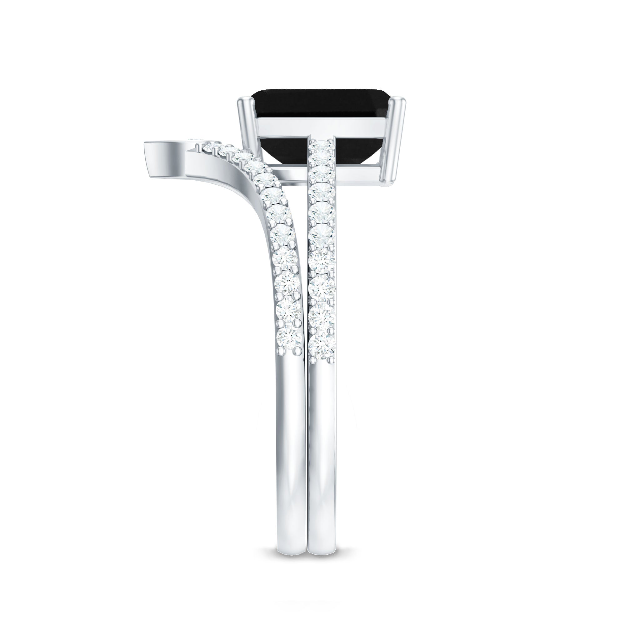 This unique Bridal Ring Set features an Emerald Cut Lab Created Black Diamond secured in 4 Prong Setting while dainty Round Diamond studded on the shank and enhancer ring. You can grab this Created Black Diamond Ring Set for your loved ones like mom, sister, girlfriend, or wife to make their day special.