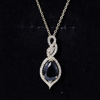 Discover the captivating elegance of this minimalistic Teardrop Pendant featuring a gracefully hanging pear-shaped created black diamond. A glistening infinity design enhances its allure, while round Diamond stones embrace and enhance the enigmatic hue of the center stone.