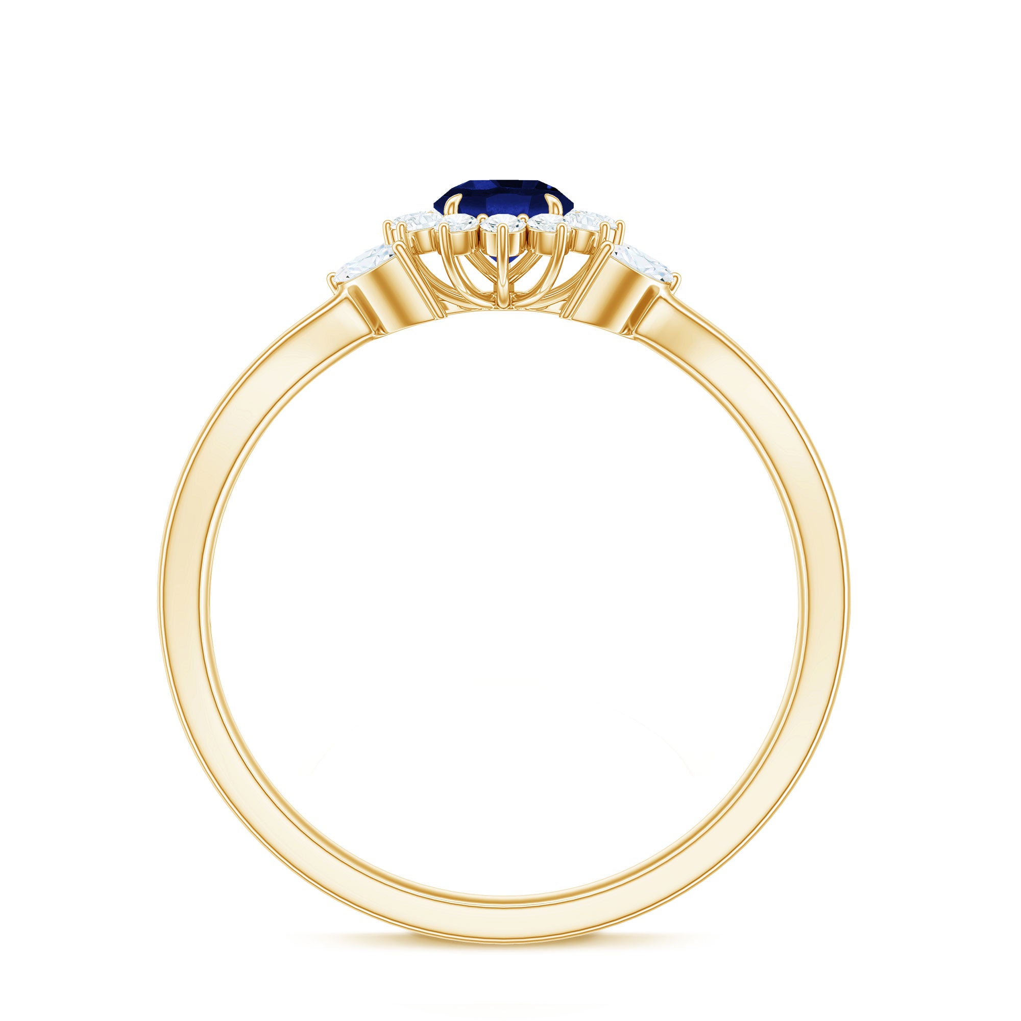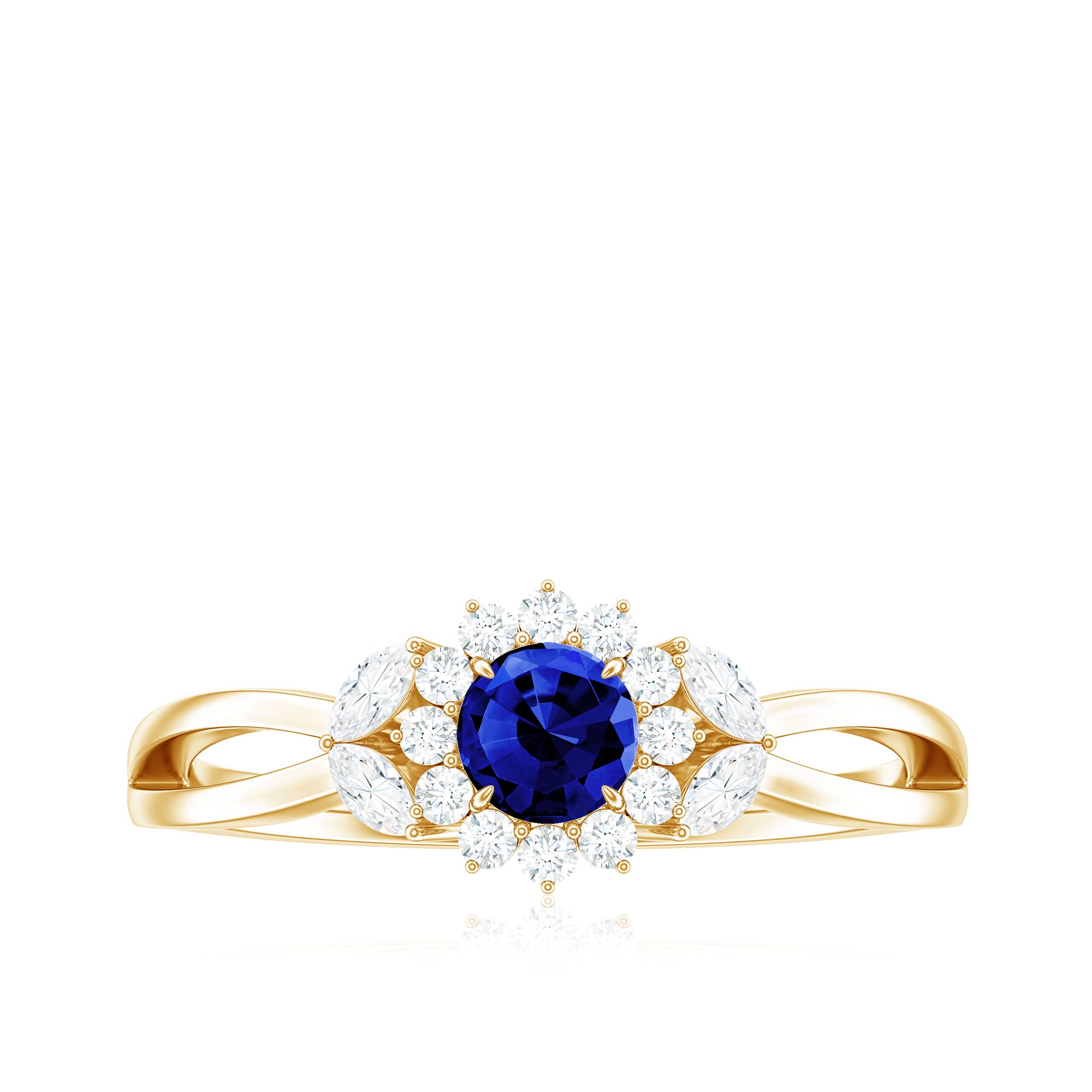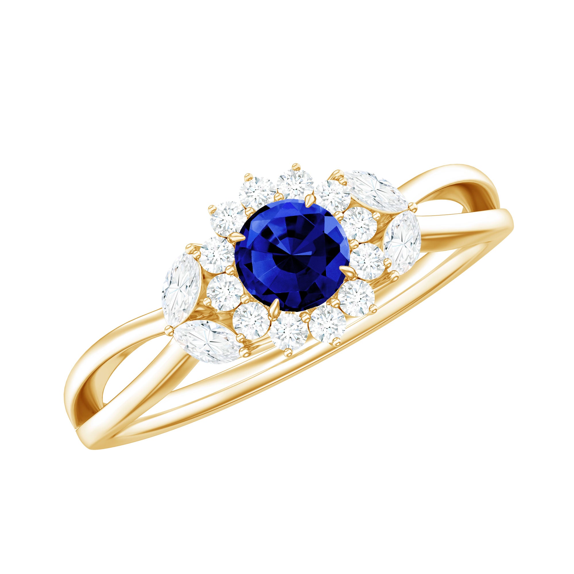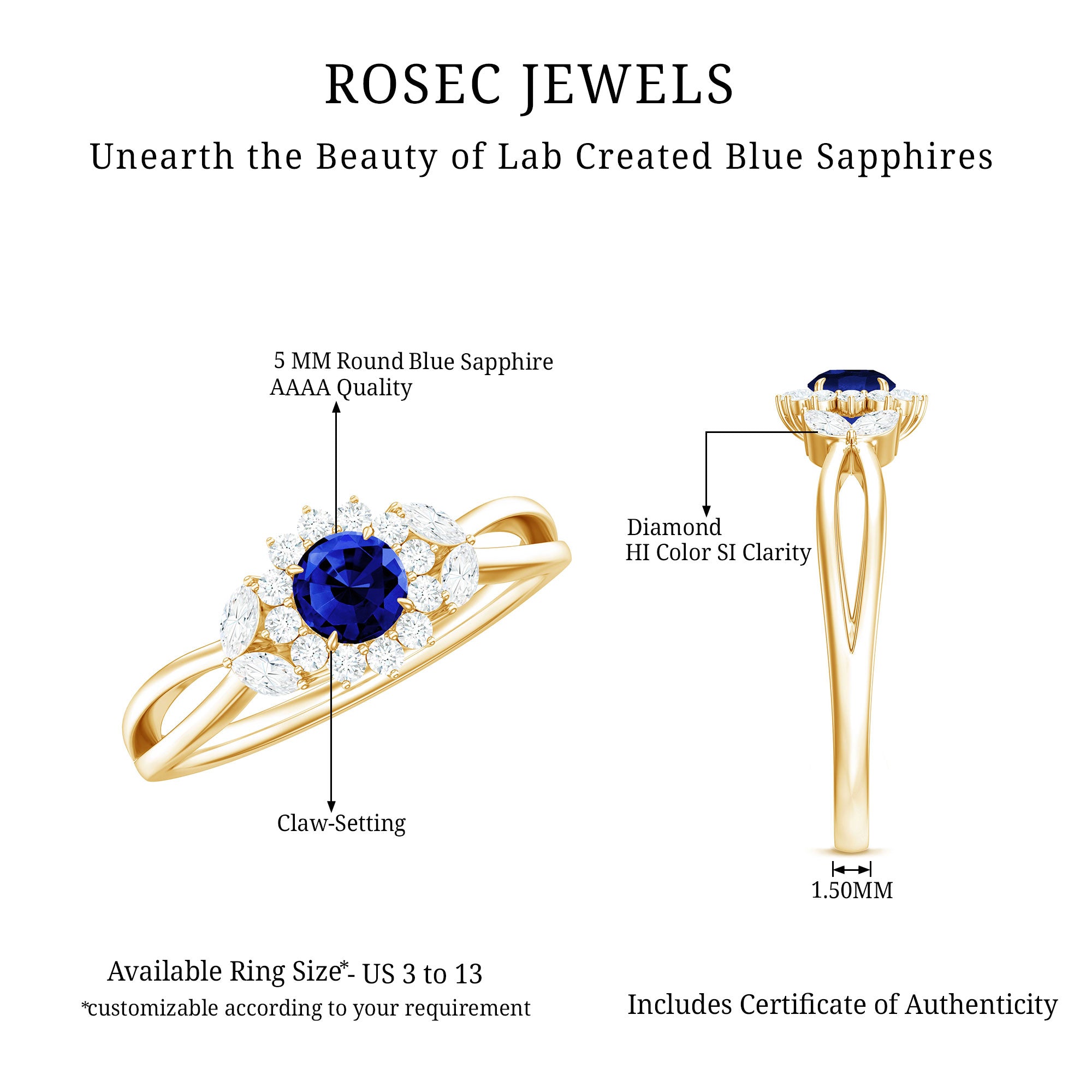 The Floral Ring is featuring a Round Created Blue Sapphire, held in a Claw Setting, and a Halo of Round Diamond along with a Marquise Cut Diamond. This Created Blue Sapphire Engagement Ring is an alluring piece of fine jewelry, it has a split shank to give it a captivating touch.
