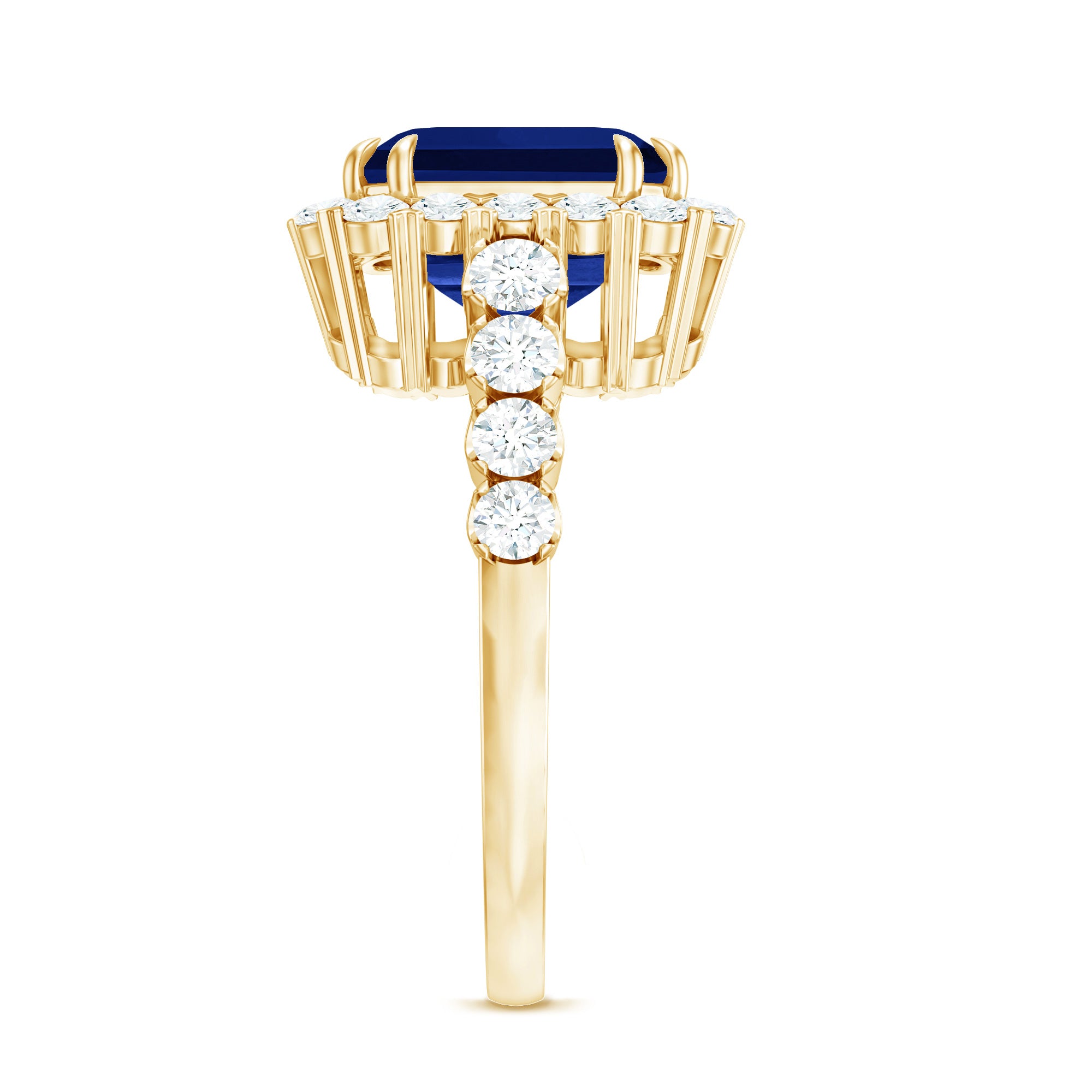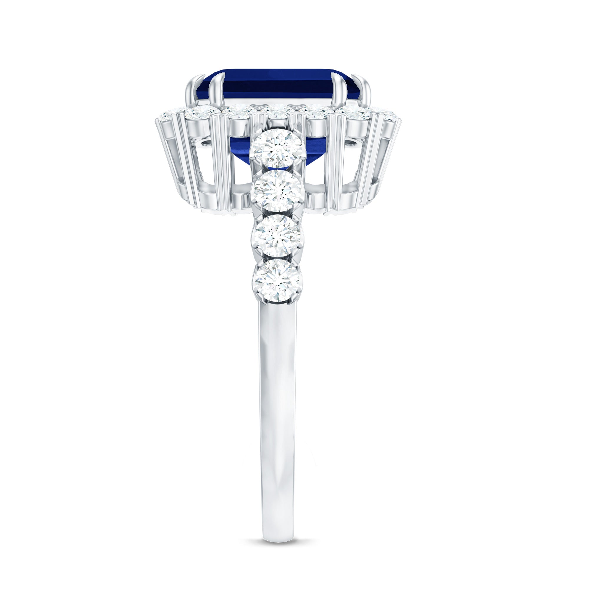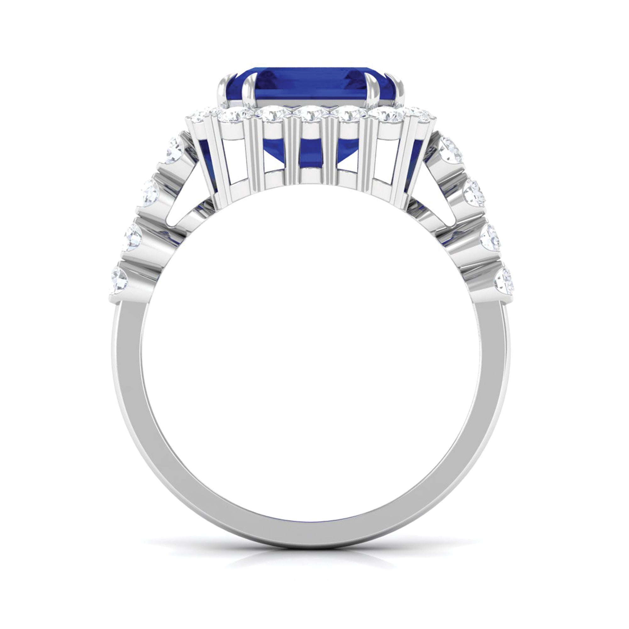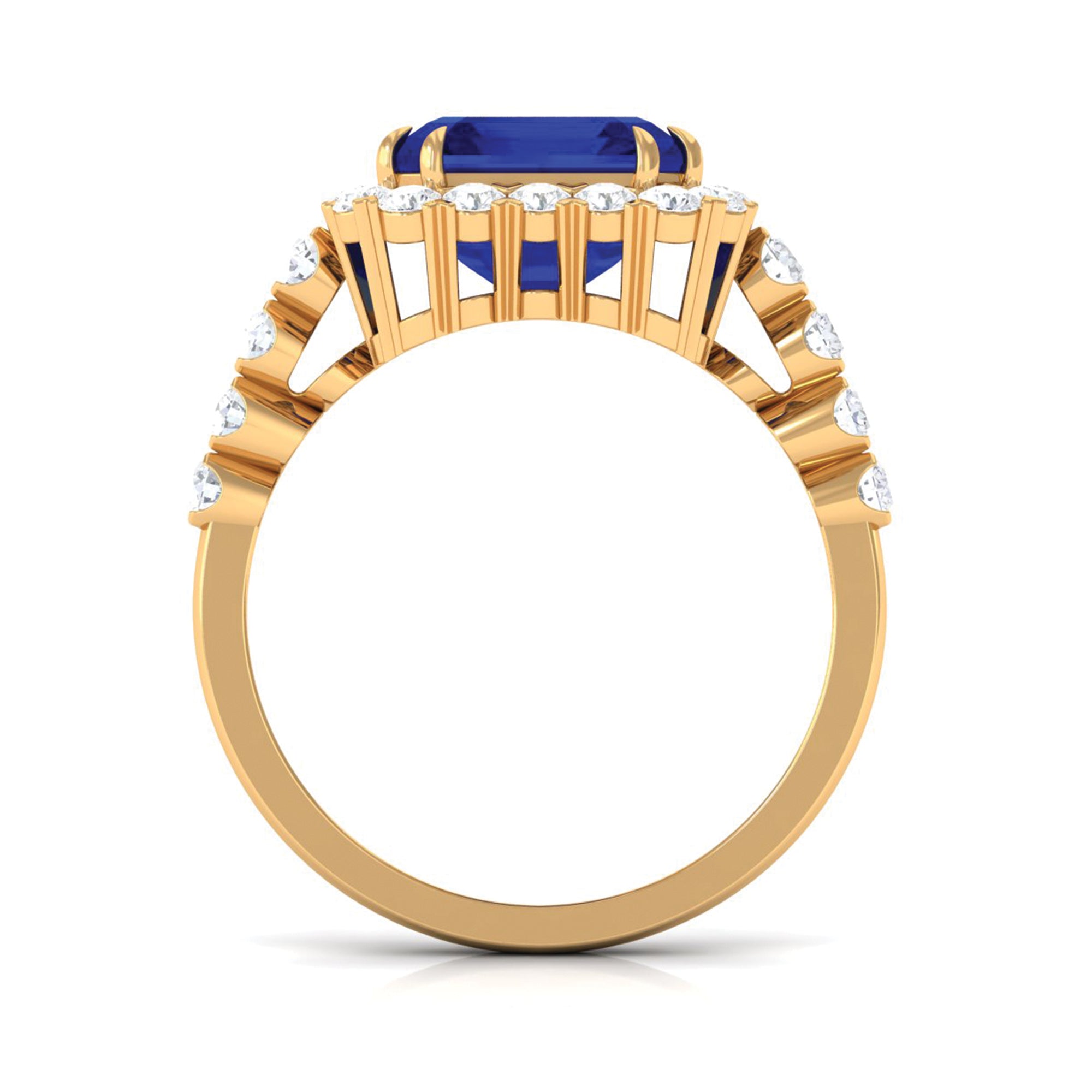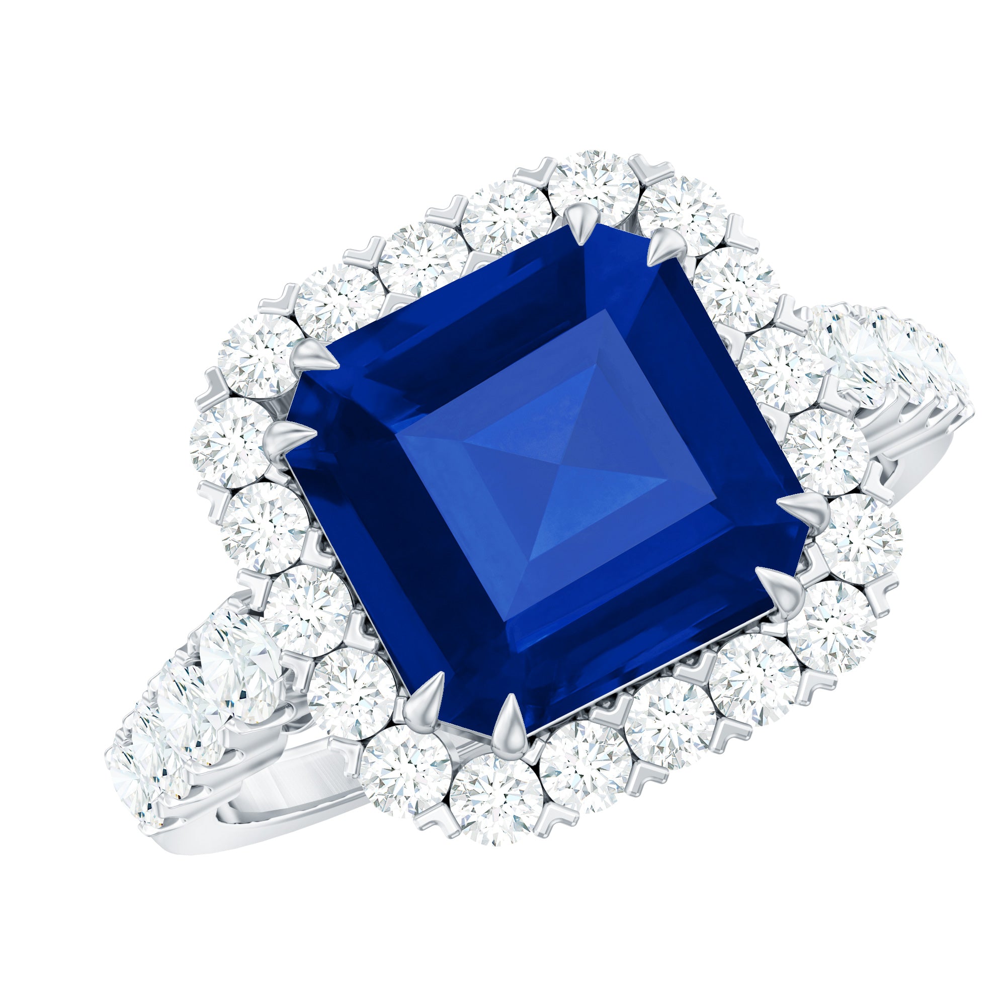 With elegance and timeless beauty, this Lab Grown Blue Sapphire Ring draws attention with its mesmerizing look that reflects a vintage and modern feel. Having fine details and sparkle this ring is adorned with 8MM Asscher Cut Lab Created Blue Sapphire in Double Claw Setting with Diamond as Halo. The shank is adorned with Round Shaped Diamond as Side Stones giving a unique and contemporary look. This Sapphire Diamond Ring is an elegant choice making it truly unique enhancing the depth and brilliance of the ring and adds a luxurious touch. This show-stopping Sapphire Engagement Ring has unmatched clarity and timeless love that holds enduring value as a treasured asset.