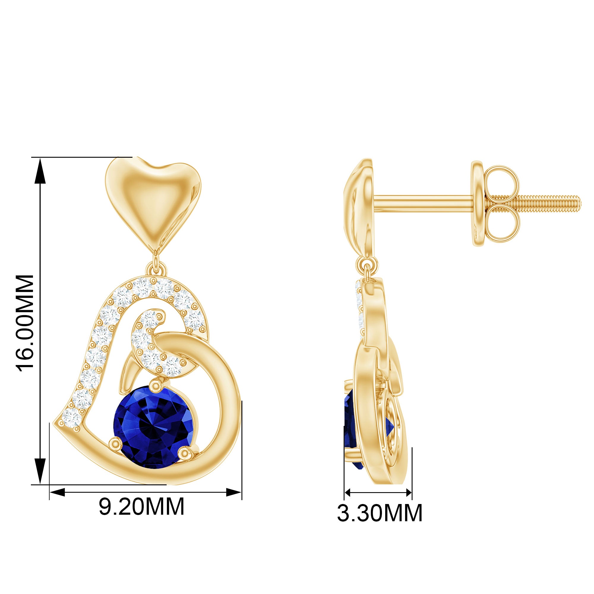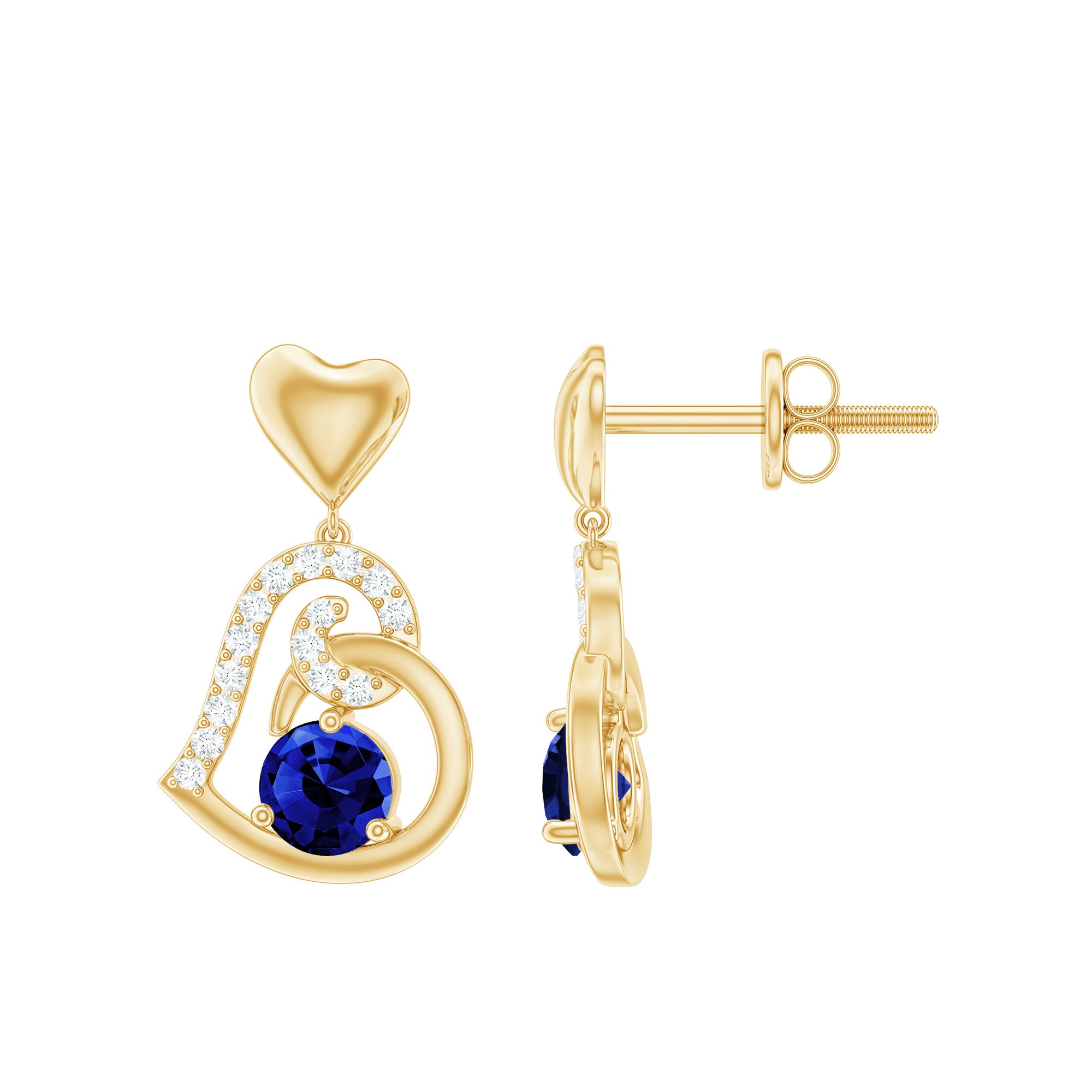 Be Dazzle with these beautiful Heart Drop Earrings. These earrings are embellished with Round Shape Created Blue Sapphire Solitaire, held in 3 Prong Setting and Round Shape Diamond accentuating the half part of the gold heart. These earrings are both cool and classy! So, get your hands on these earrings and adorn yourself with a new accessory.