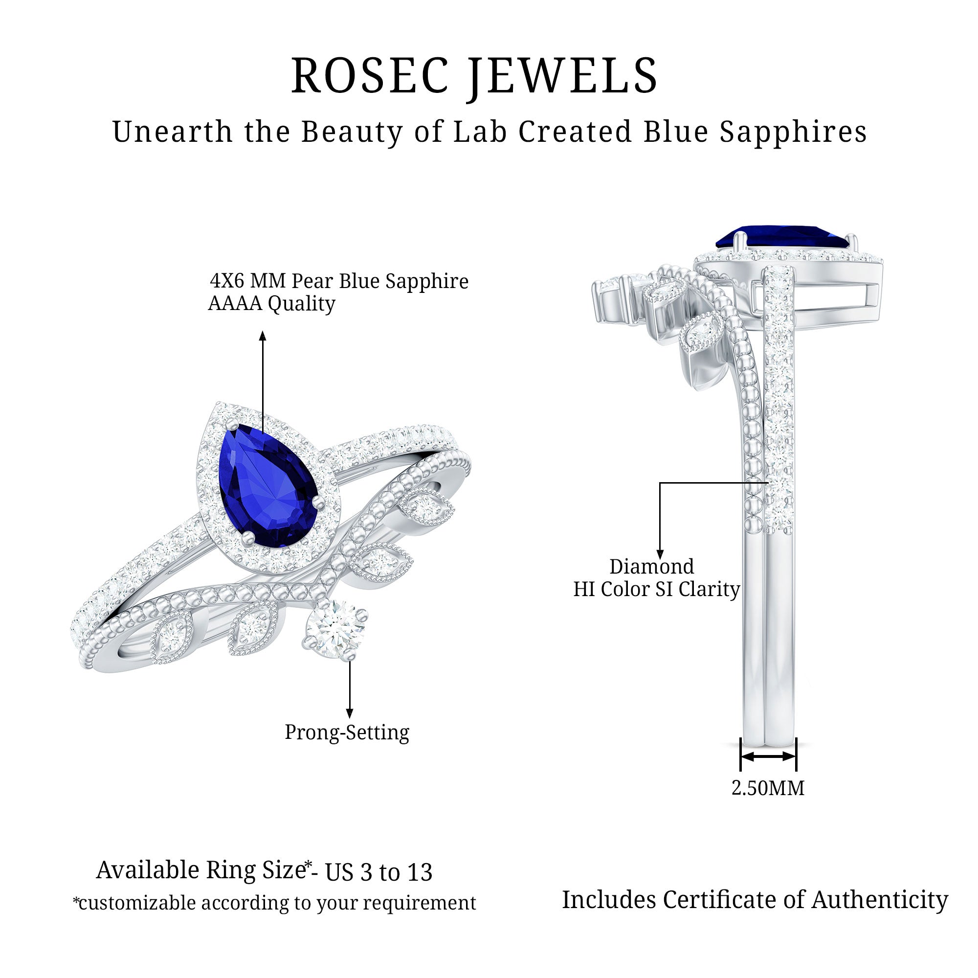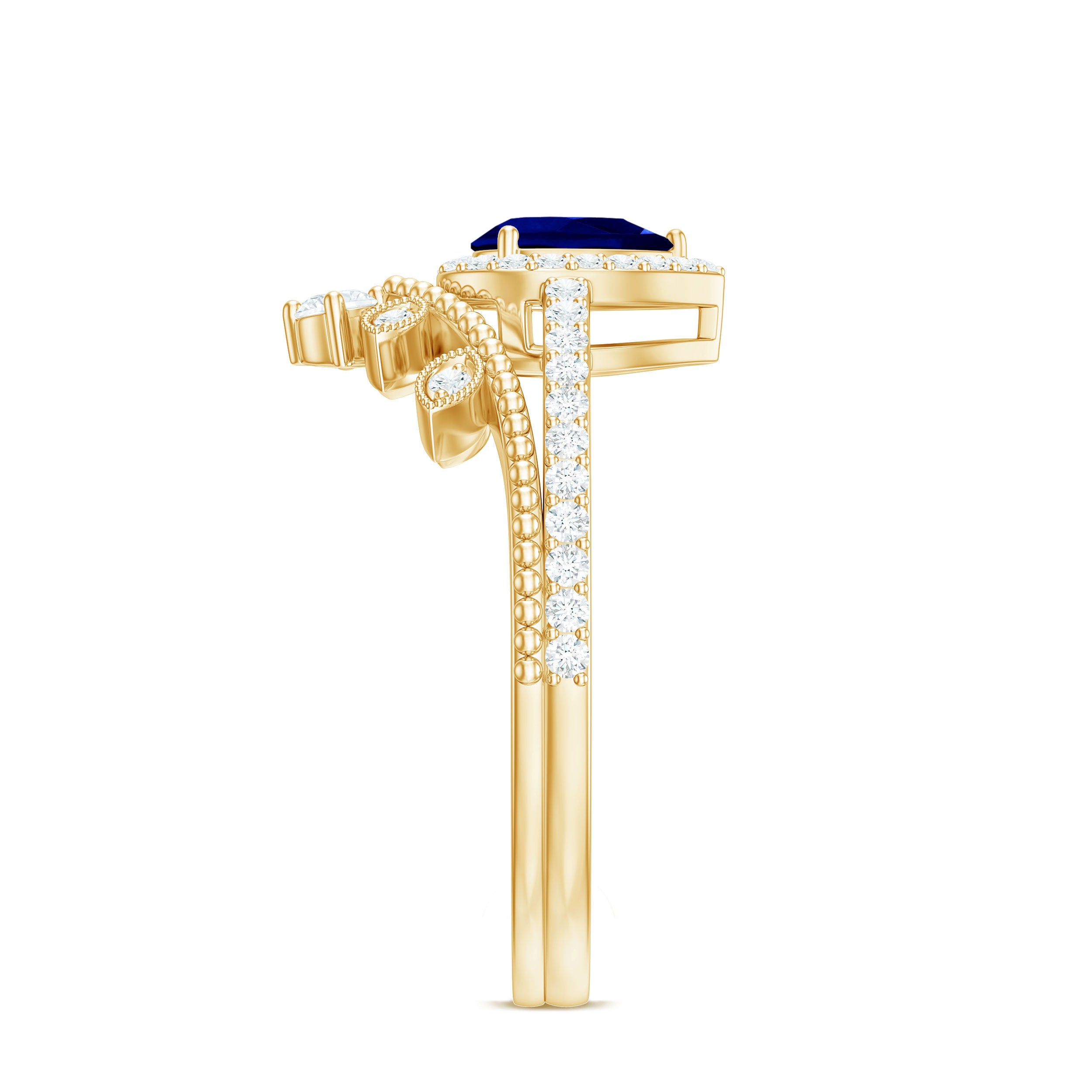 For your special day, this Created Blue Sapphire Ring Set is a stunning jewelry. Being adorned with Pear Cut Created Blue Sapphire in Prong Setting and Diamond on Ring Set. Composed of Gold, this Vintage Inspired Ring Set is a must have jewelry collection.