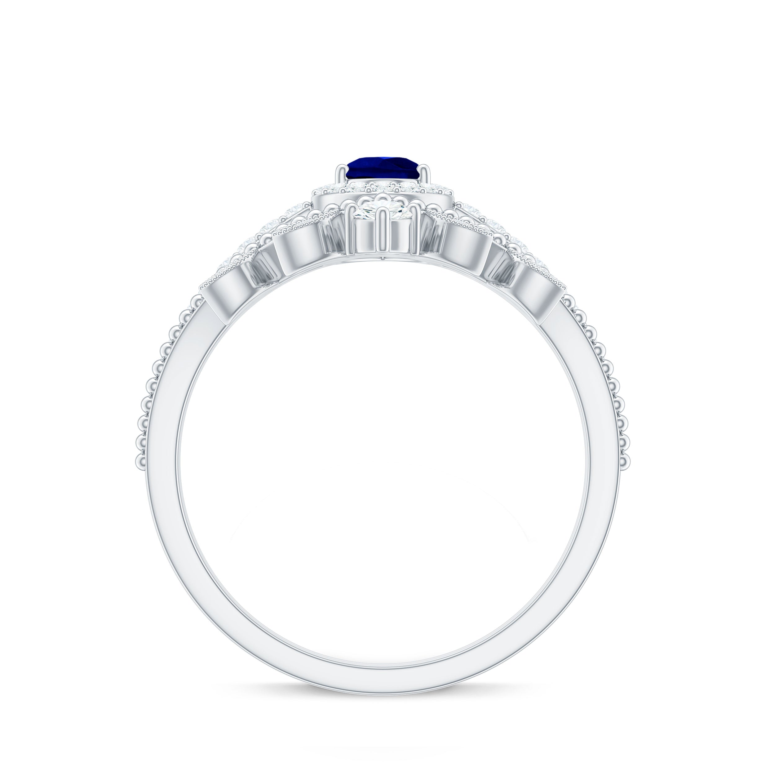 Created Blue Sapphire and Diamond Vintage Inspired Wedding Ring Set