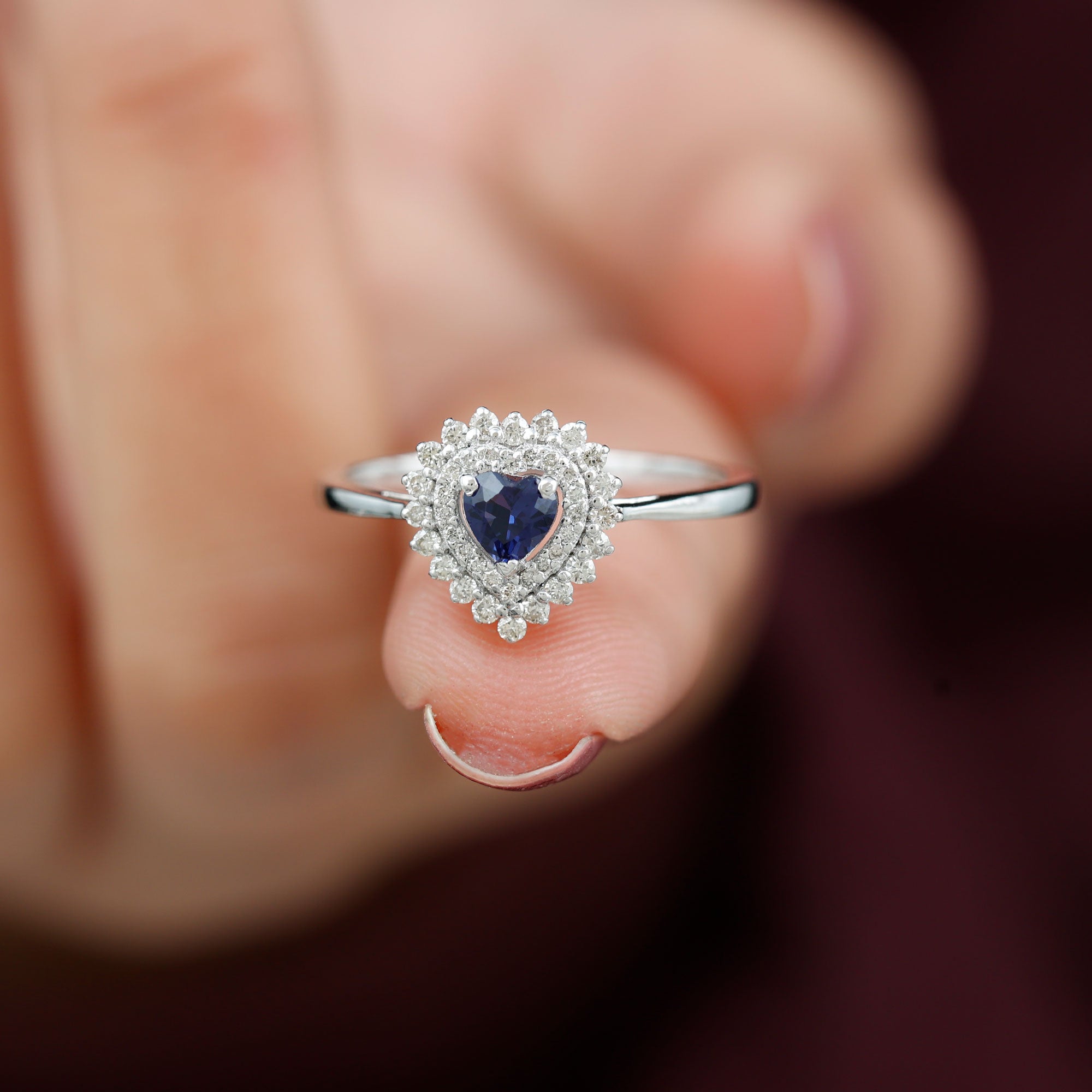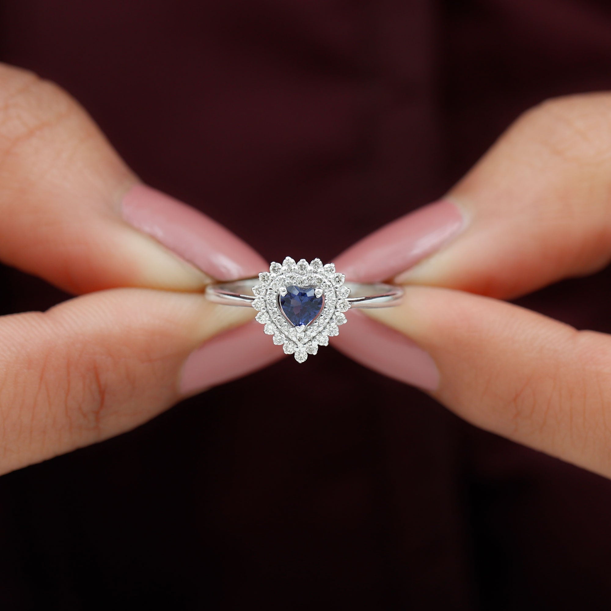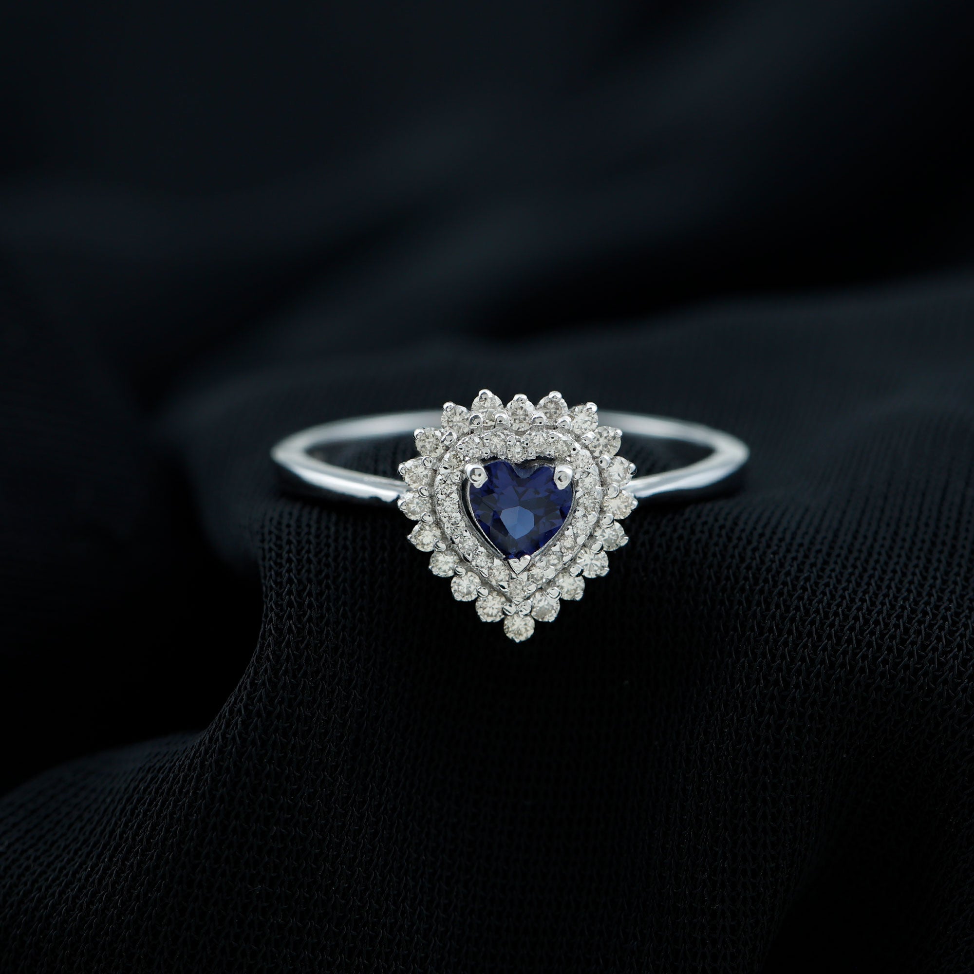 Indulge her with a feeling of being on top of the sky with this stunning Heart Shape Lab Created Blue Sapphire Ring. Adorned with a captivating Heart Shape Created Blue Sapphire, and encircled by a Diamond Double Halo, this statement piece crafted in various metal types, is an essential addition to any jewelry collection.