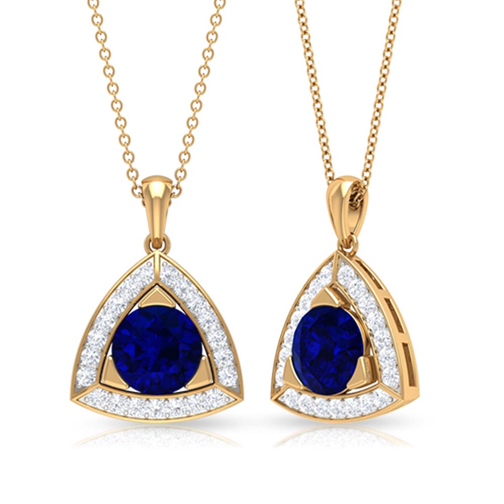Want to wear something unique, then get this Lab Grown Blue Sapphire Pendant. It features an 8 MM Lab Created Sapphire placed in 3 Prong Setting at the center of Diamond-embedded triangular frame. This Sapphire and Diamond Pendant beholds the classic shine of AAAA Quality Cultured Sapphire. The Triangle Pendant exudes a sophisticated edge that steals all the attention. The pendant will be delivered to you in a classic jewelry box for further storage.