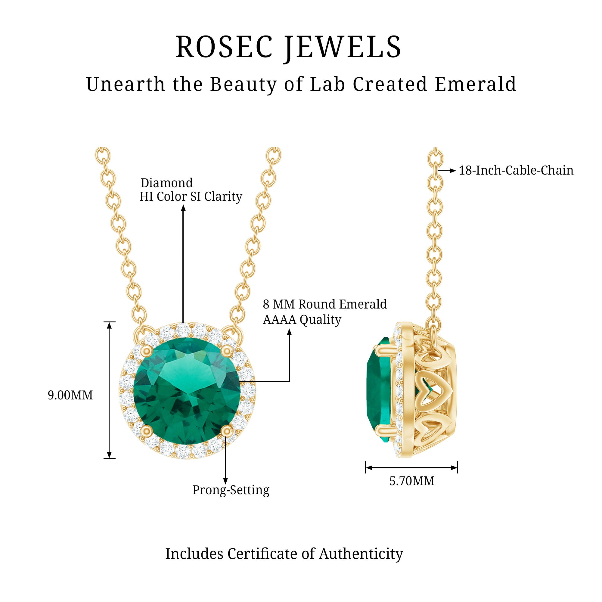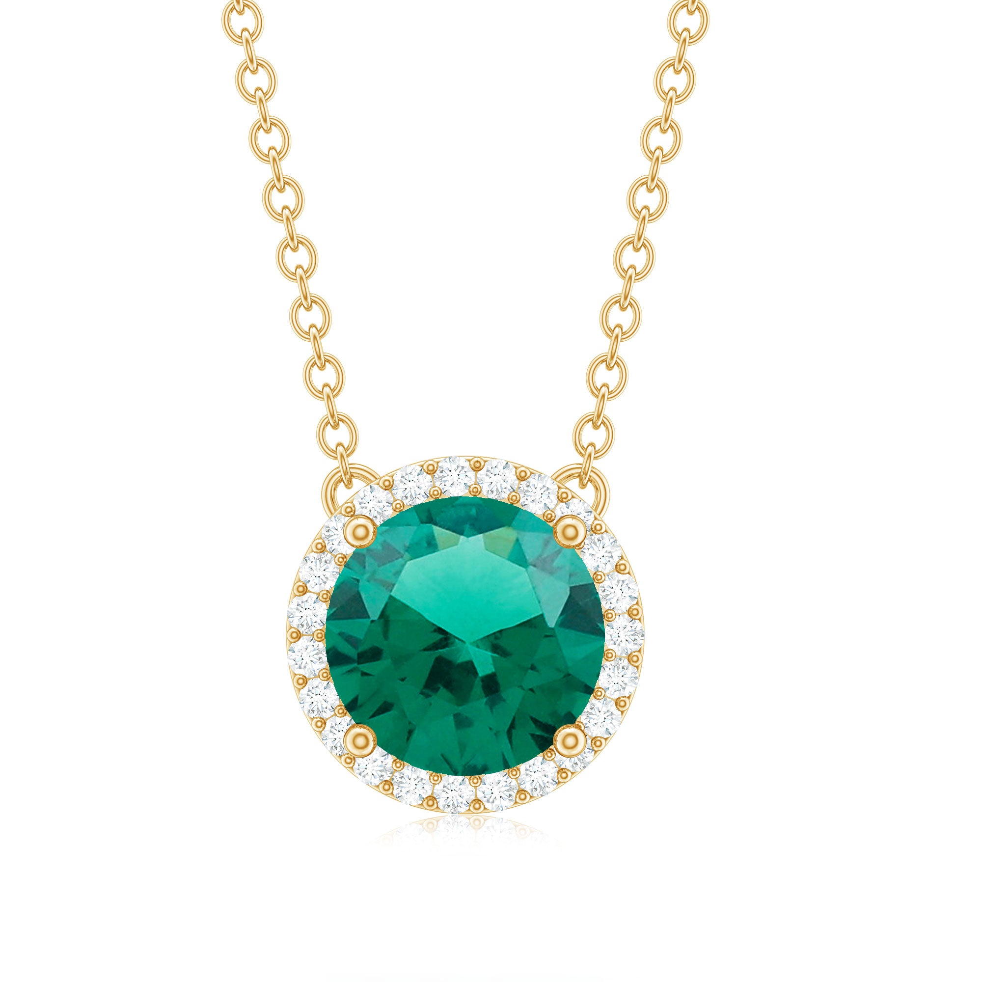 The beauty of this Halo Necklace will surely bring you into the limelight. Embellished with Round Shape Lab Created Emerald secured by 4 Prong Setting while petite Round Diamonds studded as Halo. This Lab Grown Emerald Necklace is crafted with Hallmarked Metal for an elegant look. Adorn yourself with this Minimal Necklace, and get a minimal and wow look. You can present this Created Emerald Necklace to your loved one as a Birthday Gift or Anniversary Gift.