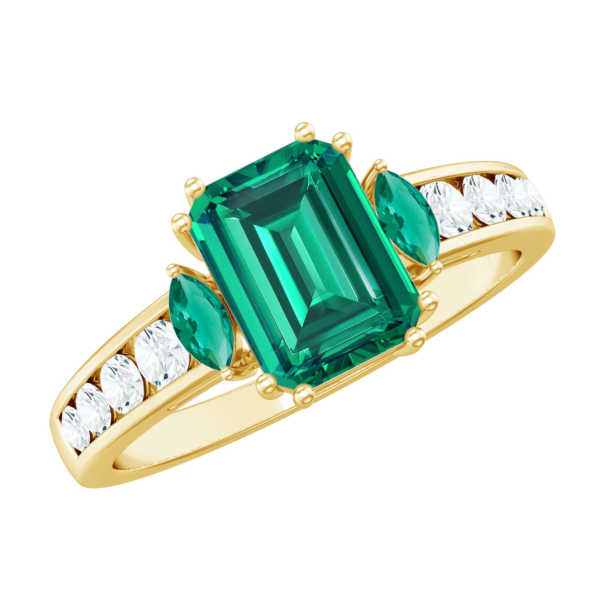 Created Emerald Engagement Ring is splendidly crafted in gold, it has Diamond Side Stones to add more charm to it. This Created Emerald Ring is a graceful and exquisite piece of fine jewelry. Octagon and marquise cut created emerald are held in prong setting and round Diamond held in channel setting beautifully forming excellent cocktail ring.