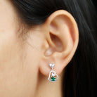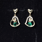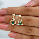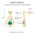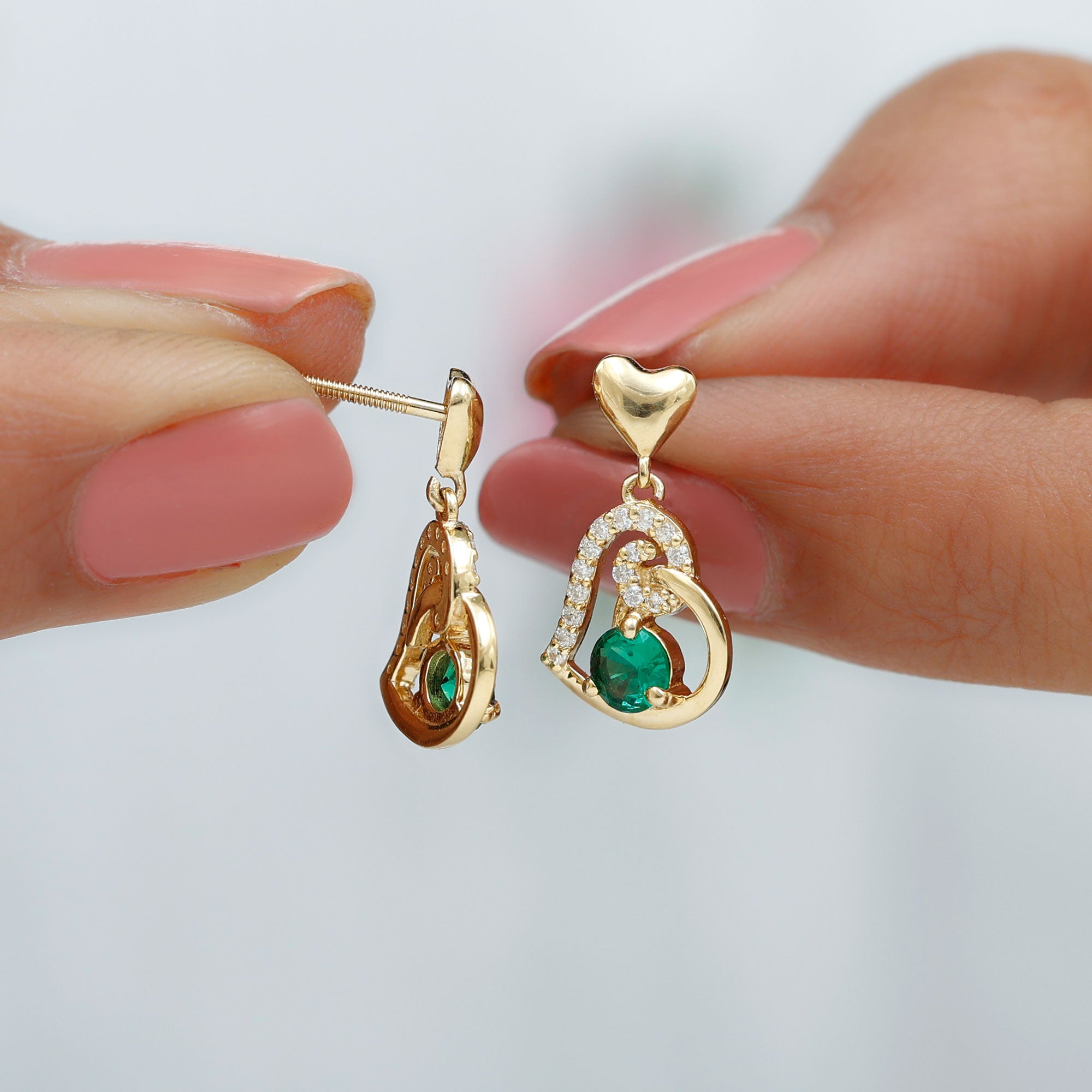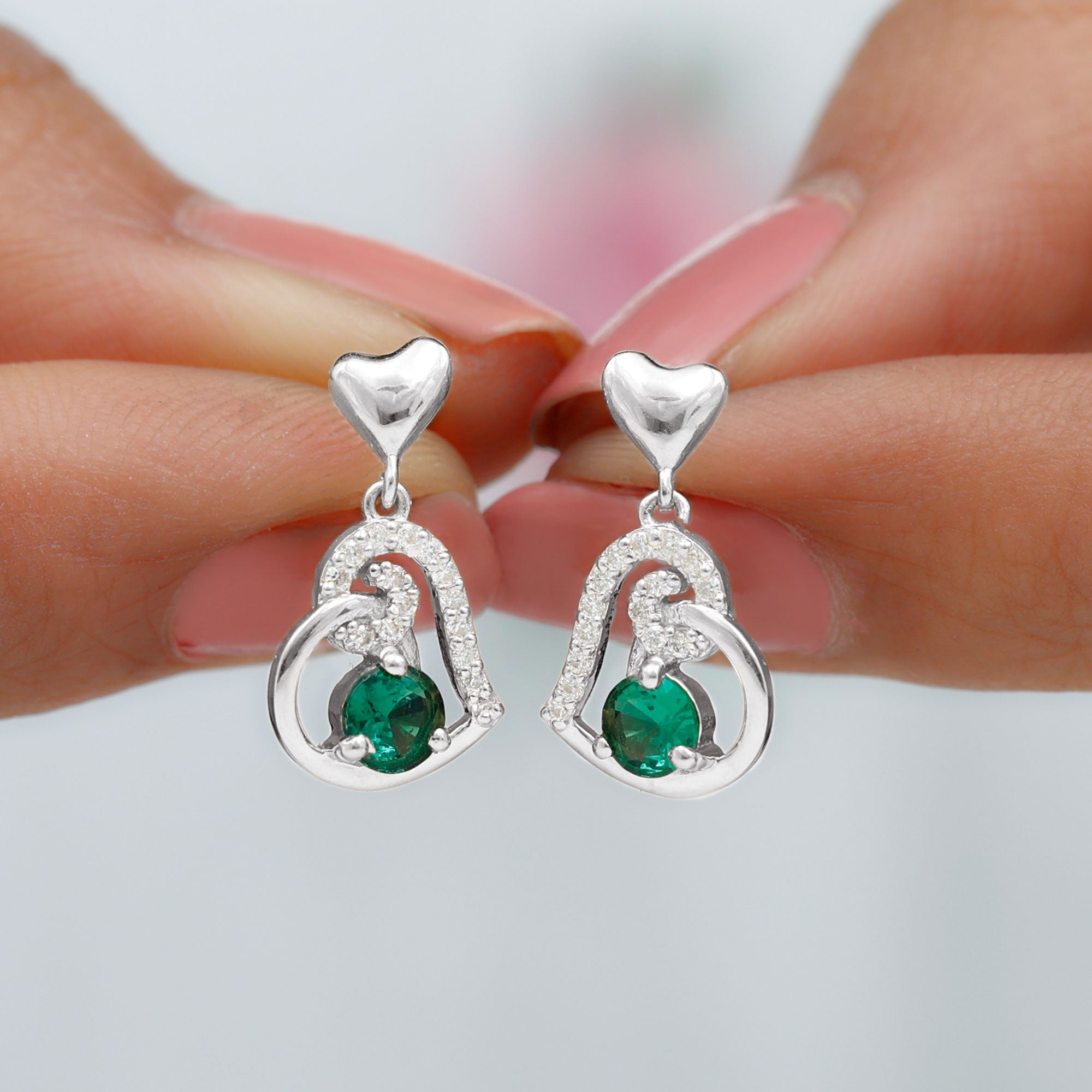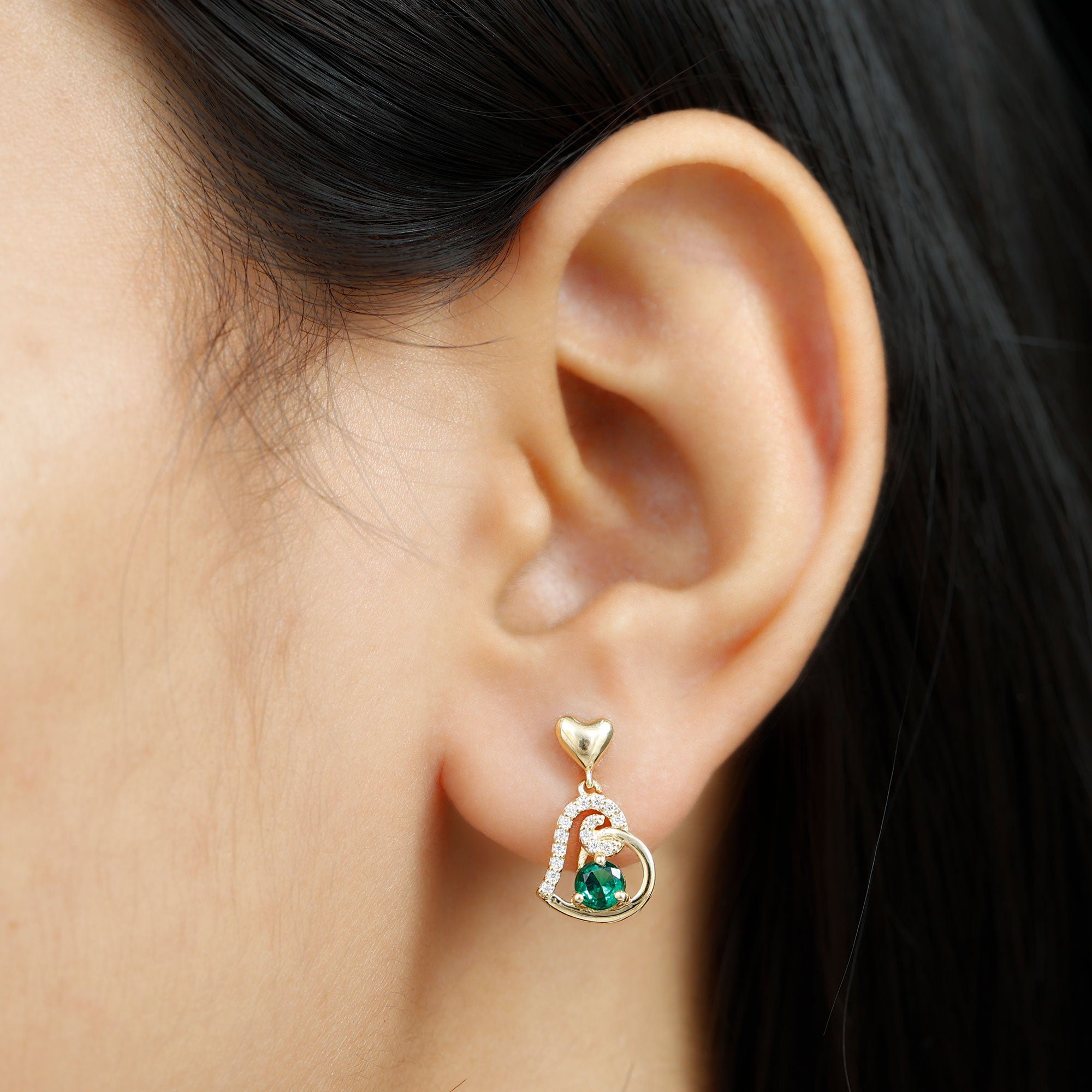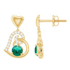 Sparkle and showcase your style with these stunning Heart Drop Earrings featuring a unique design. These earrings are adorned with a Round Shape Created Emerald, delicately set as the center stone in a secure 3 prong setting. Adding to their allure, tiny Round Shape Diamond stones beautifully embellish the metal crafted heart in an accent setting, making them even more attractive. Let these earrings be the dazzling centerpiece of your ensemble, exuding charm and elegance with every movement.