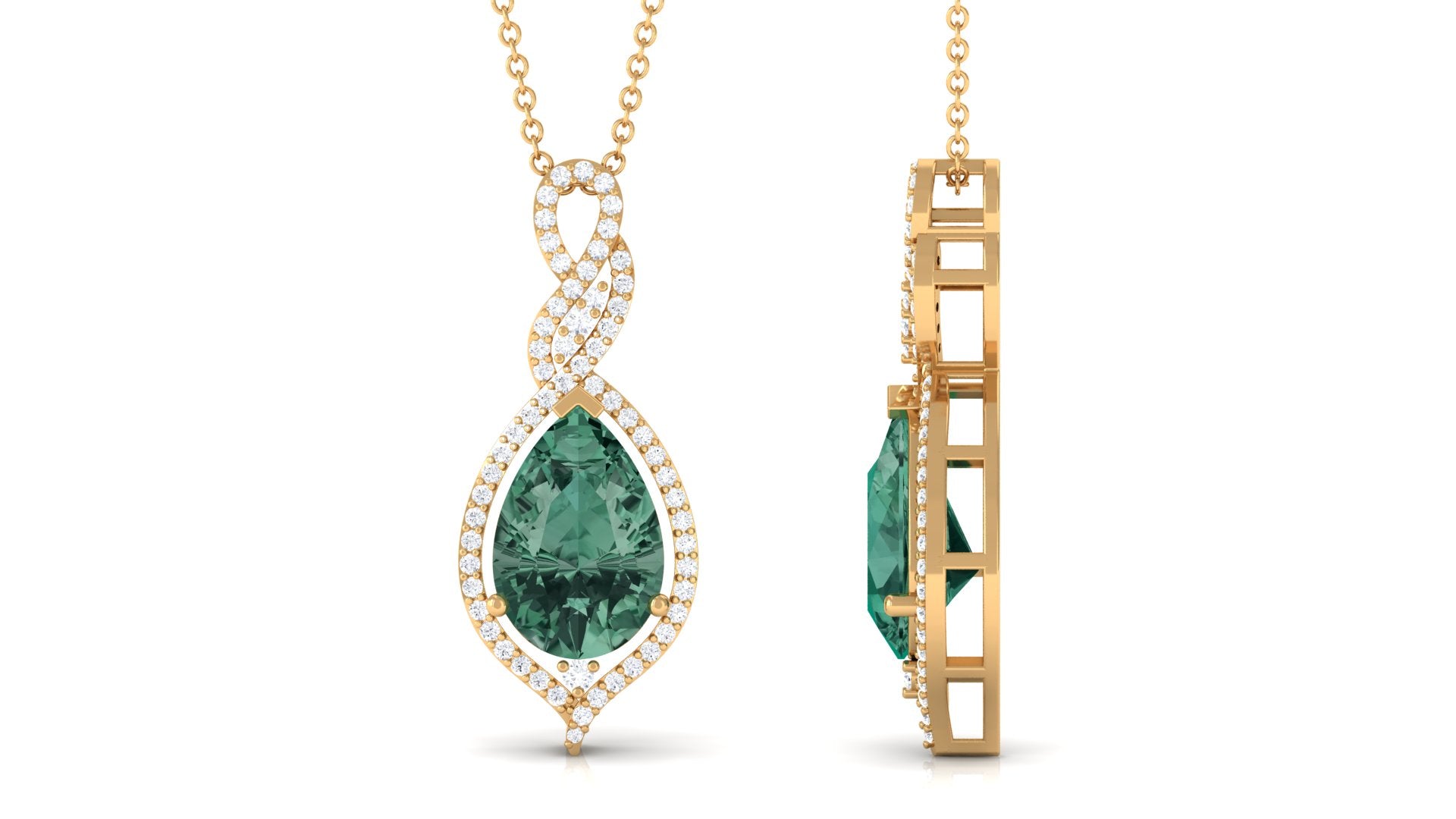 Experience the captivating elegance of this Teardrop Pendant, featuring a gracefully suspended pear-shaped created green sapphire. Its enchantment is further enhanced by a radiant infinity design, while round moissanite stones lovingly embrace and illuminate the enigmatic hue of the center stone. With its exquisite beauty, this pendant necklace is sure to captivate attention wherever you go, leaving a lasting impression.