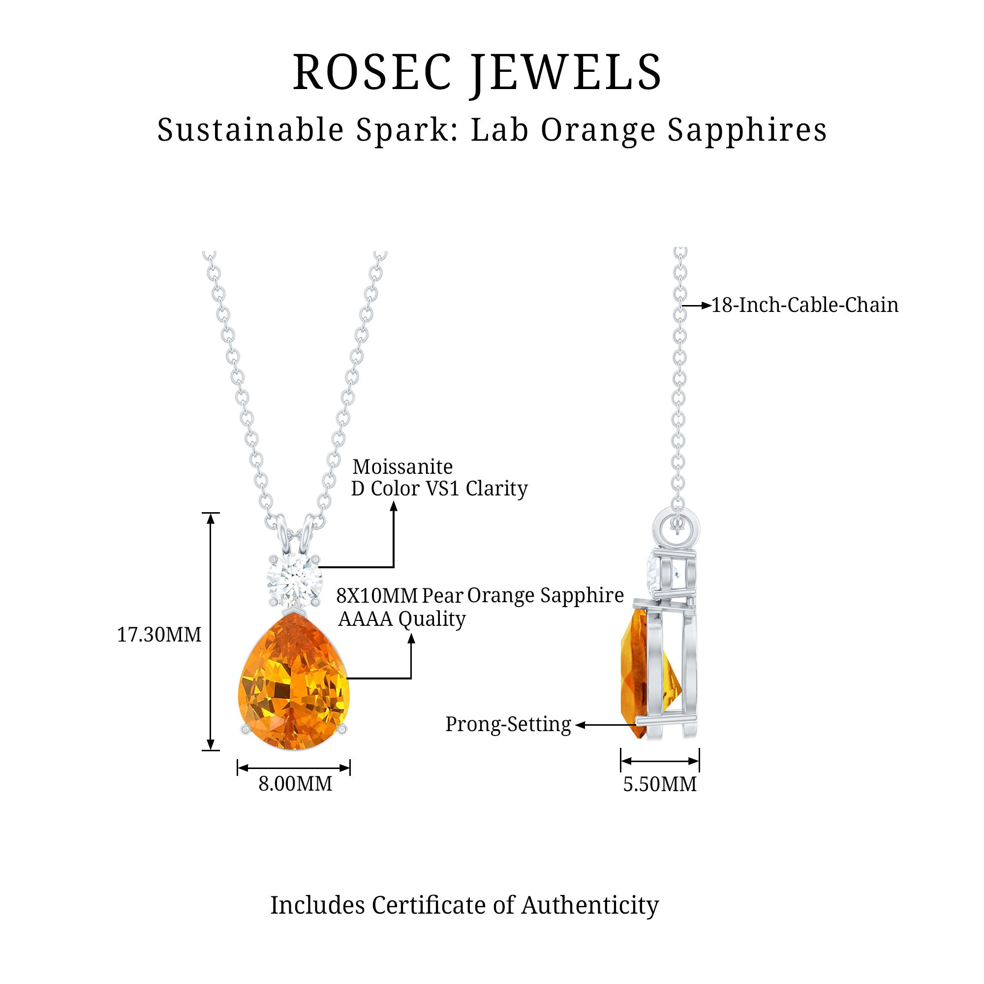 Give a graceful appeal to your look with this Teardrop Pendant Necklace crafted with Solid Metal. Adorned with Pear Cut Lab Created Orange Sapphire secured in Prong Setting while Round Cut Moissanite is studded on the top of it.