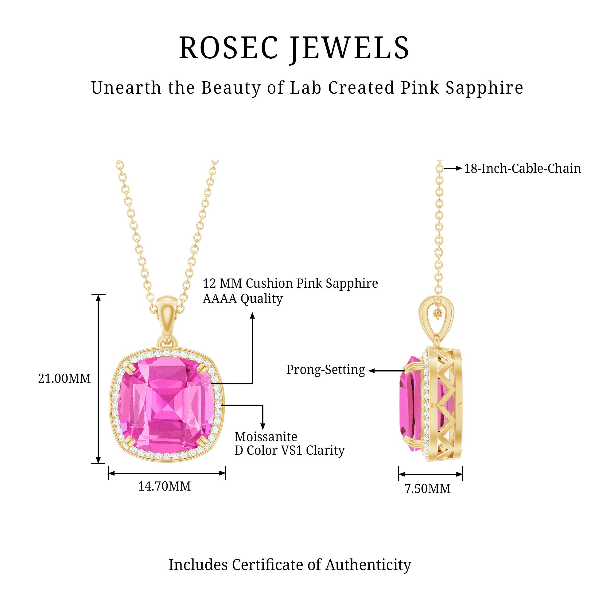 The Halo Pendant Necklace is alluring for anyone as it is adorned with Cushion Cut Lab Created Pink Sapphire secured in 4 Prong Setting while dainty Round Moissanite studded as Halo. Flaunt the Pendant Necklace with your beautiful outfits effortlessly to create unique looks. This Created Pink Sapphire Pendant makes a precious anniversary present for your lady love.
