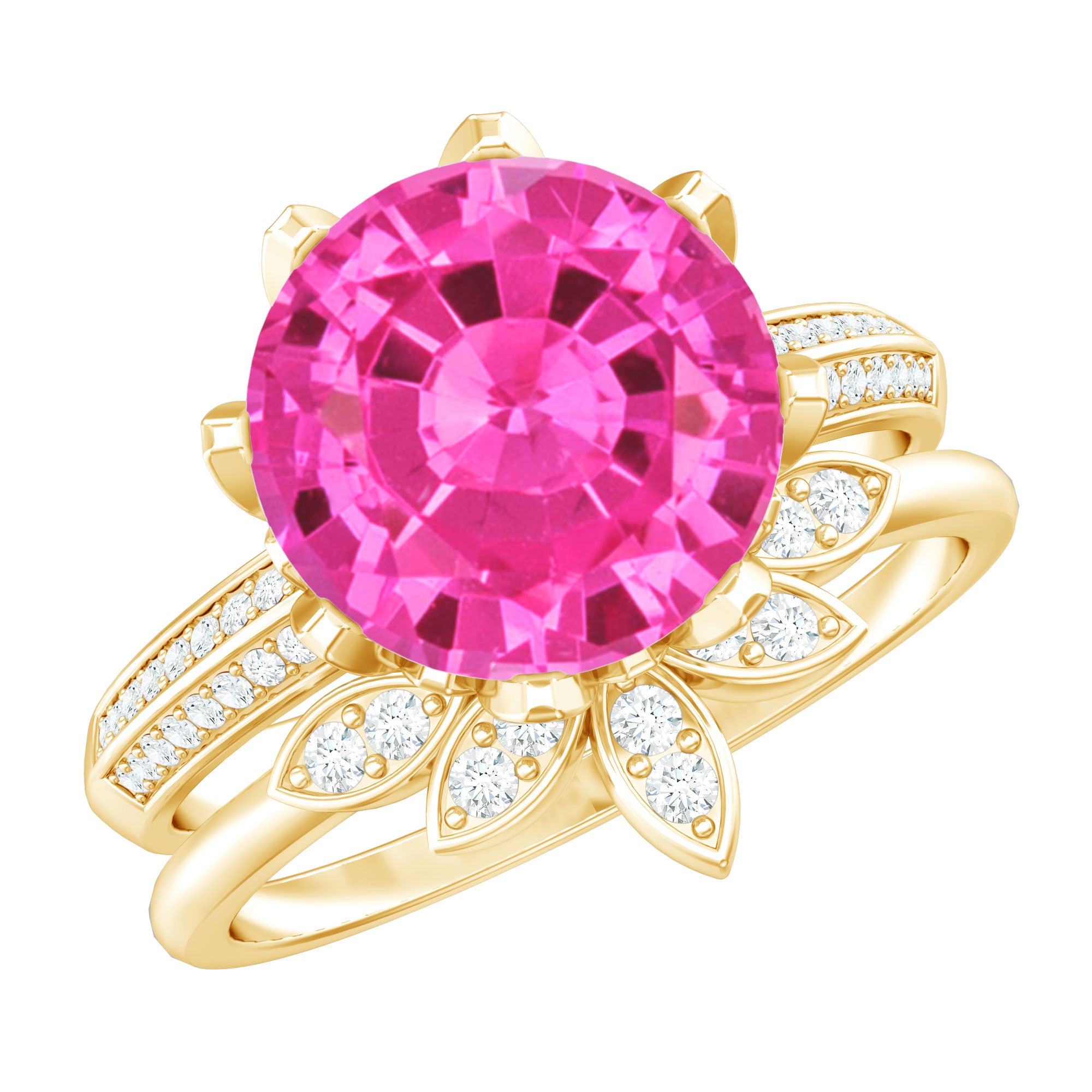 Capture the eternal beauty of love with this exquisite Lab Created Pink Sapphire Ring Set. The stunning set features a vibrant 10 mm Lab Created Pink Sapphire that sits amidst in the floral set. Embraced by delicate floral and leaf accents, creating a uniquely elegant and vintage inspired design. Crafted with precision and attention to detail, this Lab Sapphire Engagement Ring Set with timeless beauty symbolizes love and commitment, making it a perfect choice for an engagement or wedding set. Whether you are celebrating a new chapter in your love story or reaffirming your commitment, this Lab Sapphire Wedding Engagement Ring Set is a beautiful expression of your devotion. Designed to stand the test of time, this Floral Wedding Ring Set with Leaf Band is an enchanting symbol of their enduring love.